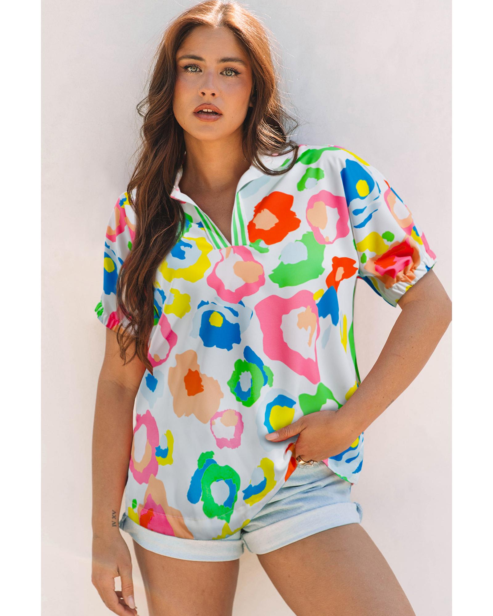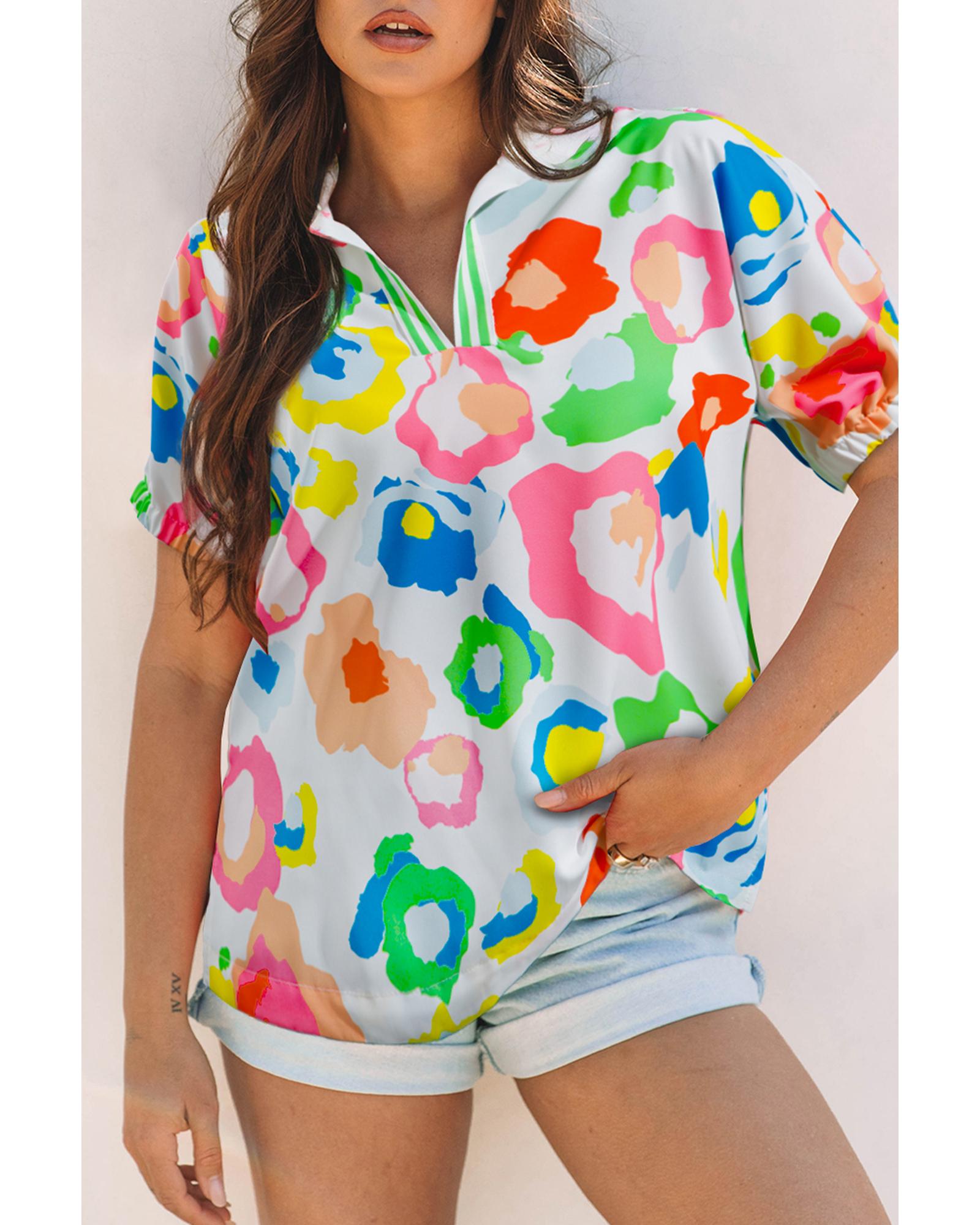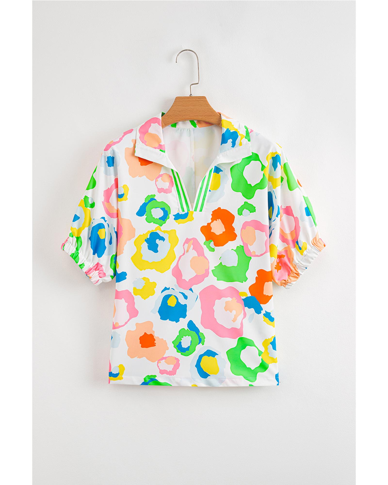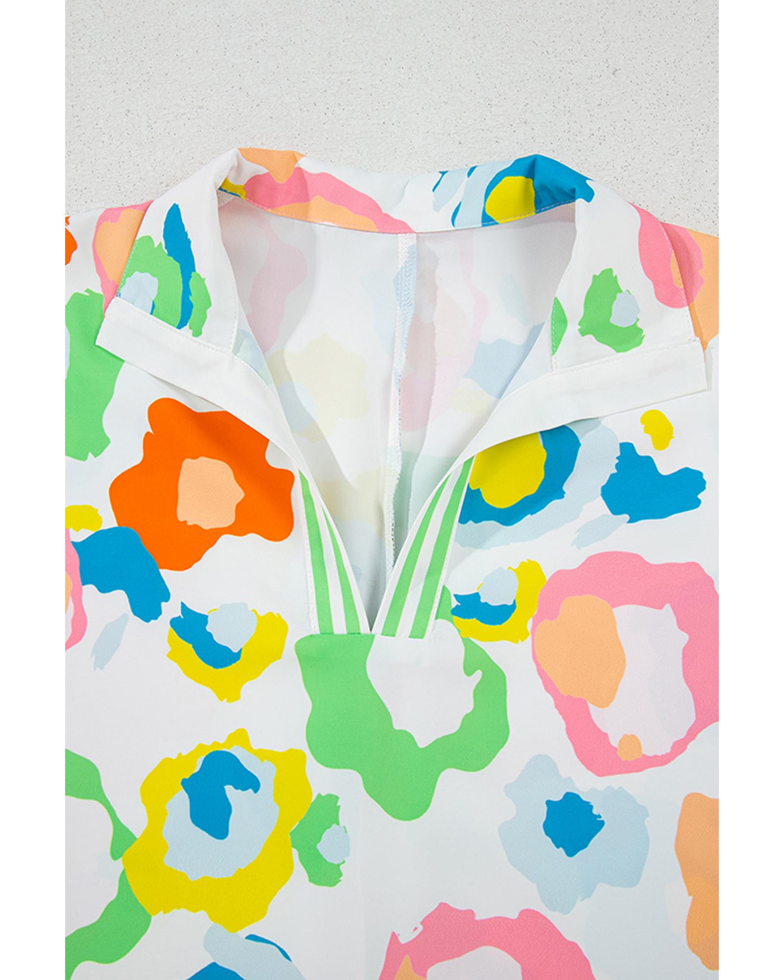 Green Chic Leopard Print Striped Detail Split Neck Blouse – L