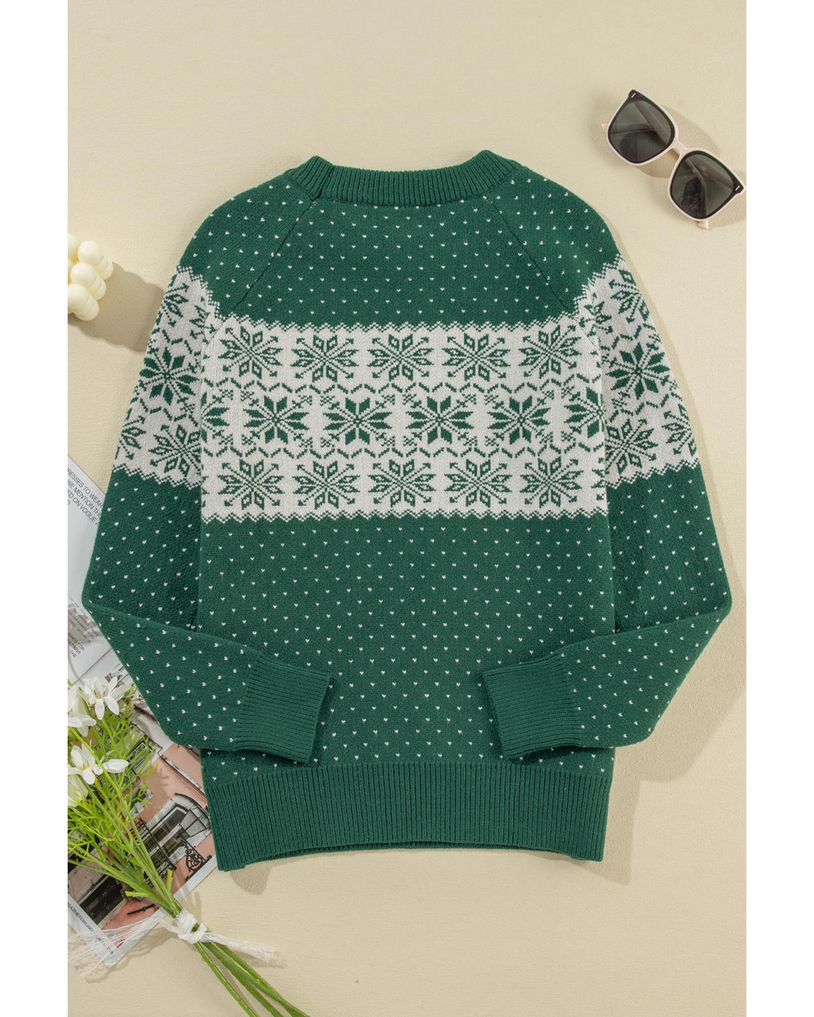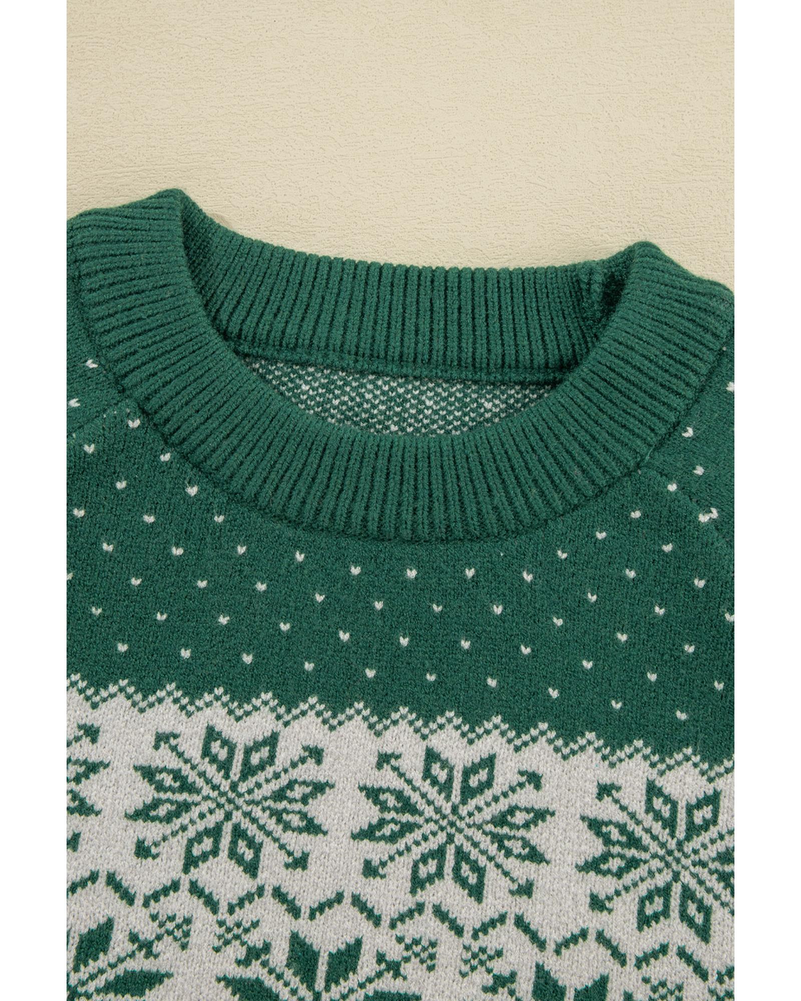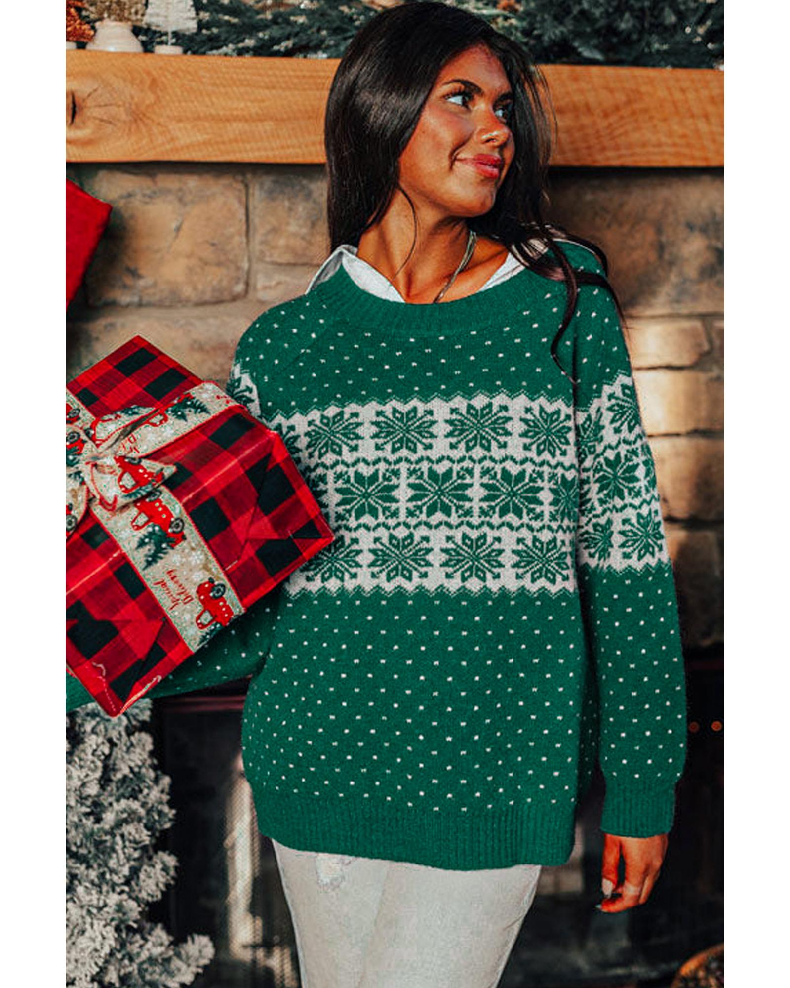 - Green Christmas Snowflake Dotted Print Round Neck Sweater