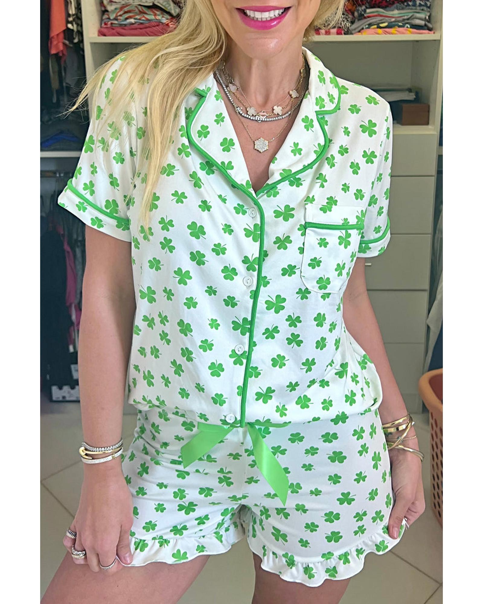 Green Clover Printed Short Sleeve and Ruffled Shorts Pajama Set - S
