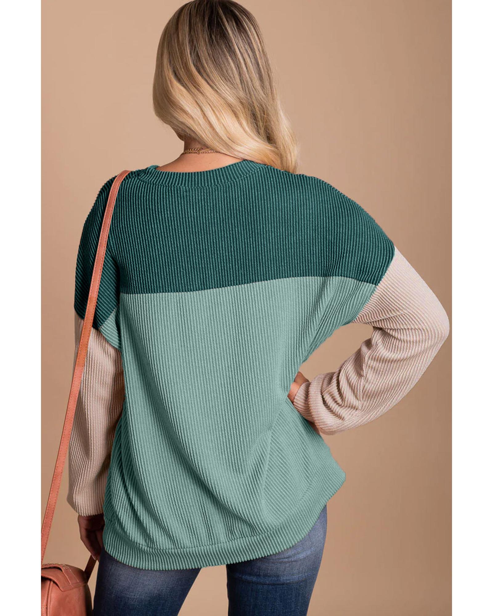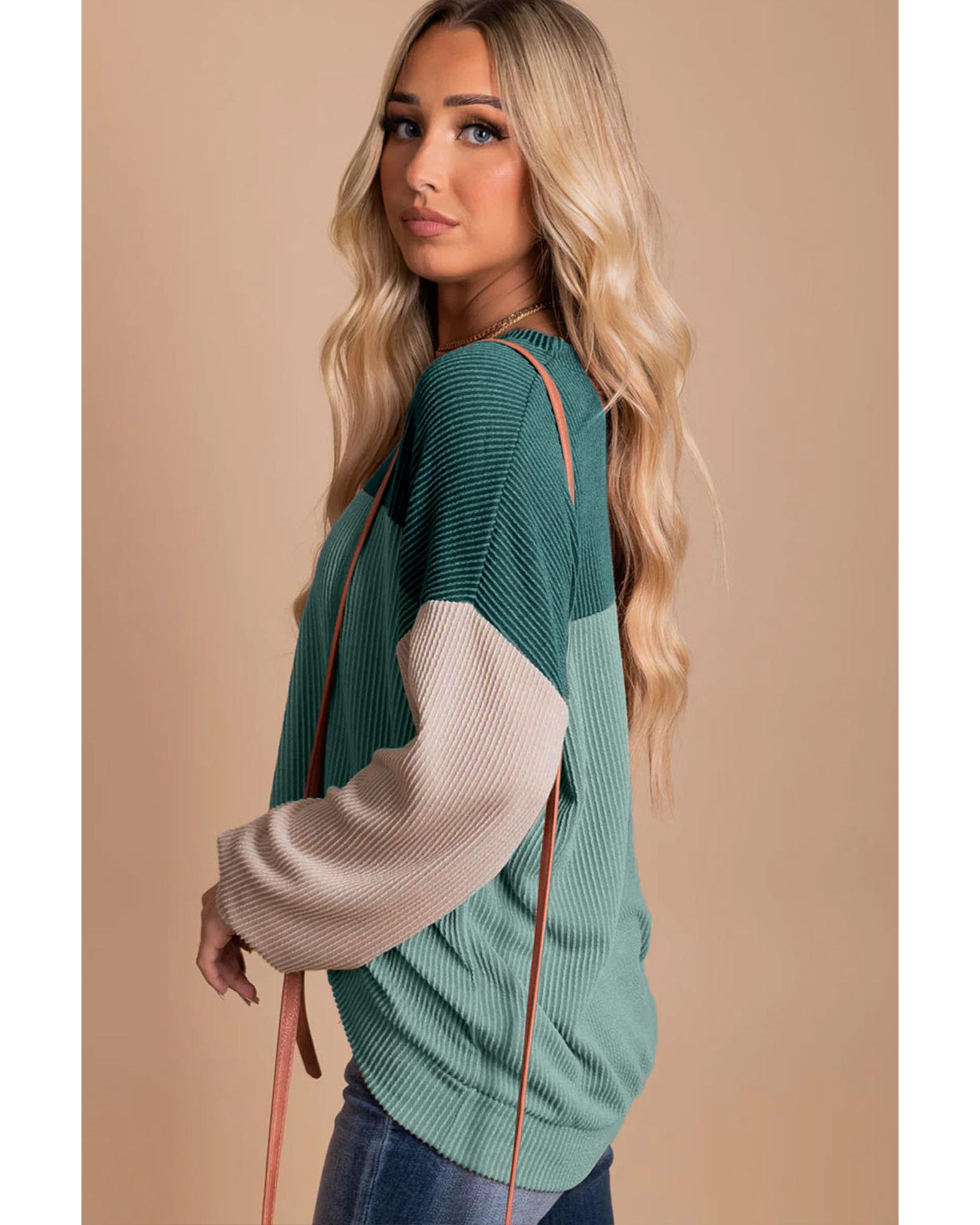 Green Color Block Long Sleeve Ribbed Loose Top – M