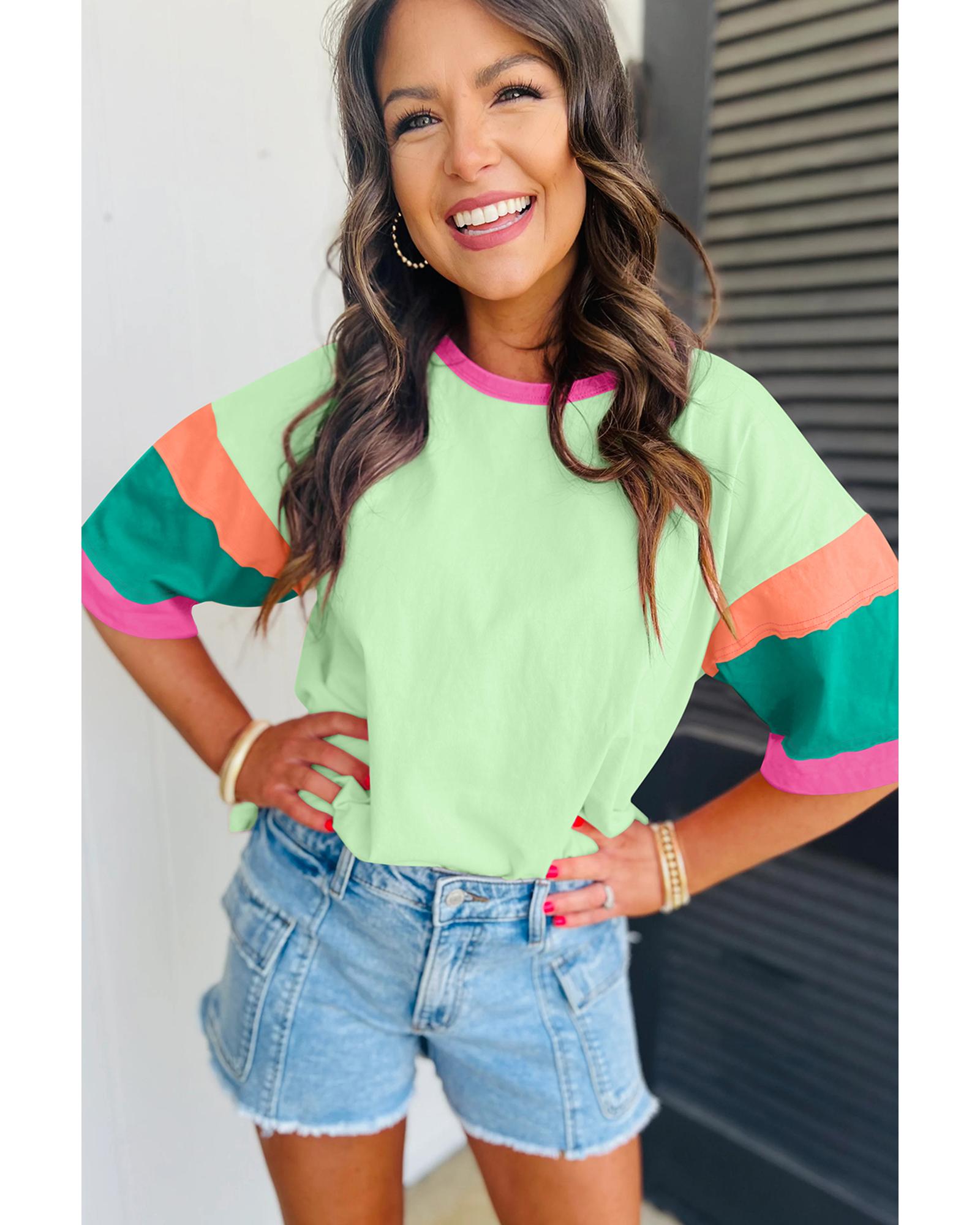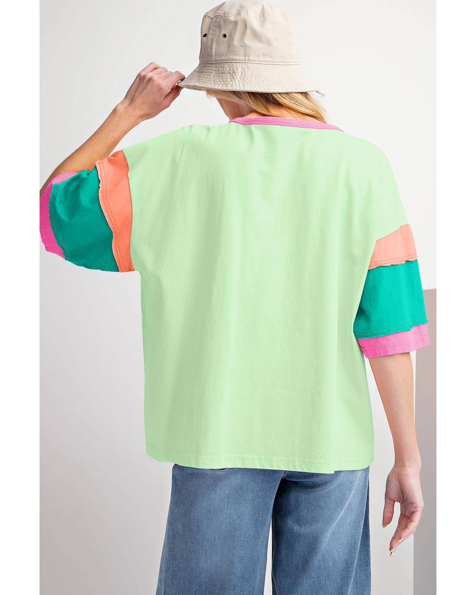 Green Color Block Stitching Sleeve Round Neck Oversize Top – S