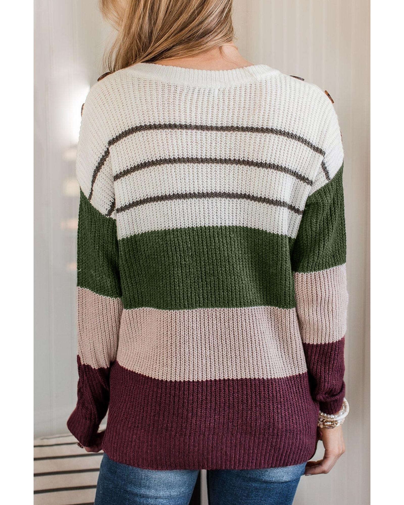 Green Color Block Striped Buttoned Shoulder Split Sweater – S