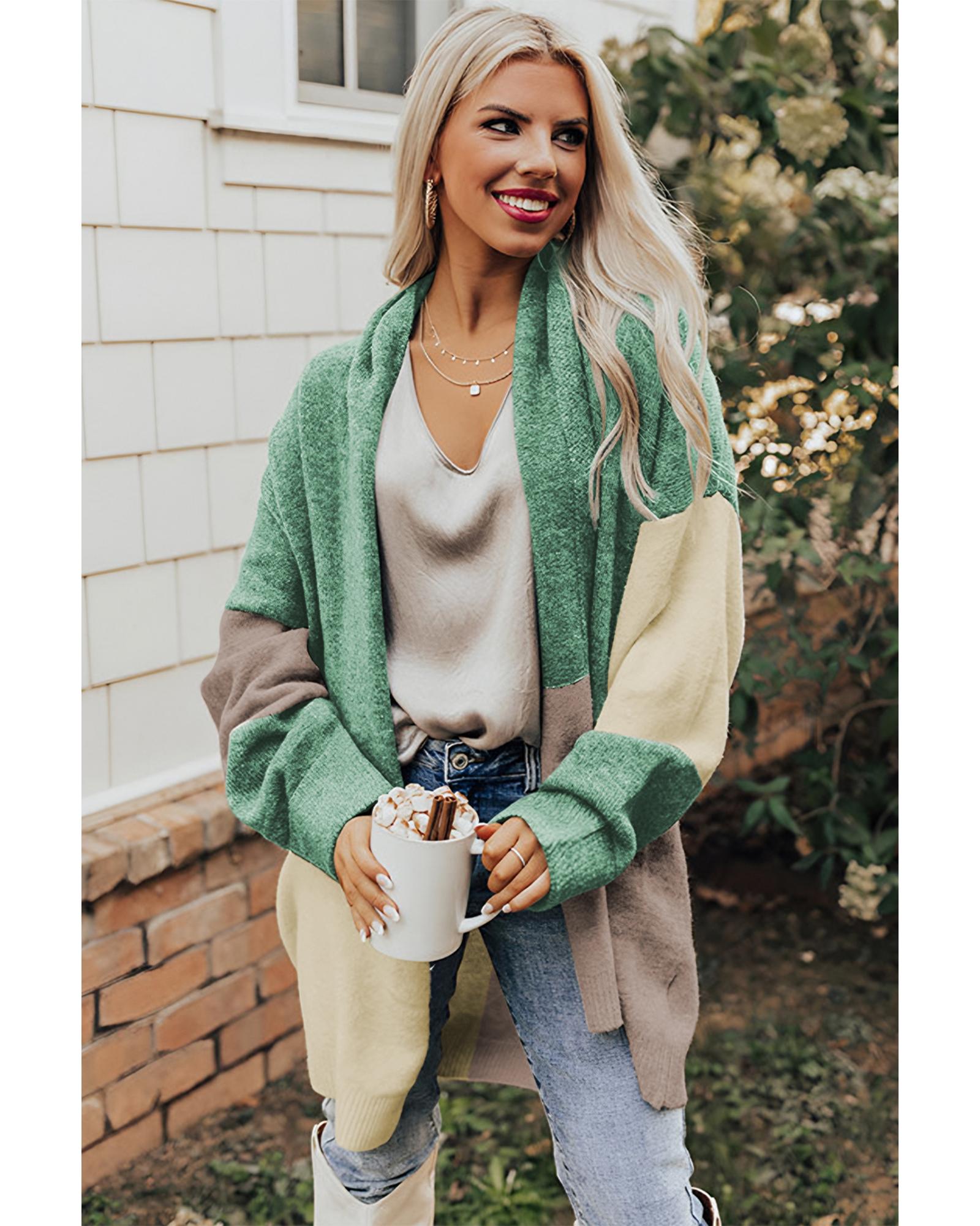 Green Colorblock Draped Open Front Chunky Cardigan – M