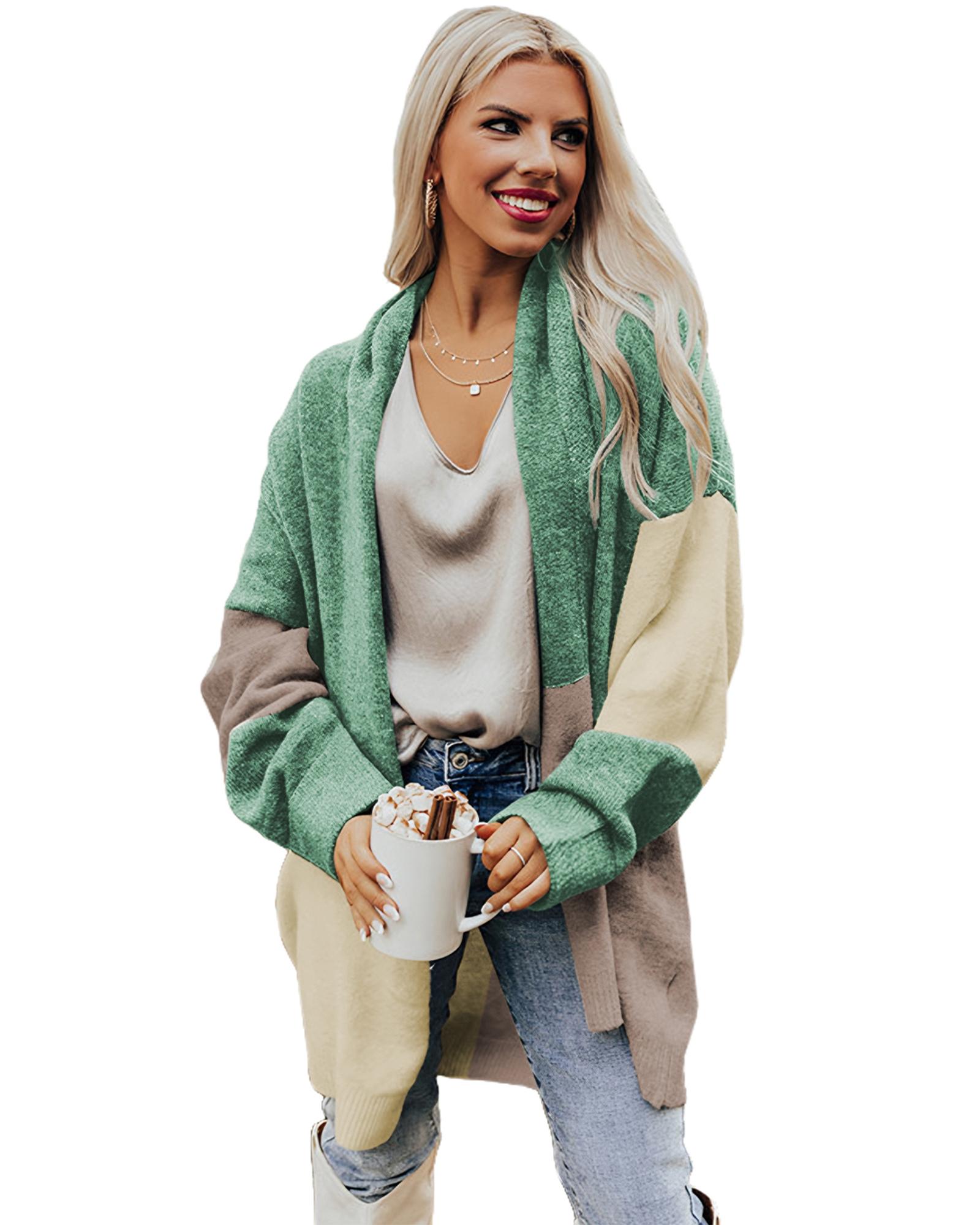 Green Colorblock Draped Open Front Chunky Cardigan – S