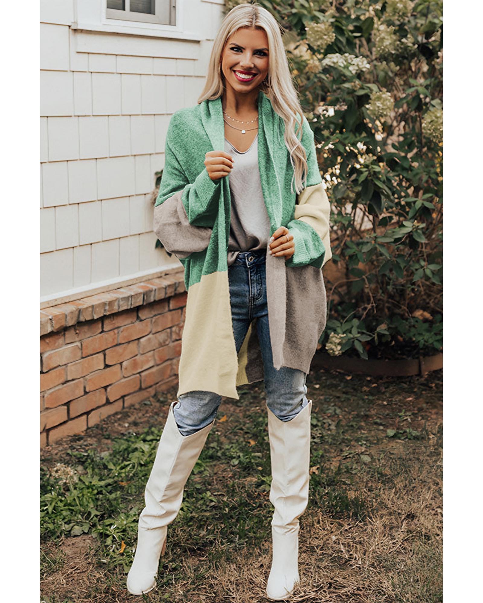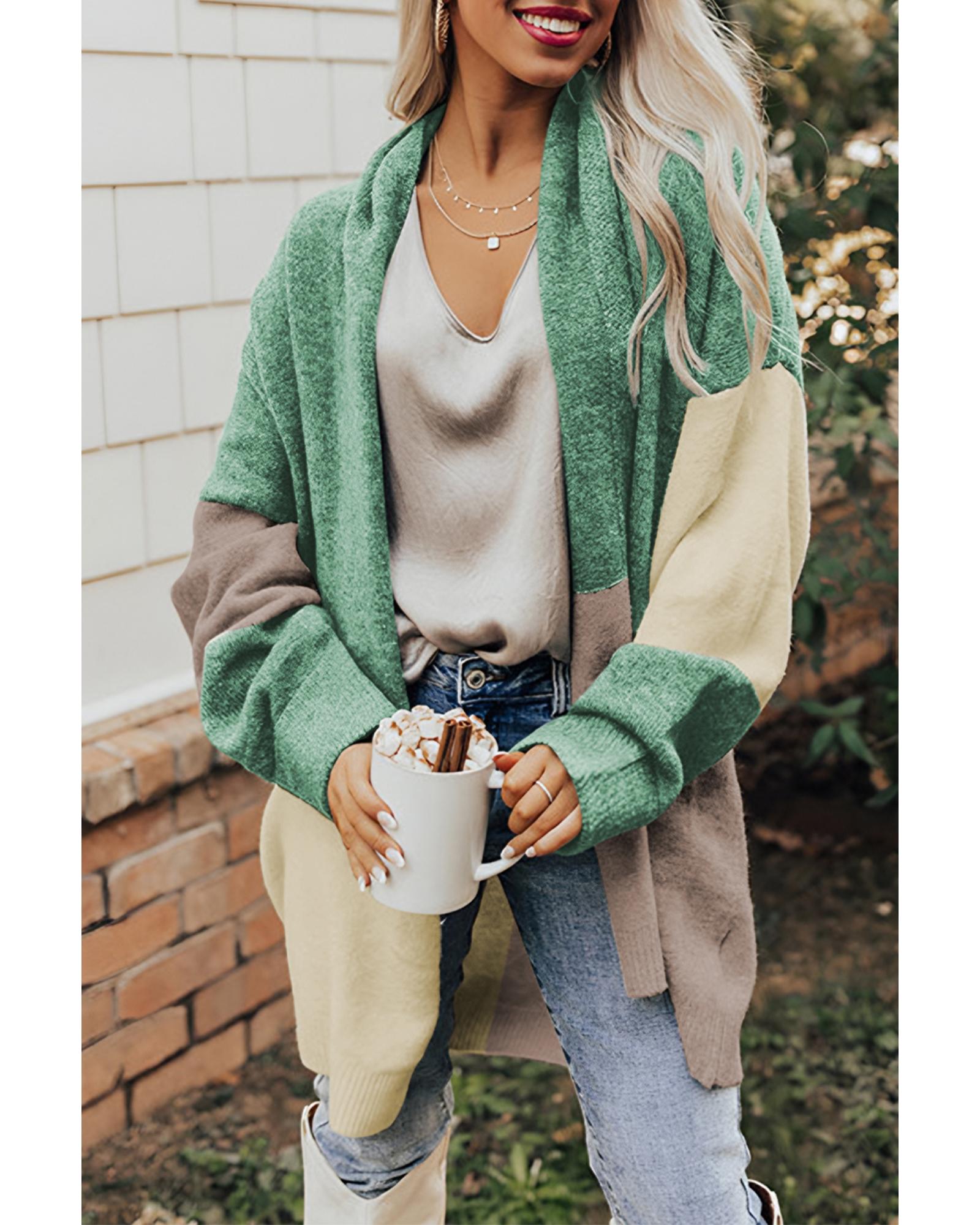 Green Colorblock Draped Open Front Chunky Cardigan – XL