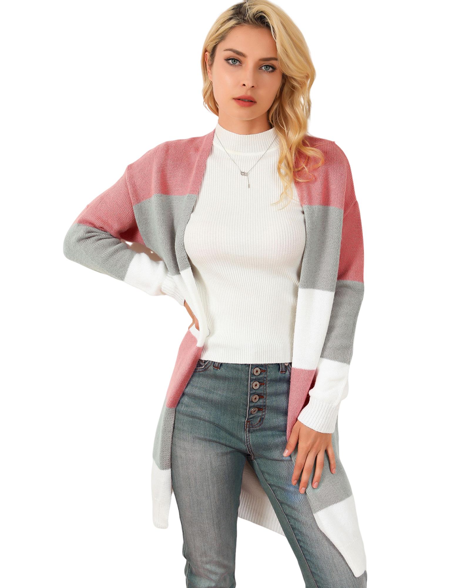 Super cute sweater with colorblock stripes Open - front design with dropped shoulder for a casual look Long relaxed silhouette for easy pairing with fall and winter outfits Made from soft woolen knit for comfort and warmth Available in various sizes