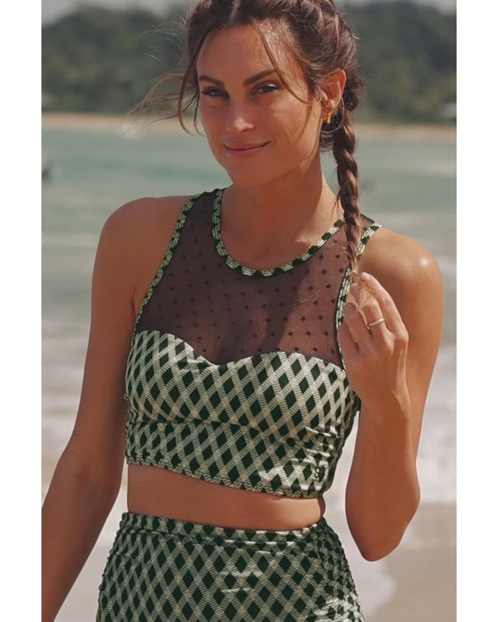 Green Dotted Mesh Plaid Patchwork High Waisted Bikini – M
