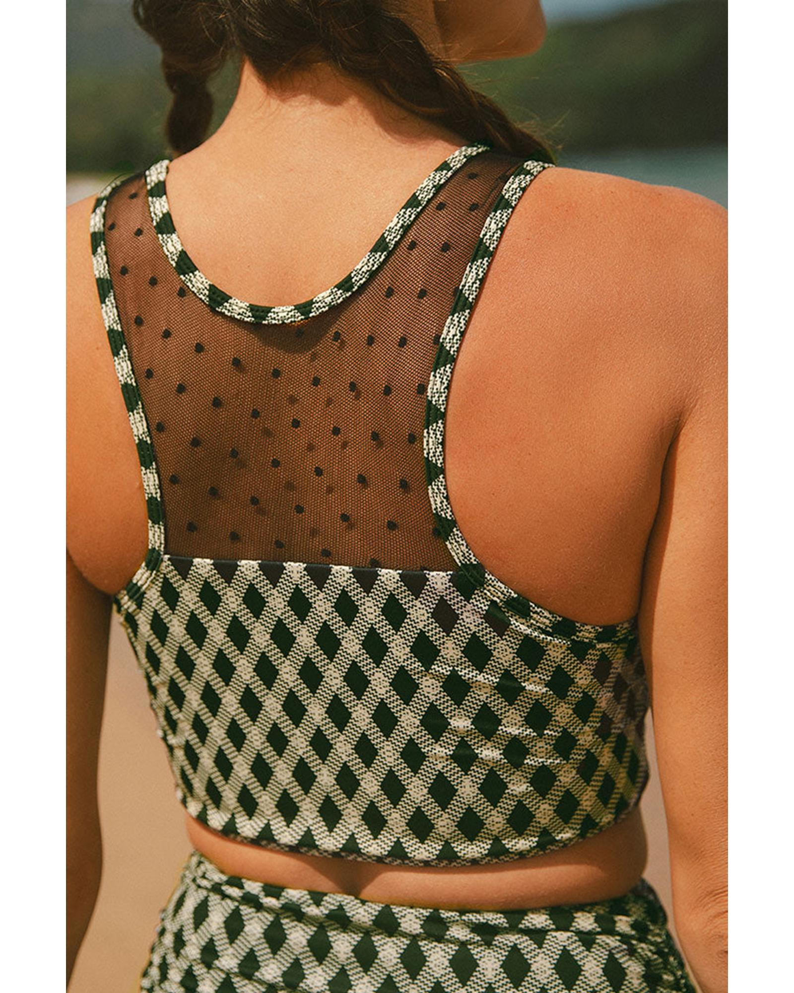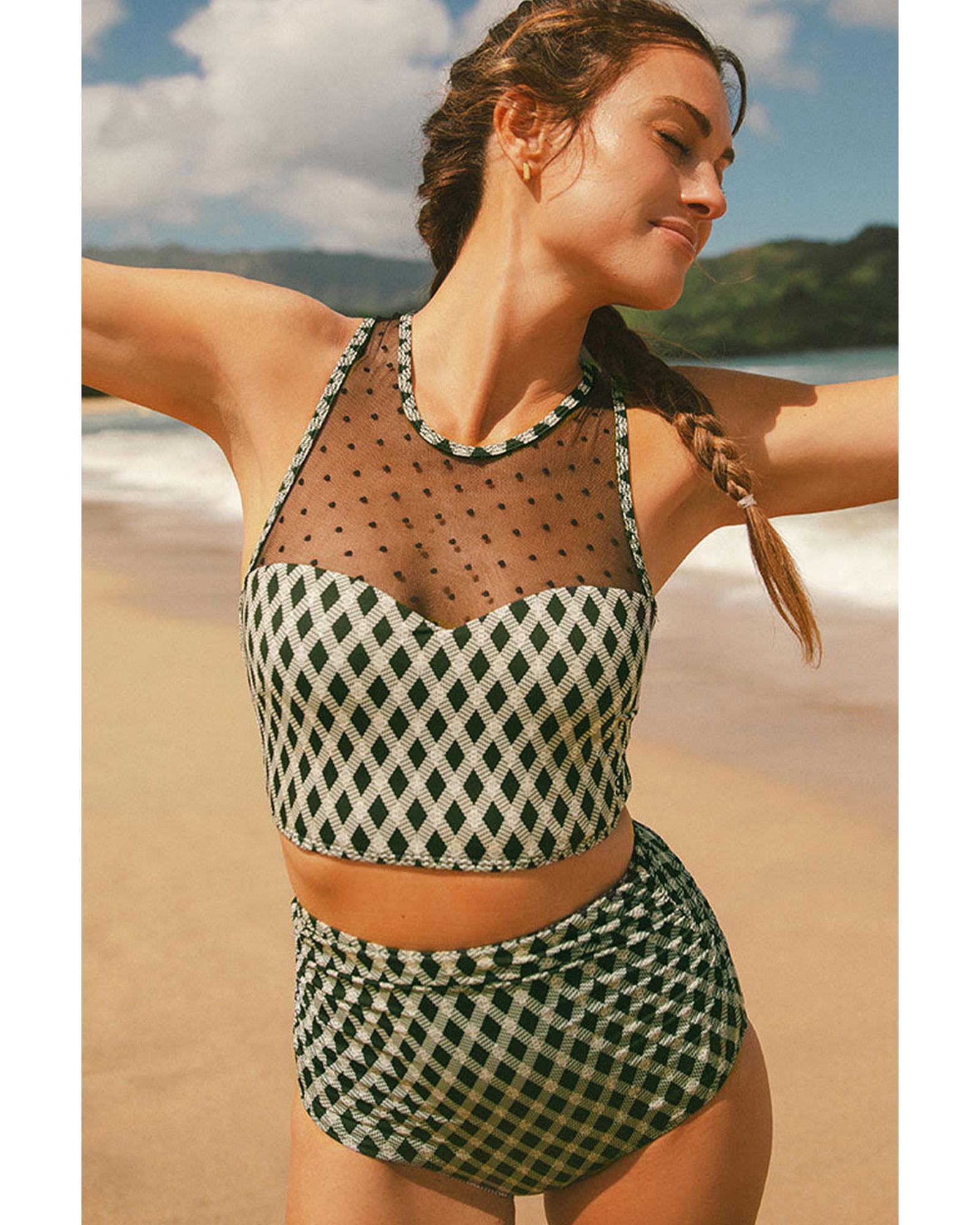 Green Dotted Mesh Plaid Patchwork High Waisted Bikini – S