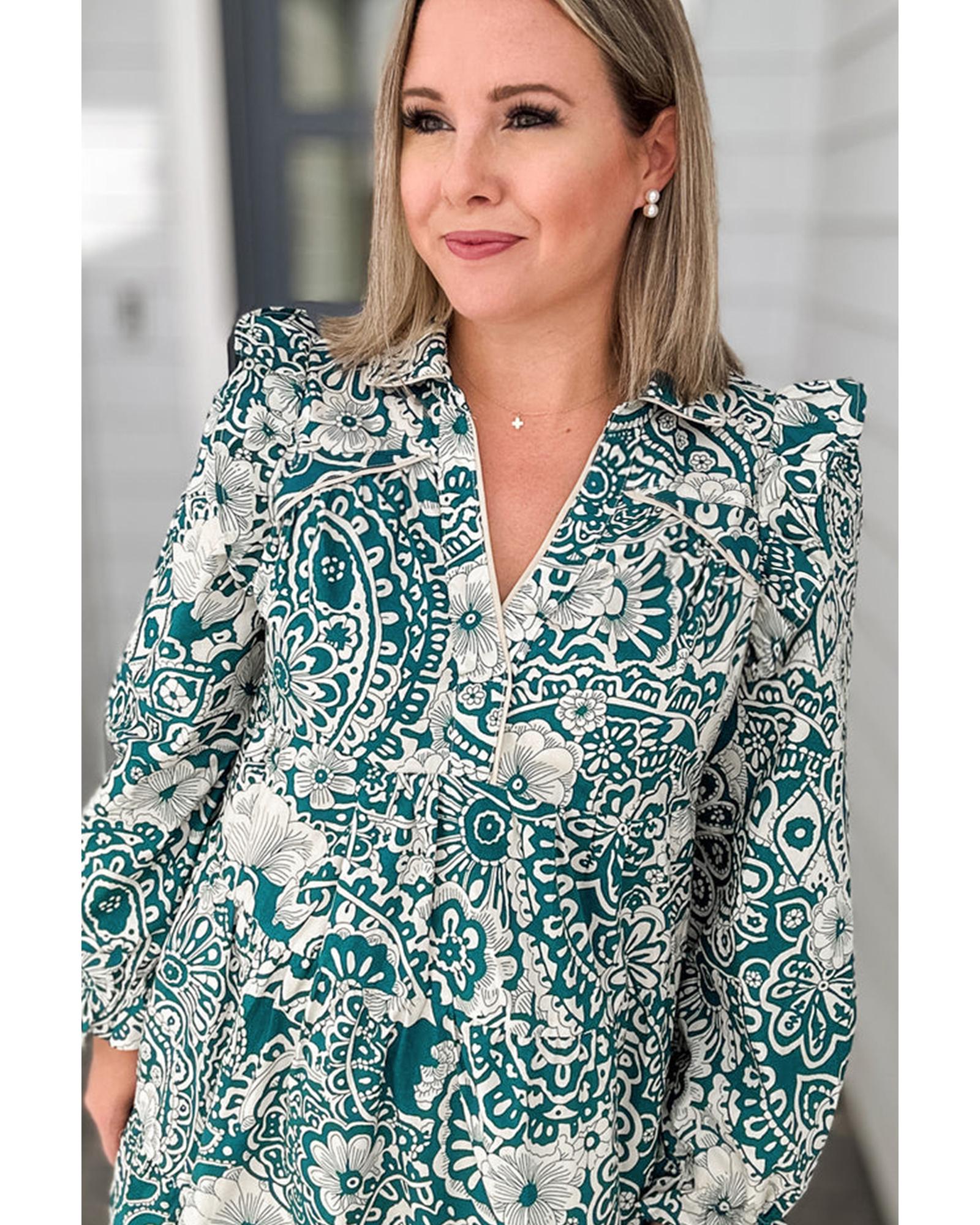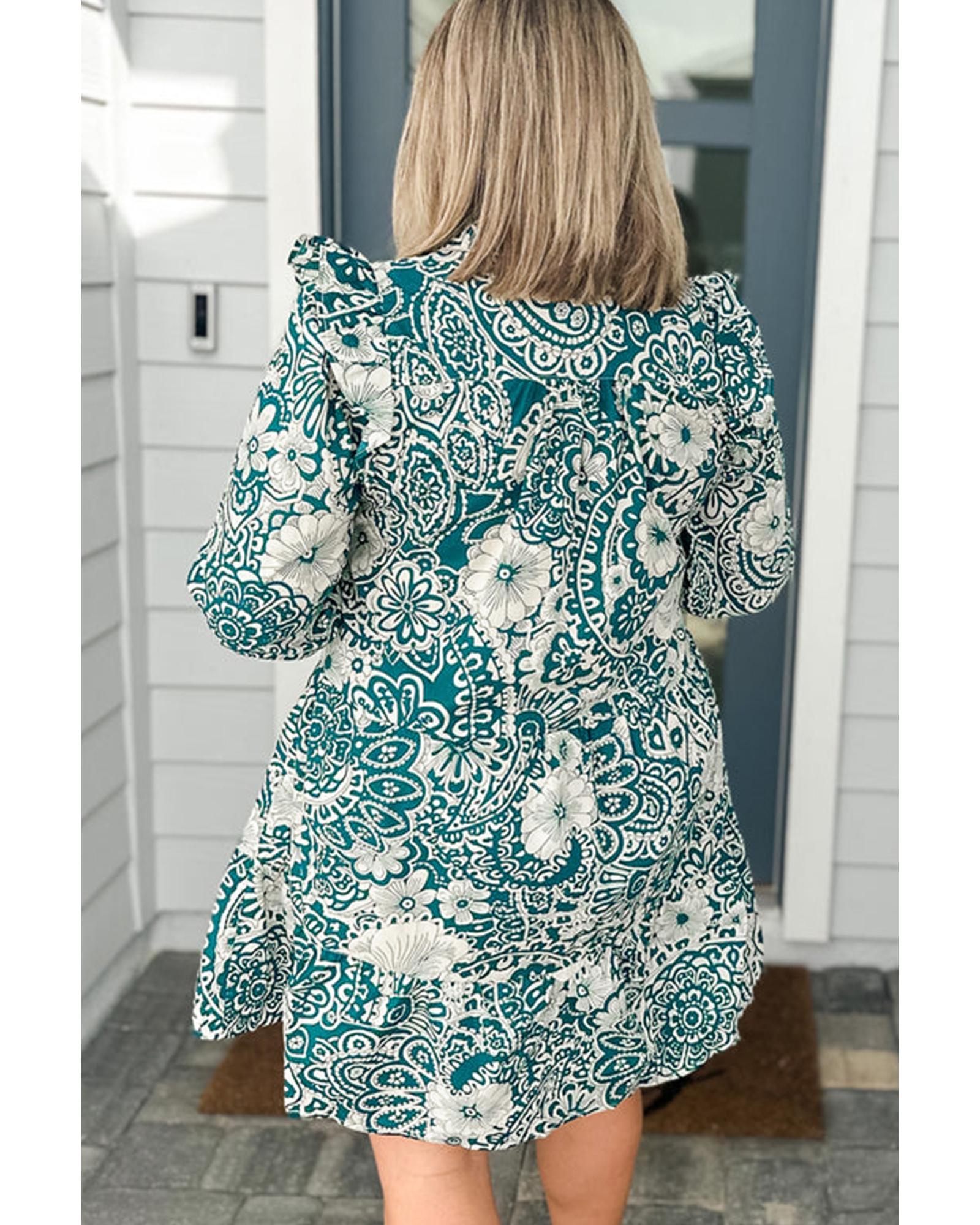 Green Floral Flounce Sleeve Split Neck Plus Size Dress – 1X