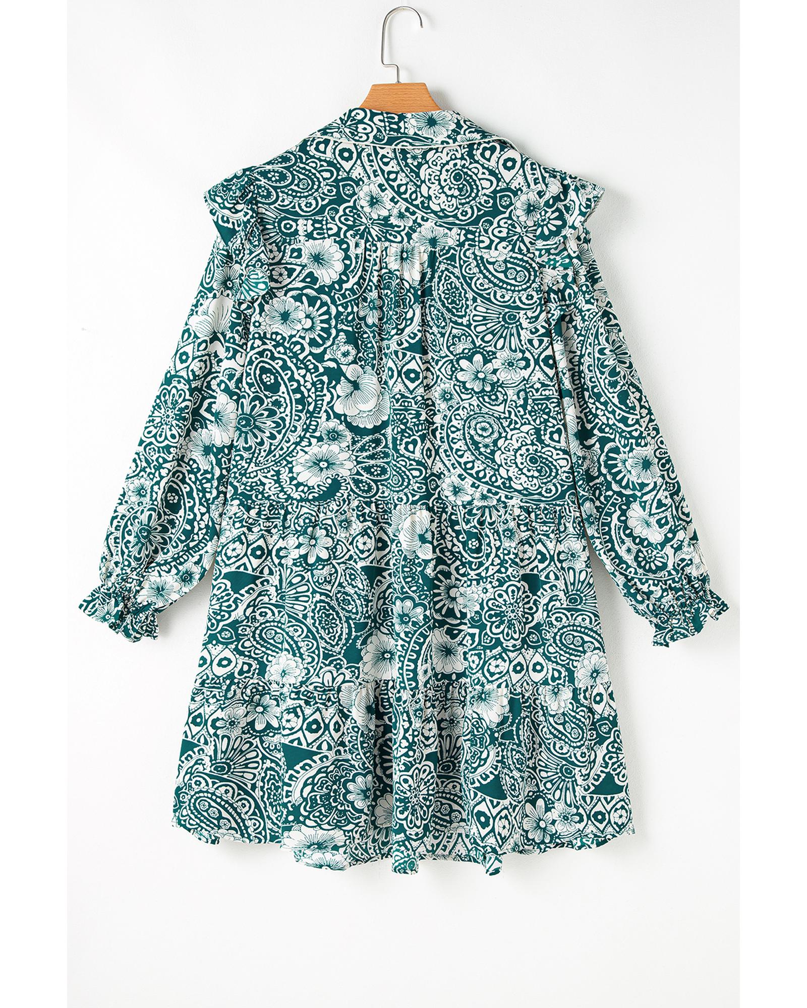 - Green Floral Flounce Sleeve Split Neck Plus Size Dress