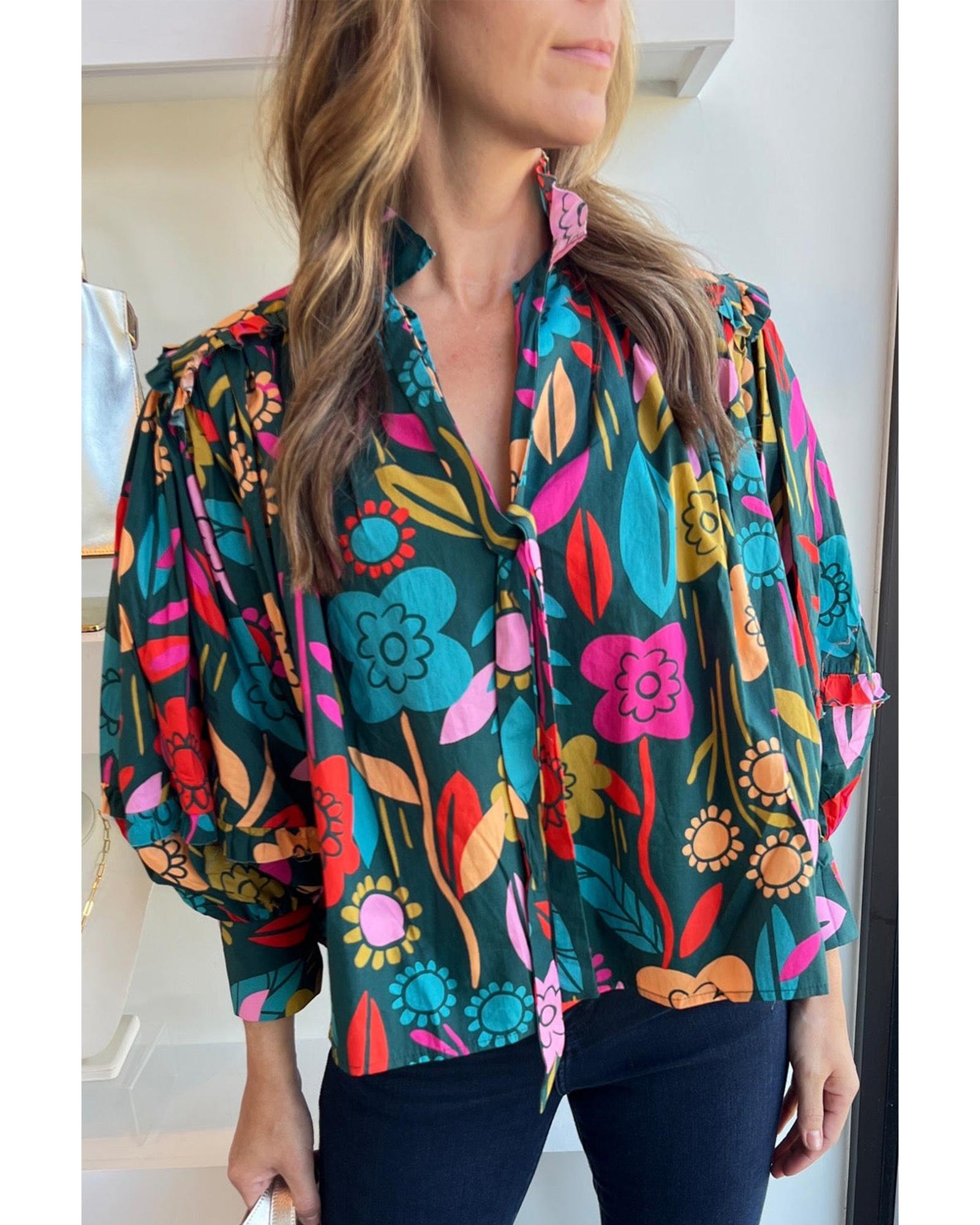 Green Floral Knot Split Neck Puff Sleeve Blouse – XL