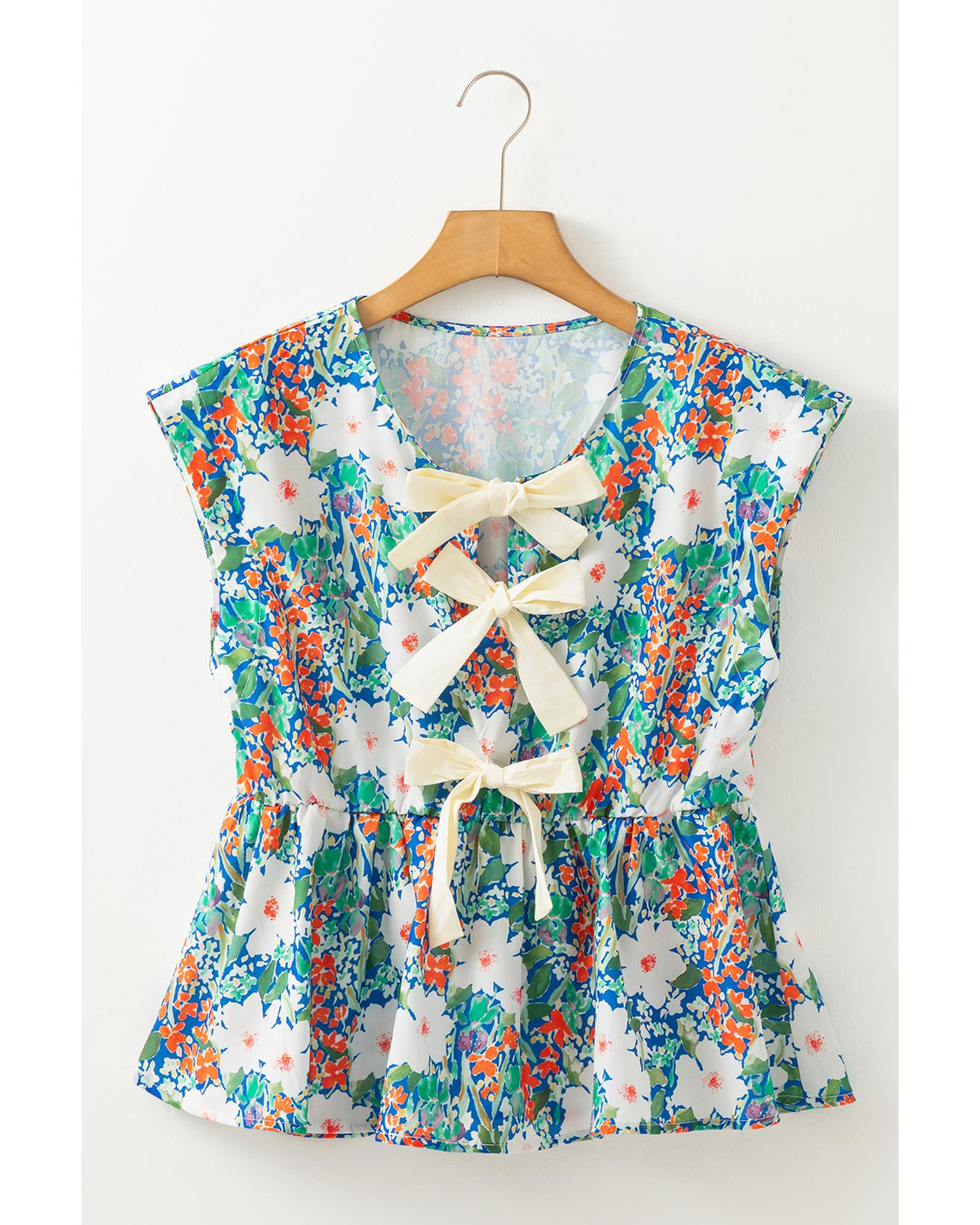 Green Floral Print Bow Applique Slit Sleeveless Peplum Blouse – L