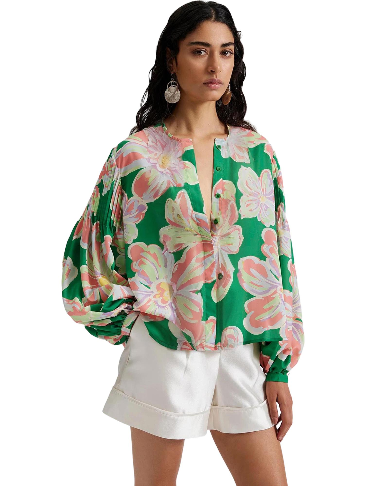 Green Floral Print Button up Pleated Puff Sleeve Loose Shirt – L