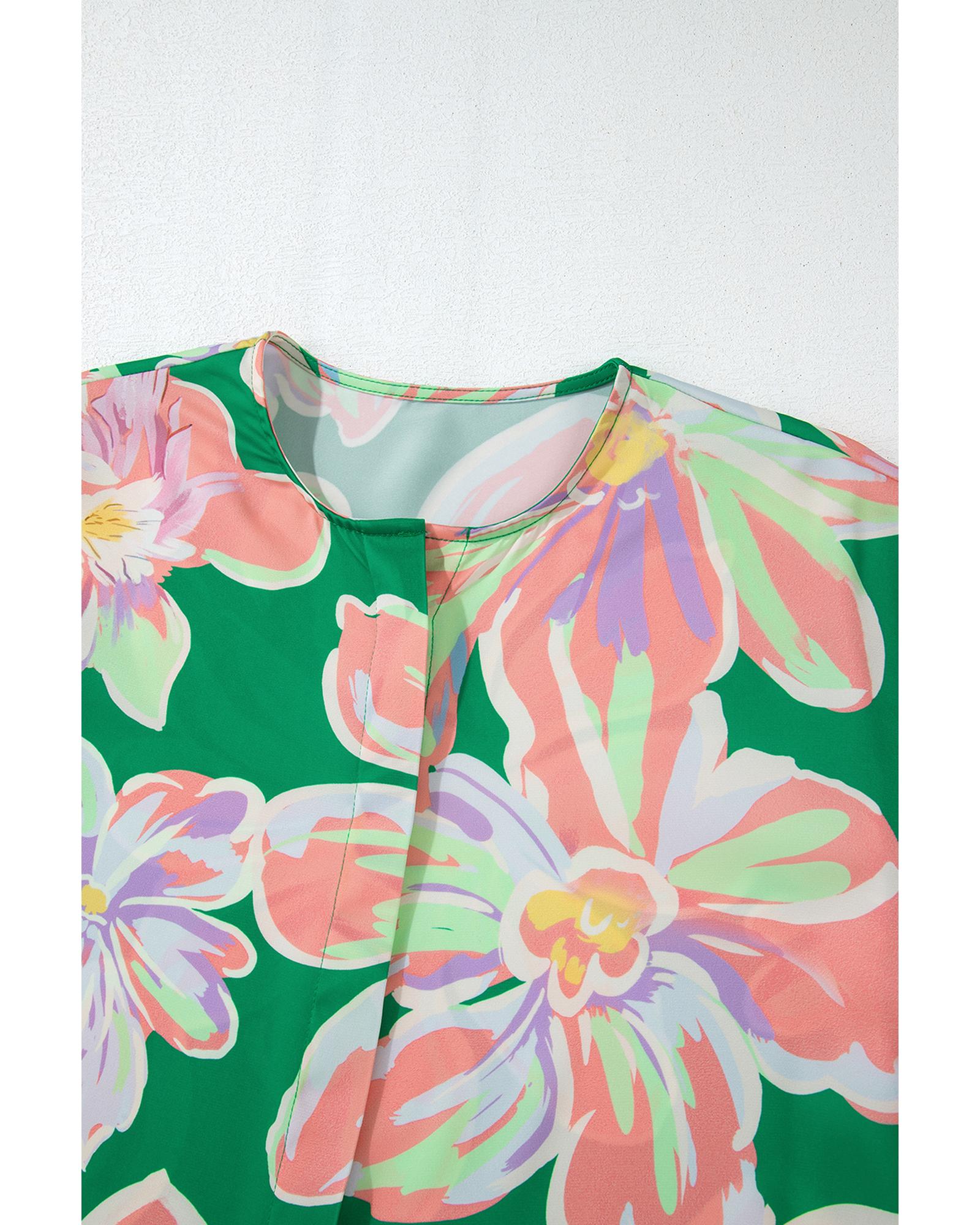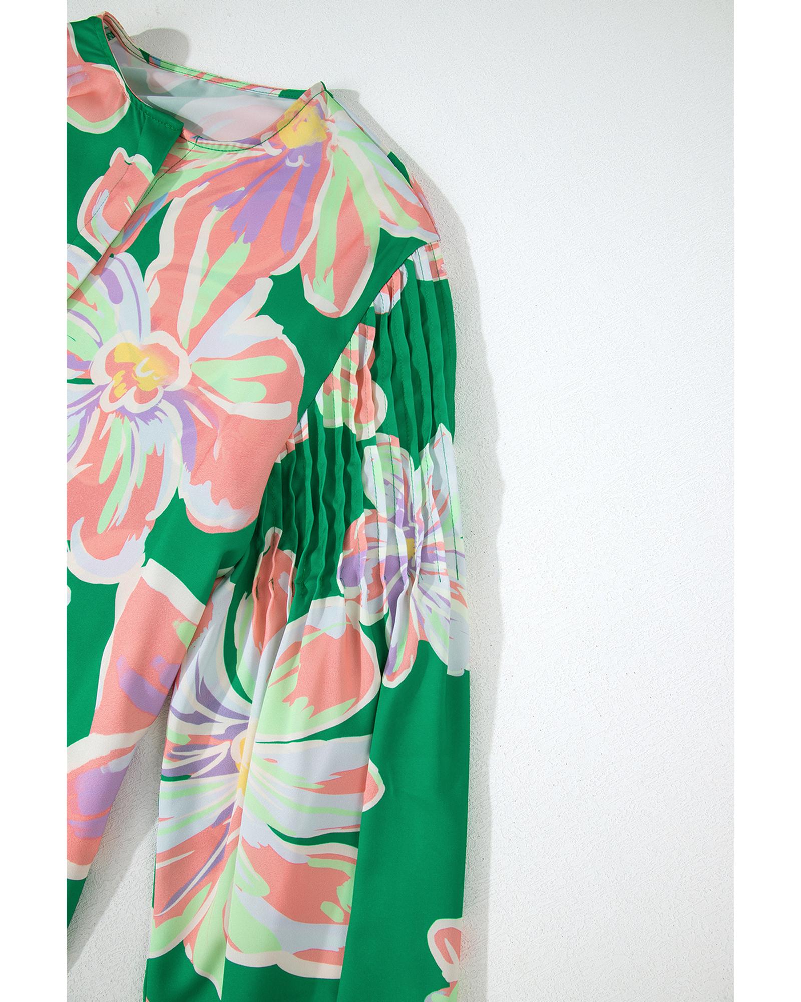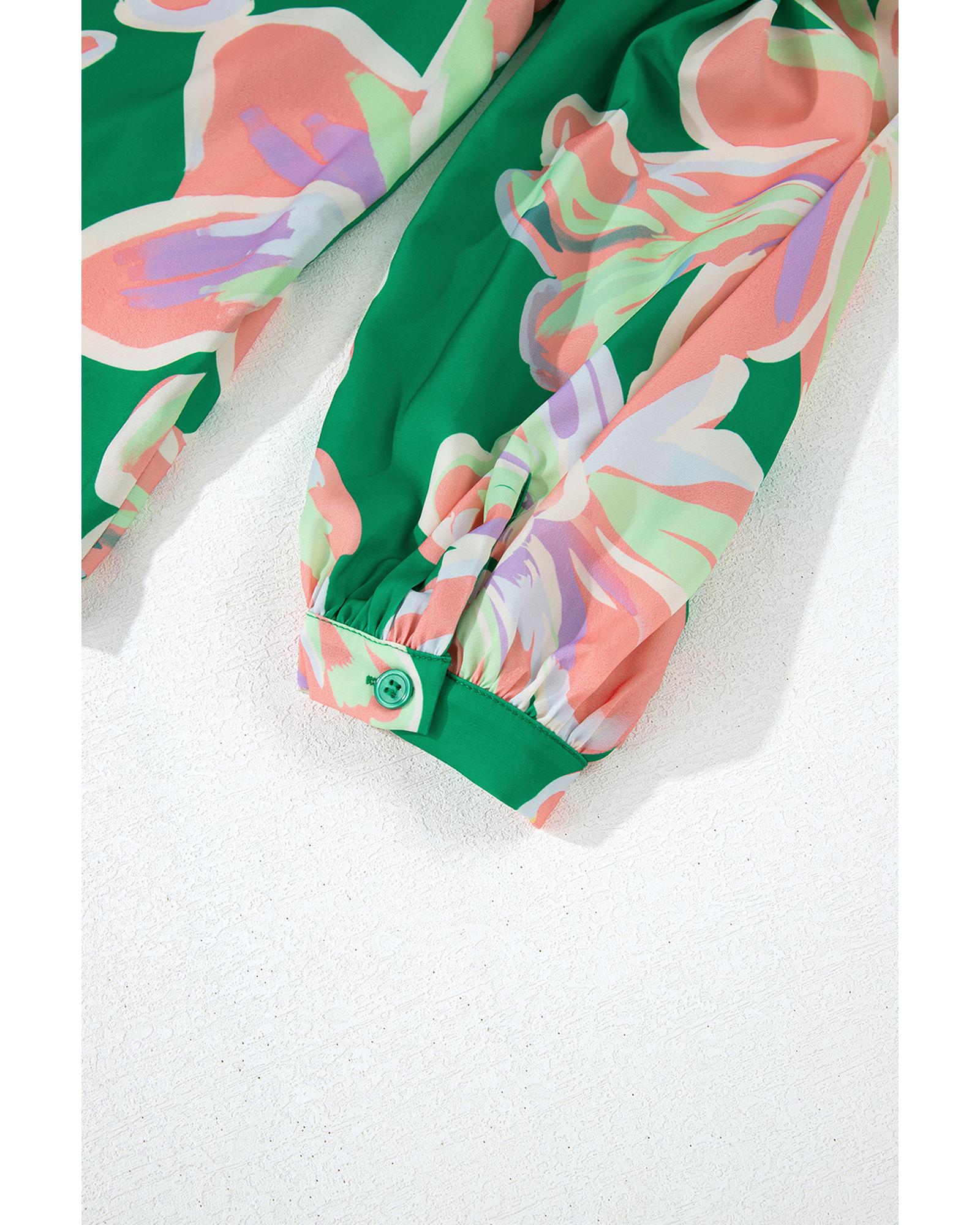 Green Floral Print Button up Pleated Puff Sleeve Loose Shirt - S