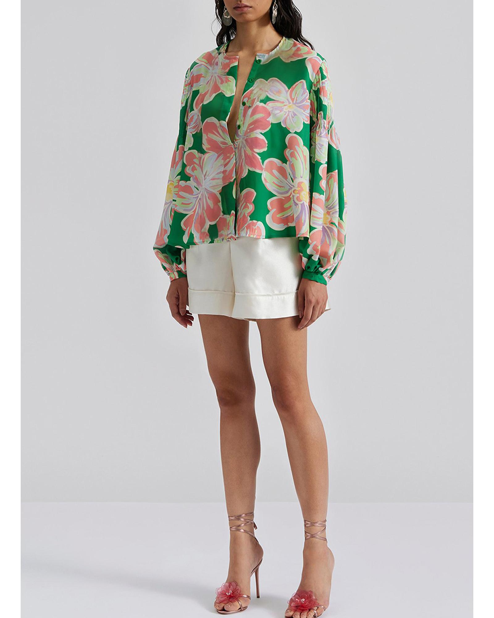 Green Floral Print Button up Pleated Puff Sleeve Loose Shirt - S Original price was: $68.99.Current price is: $36.99.