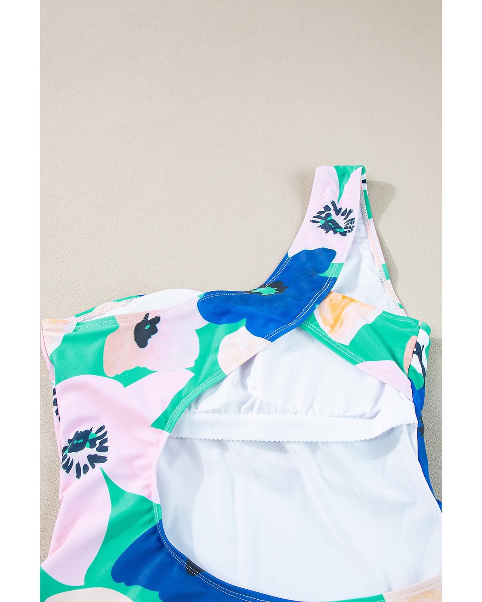 Green Floral Print Ruched Cut Out One Shoulder Monokini – M
