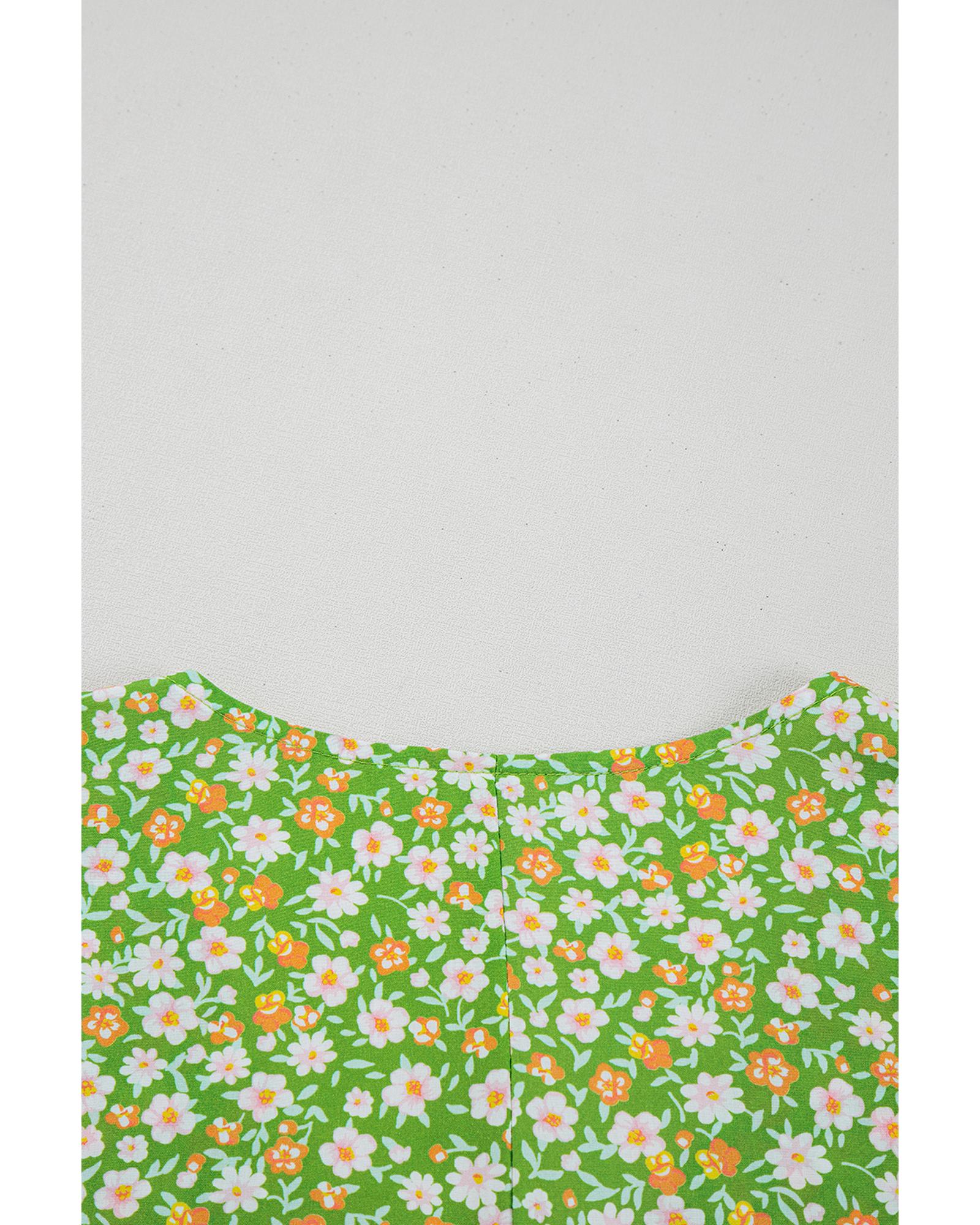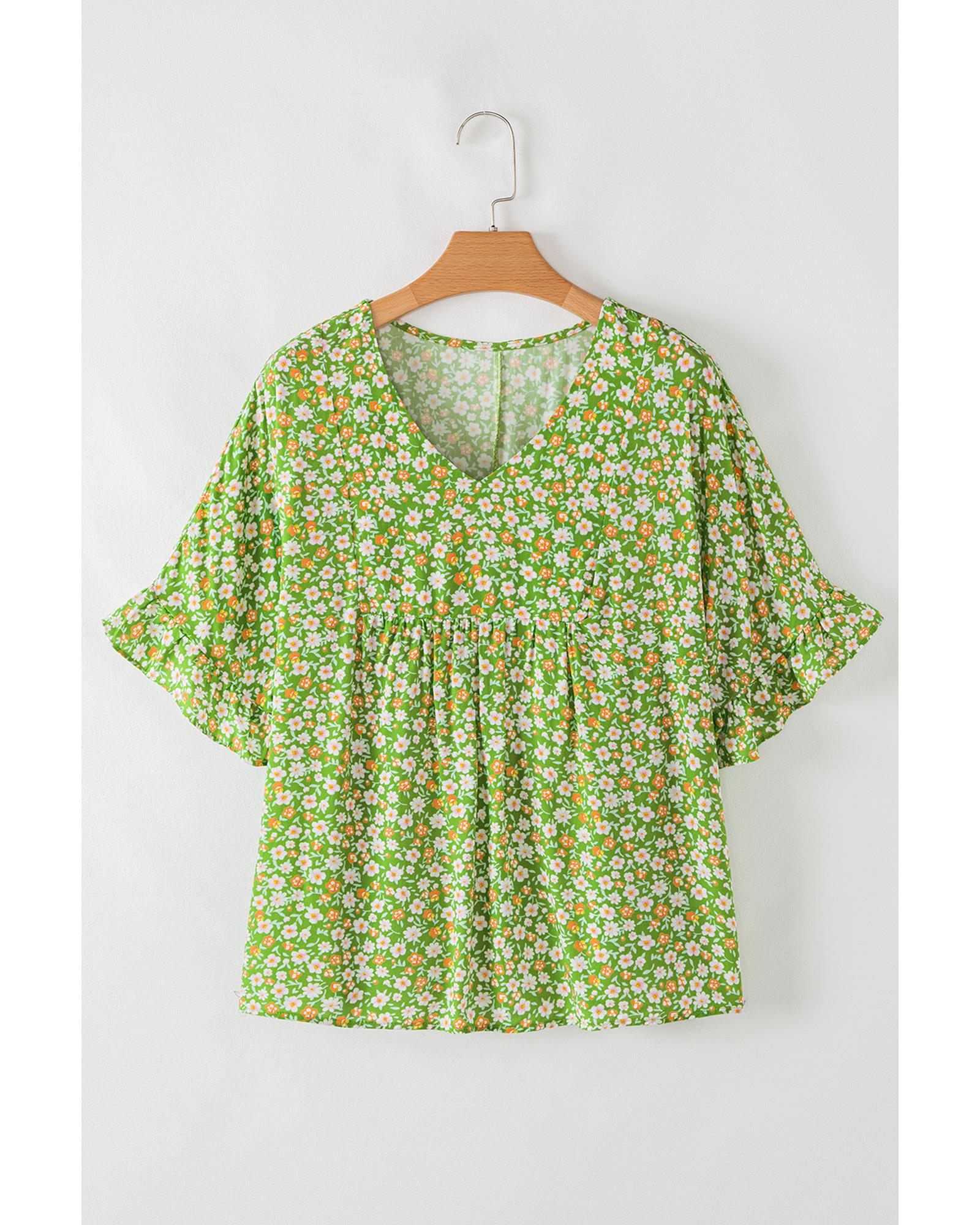 Green Floral Print Ruffle Sleeve V Neck Blouse Top – M