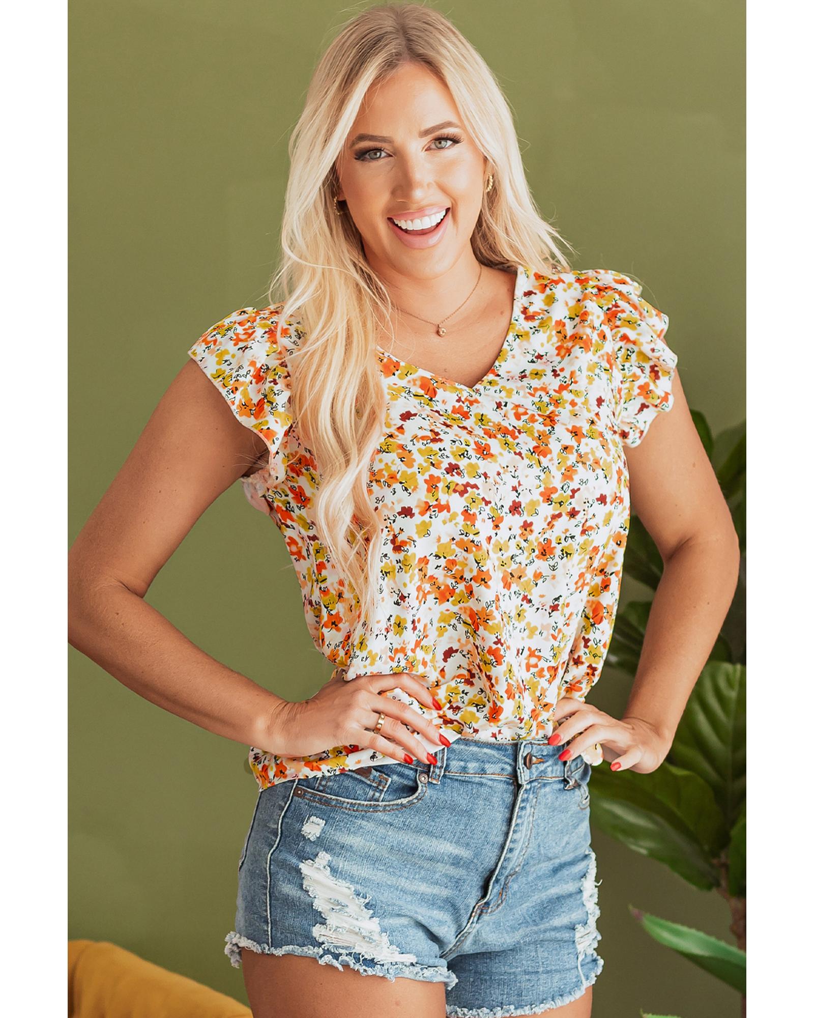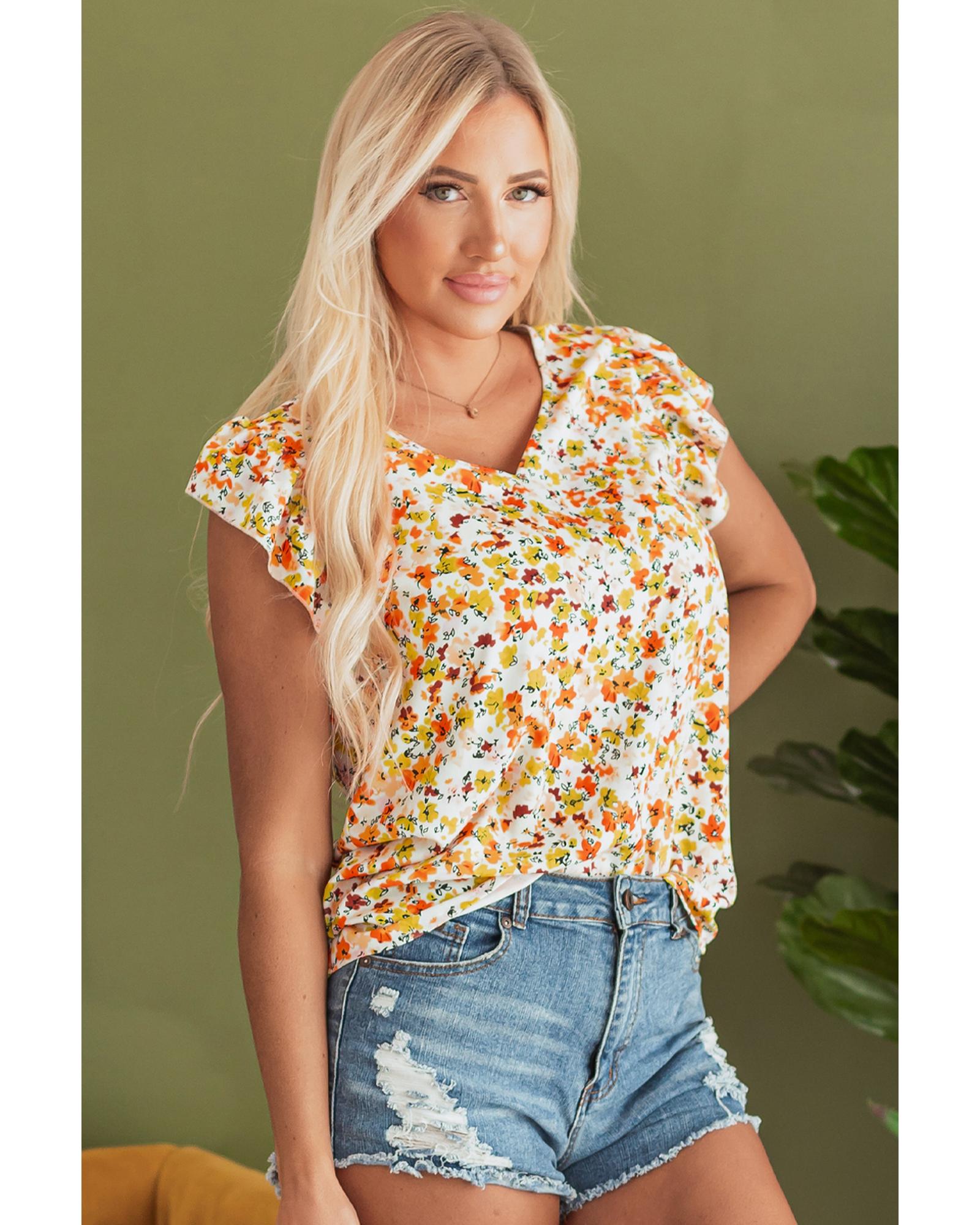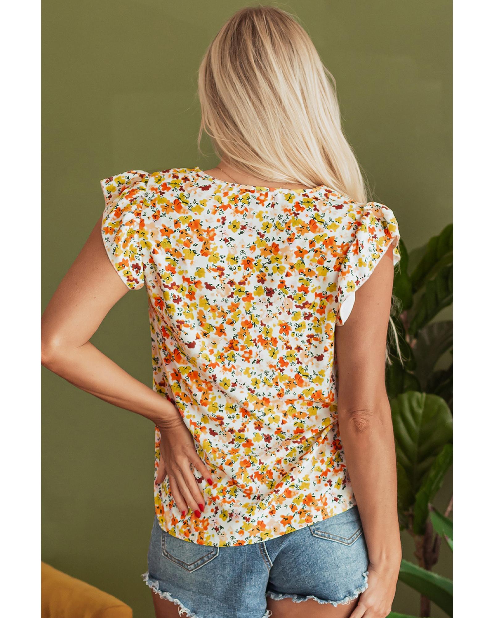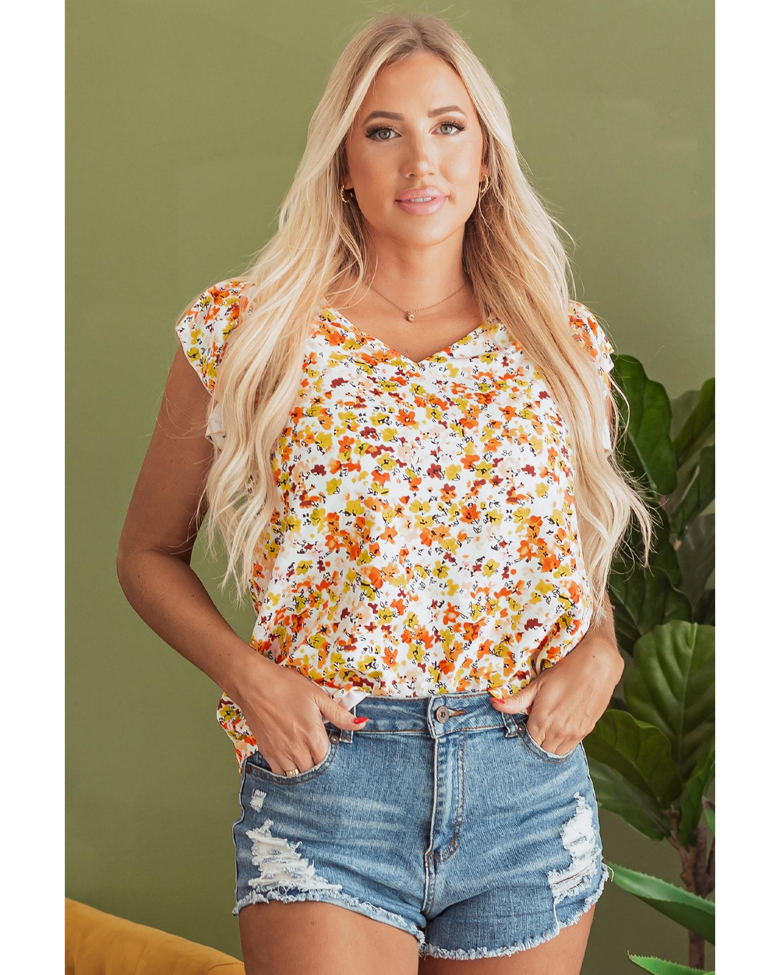 Green Floral Print Ruffled Sleeveless V Neck Tank Top – L
