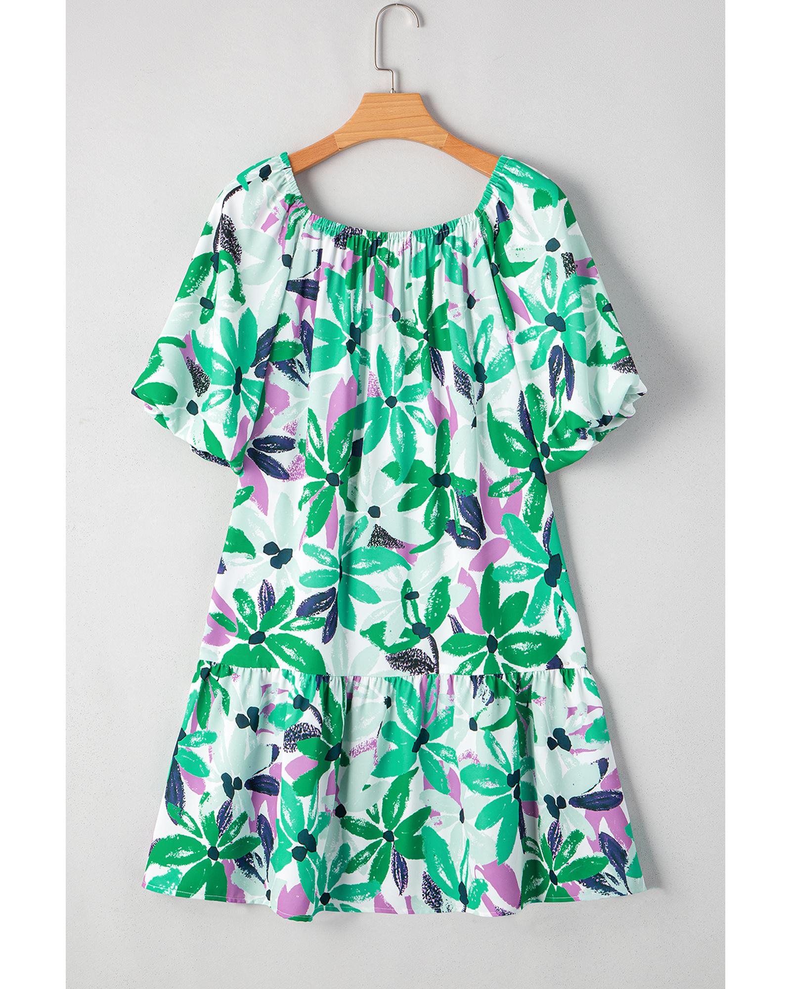 Green Floral Print Shirred Square Neck Loose Fit Mini Dress – L