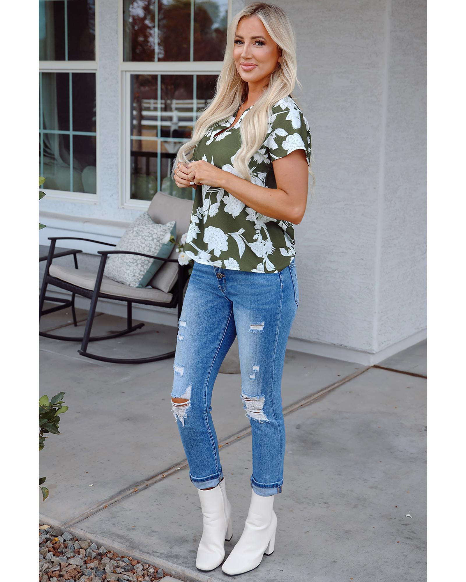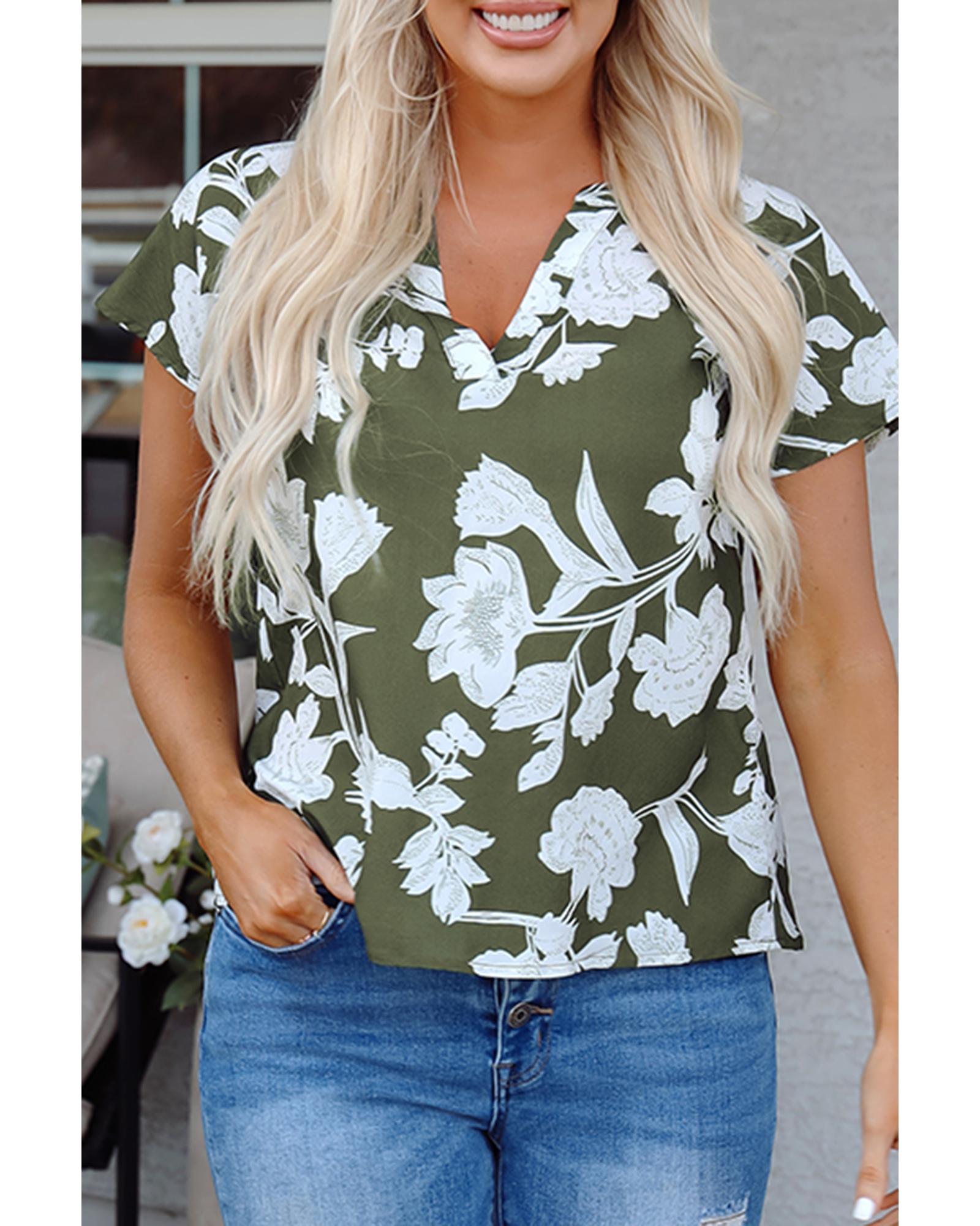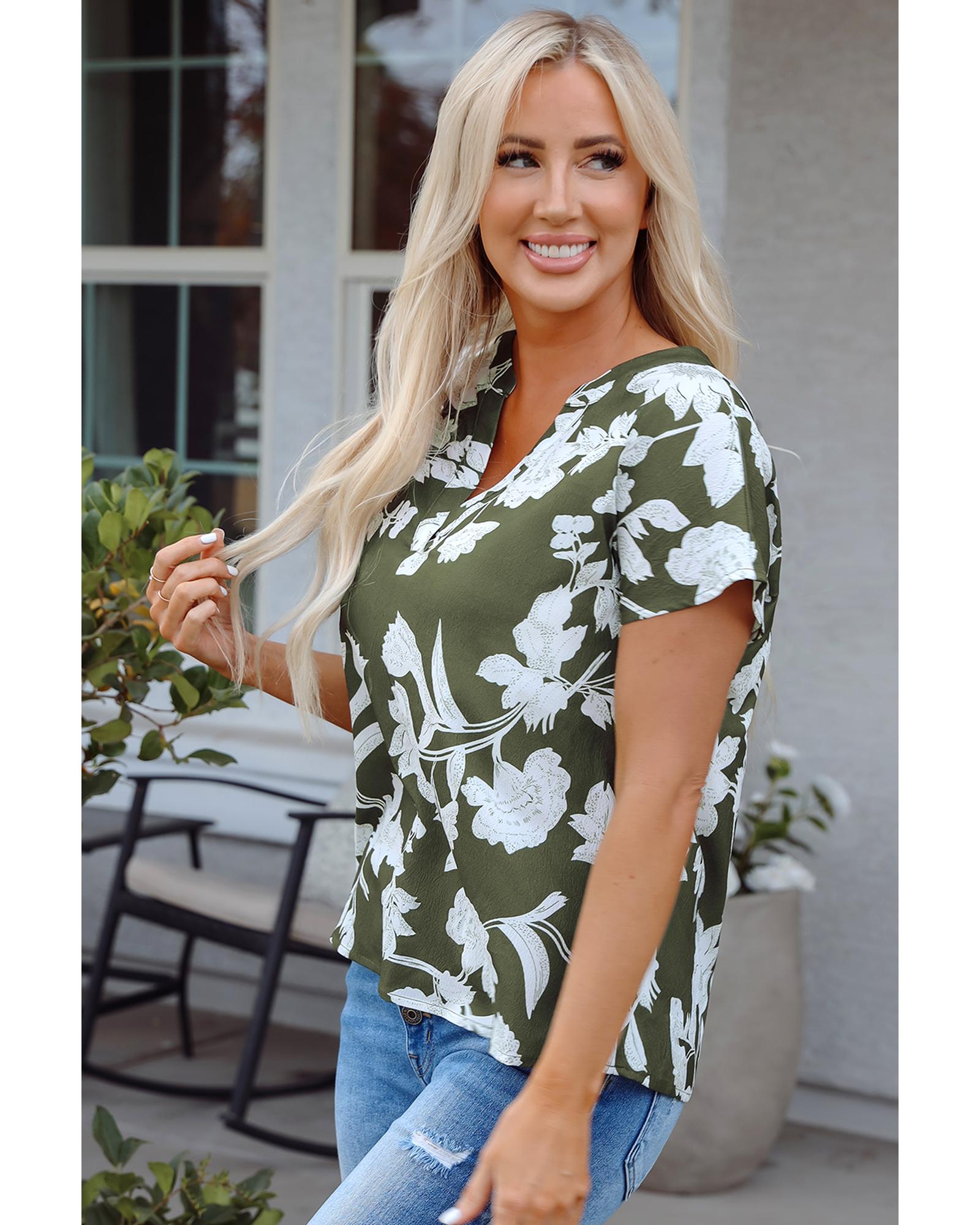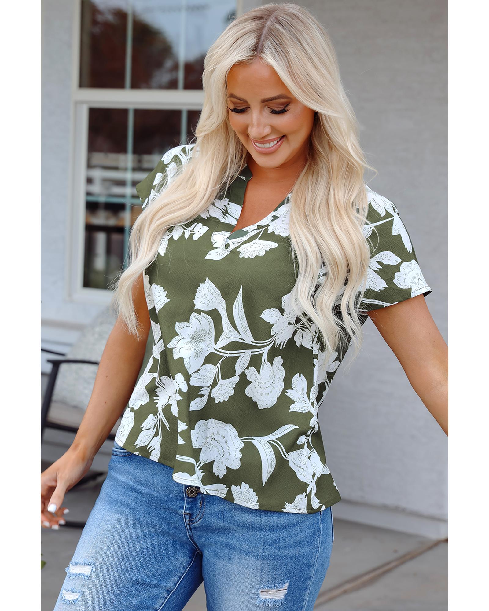 Green Floral Print Split Neck Short Sleeve Blouse – M