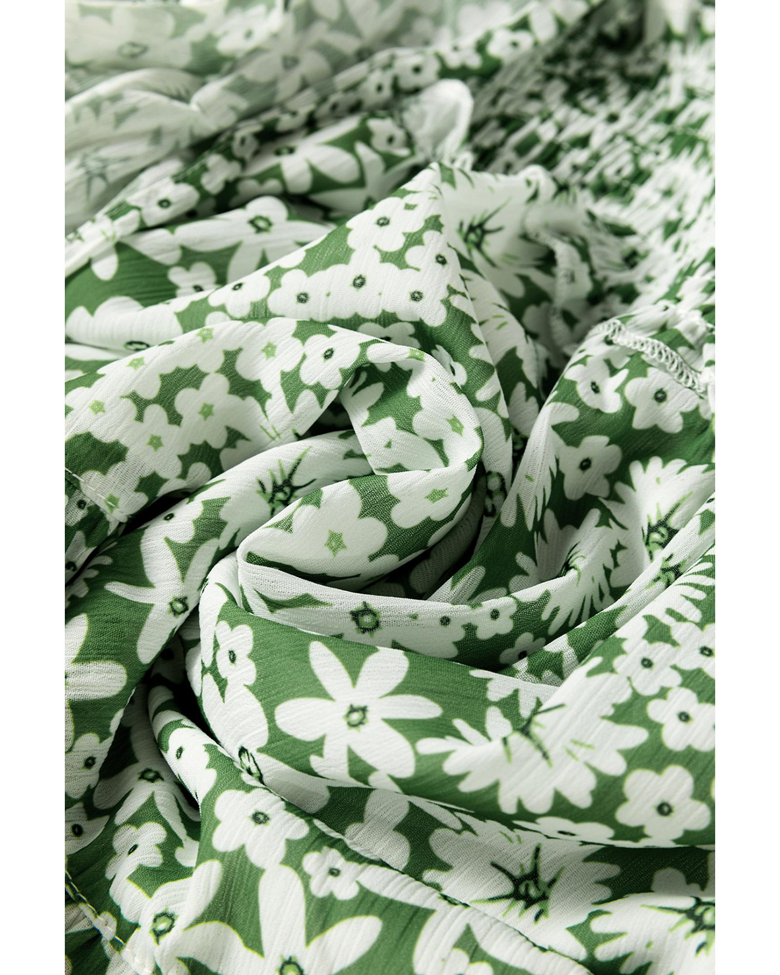 Green Floral Print Square Neck Shirred Waist Tiered Ruffled Mini Dress – L