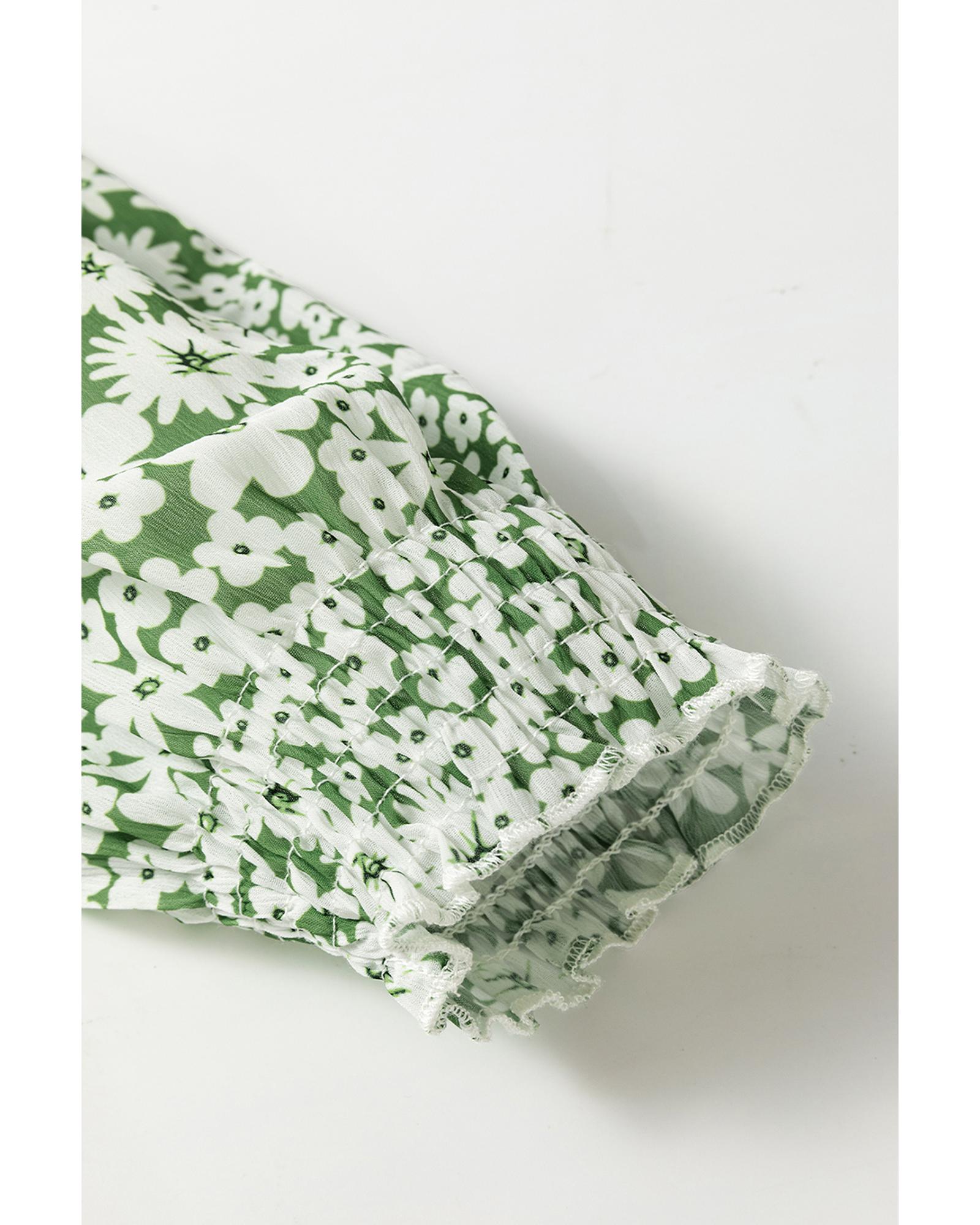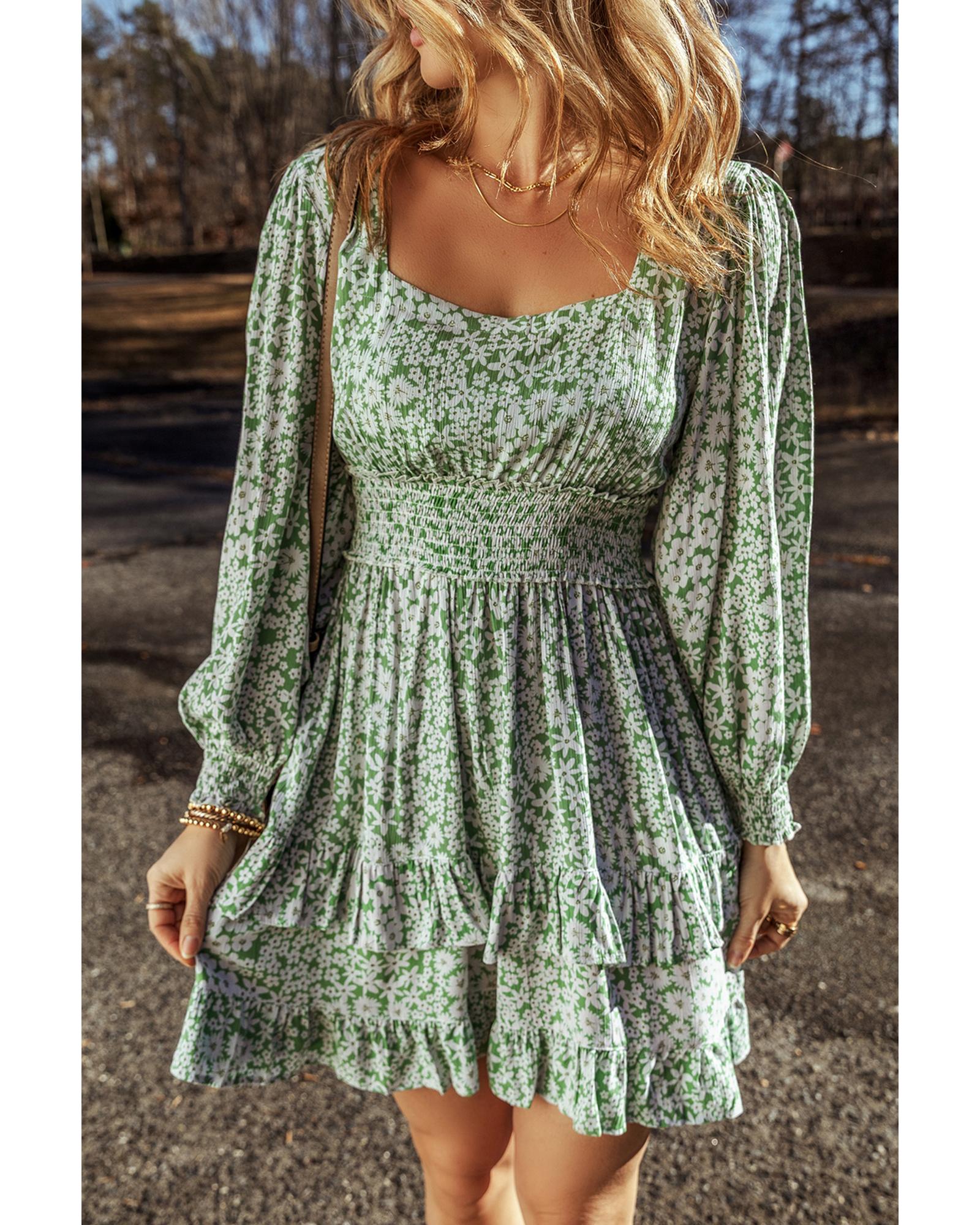 Green Floral Print Square Neck Shirred Waist Tiered Ruffled Mini Dress - S