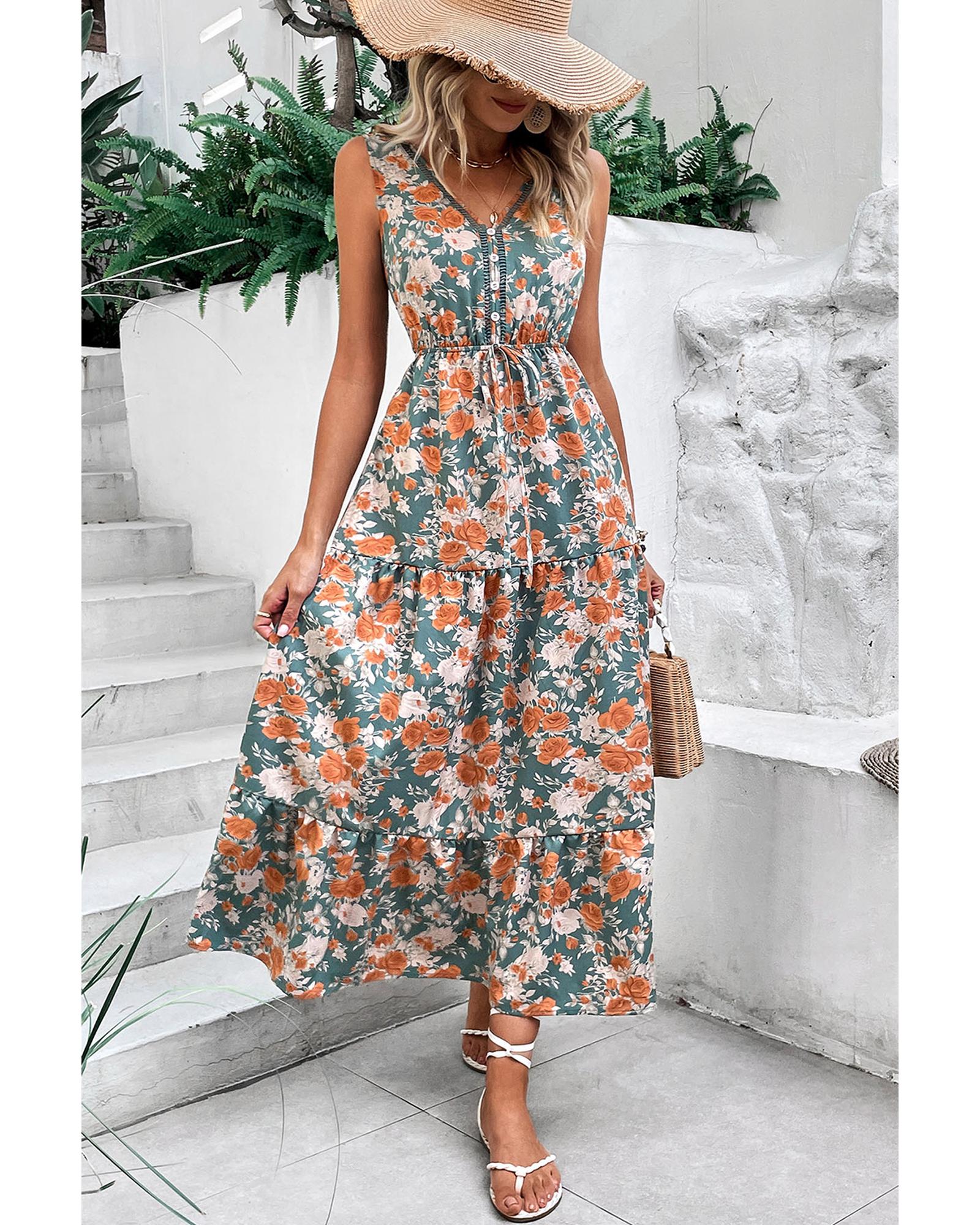 Green Floral Print Trimmed V Neck Tie Waist Sleeveless Holiday Long Dress – S