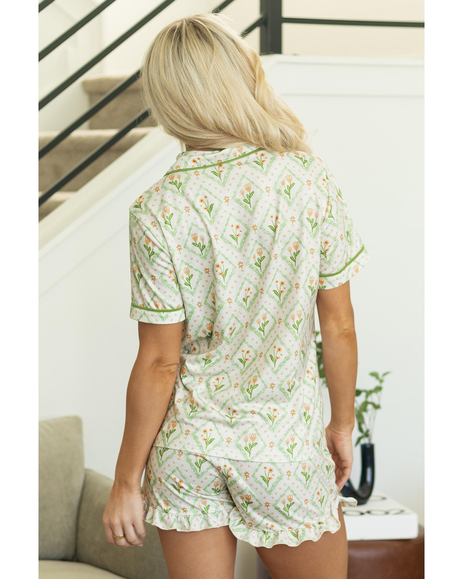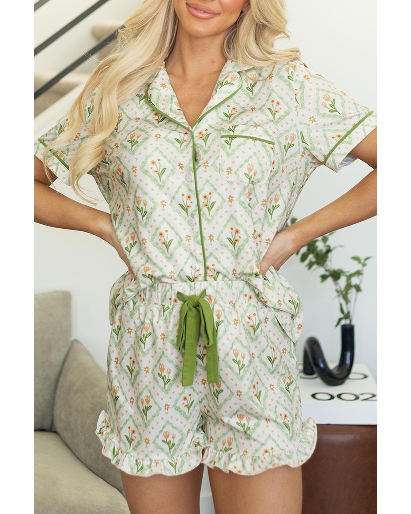 Green Floral Print Turn-down Collar Short Pajamas Set – XL