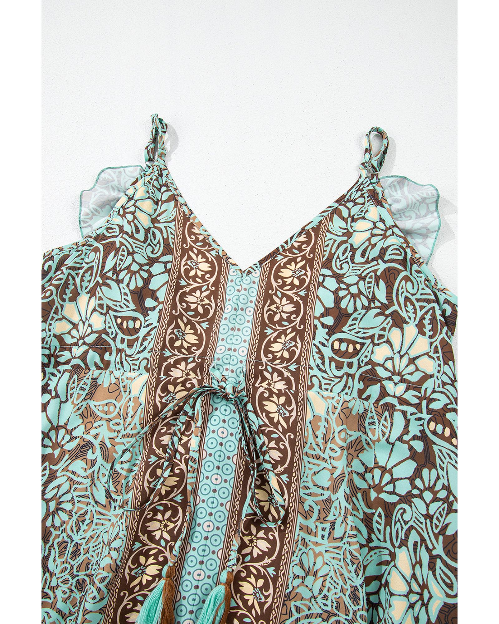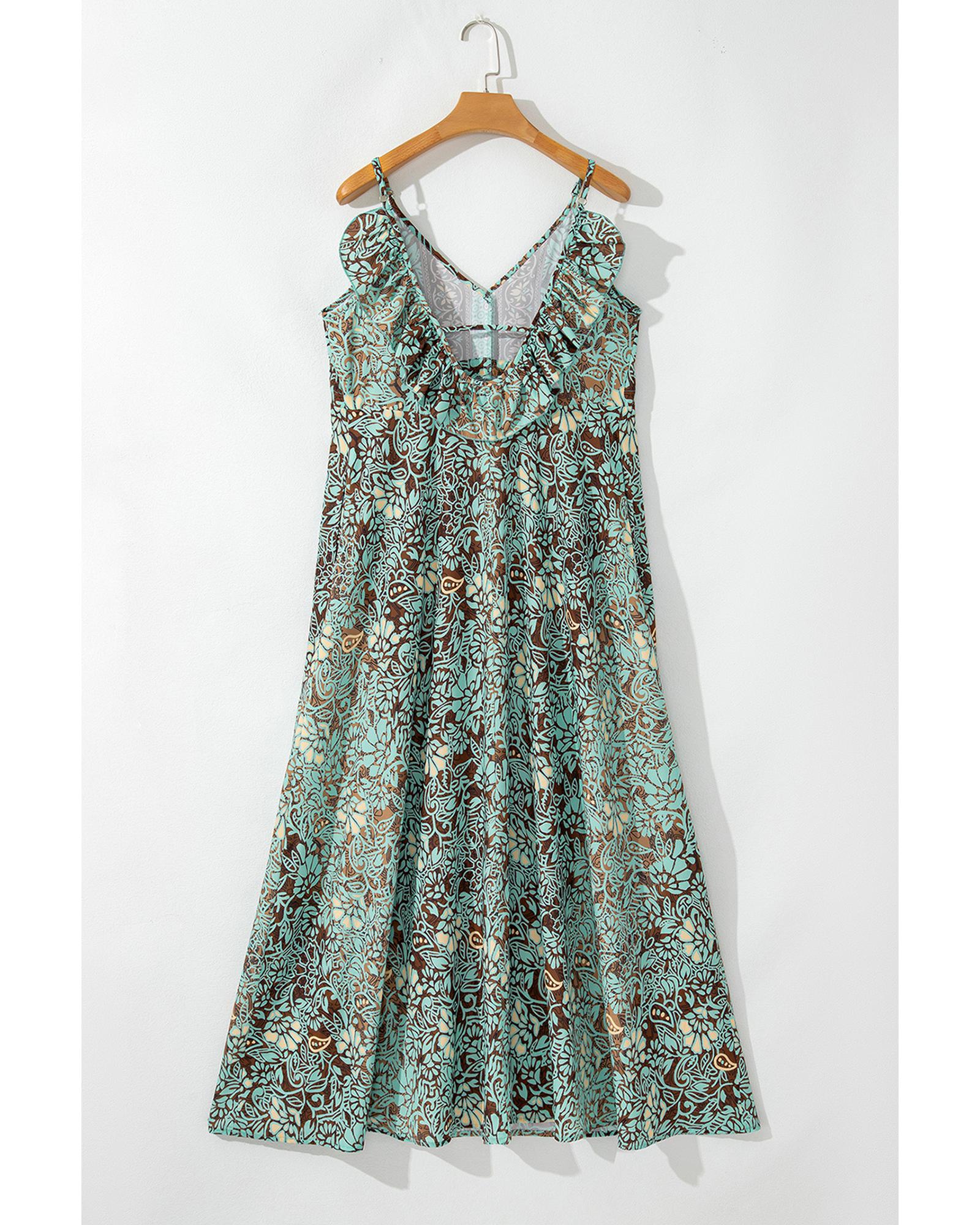 Green Floral Print V Neck Ruffled Trim Backless Tassel Waist Maxi Dress – S