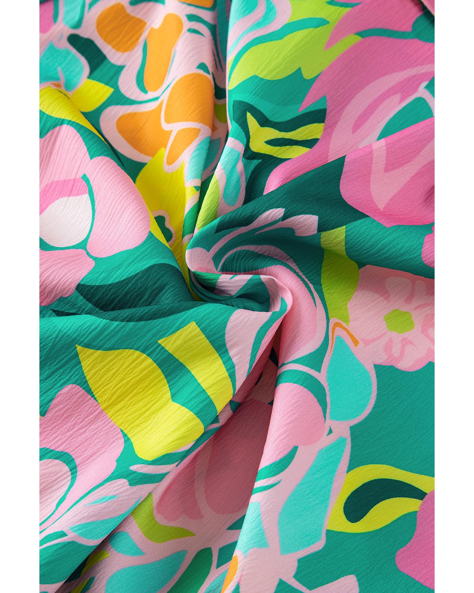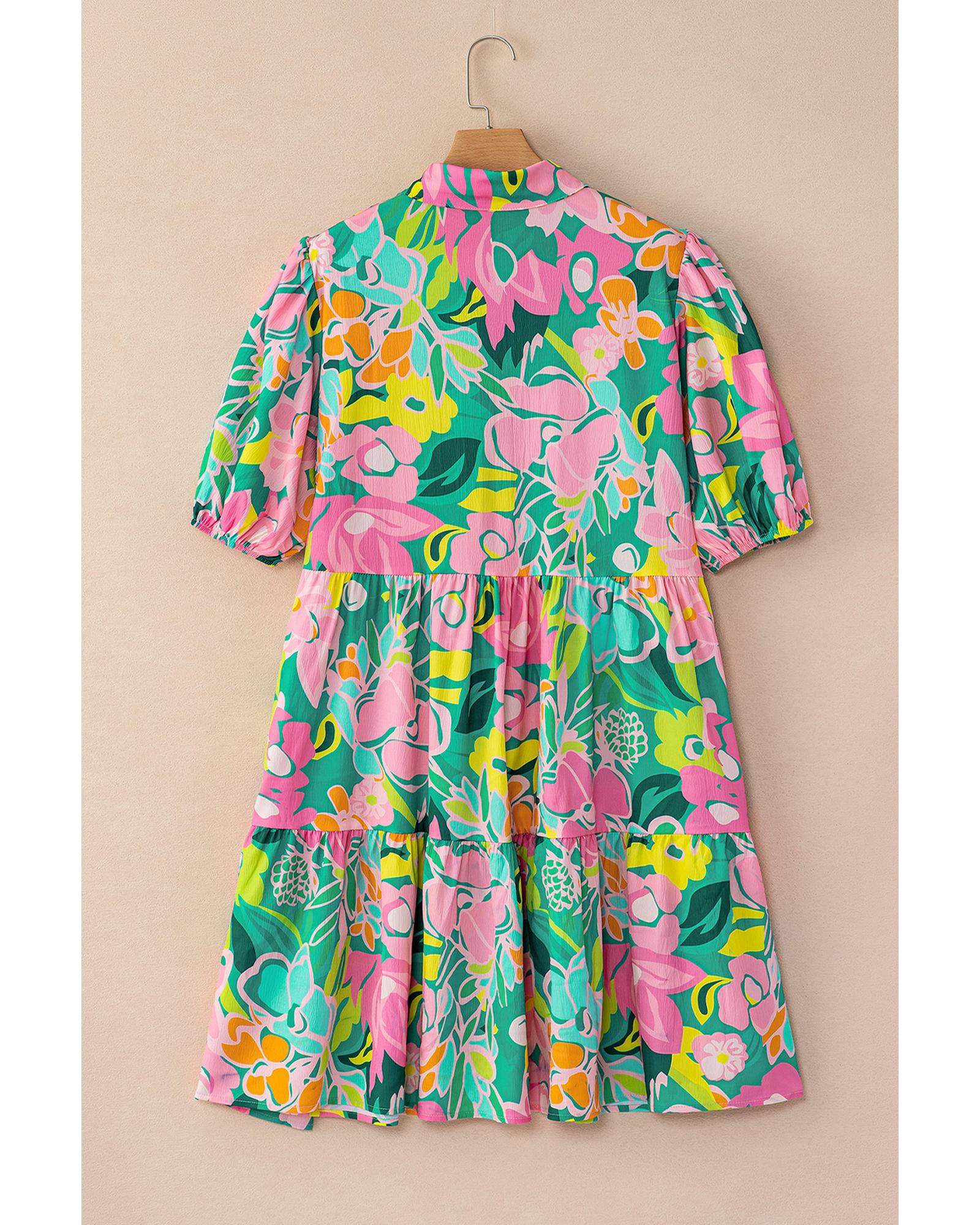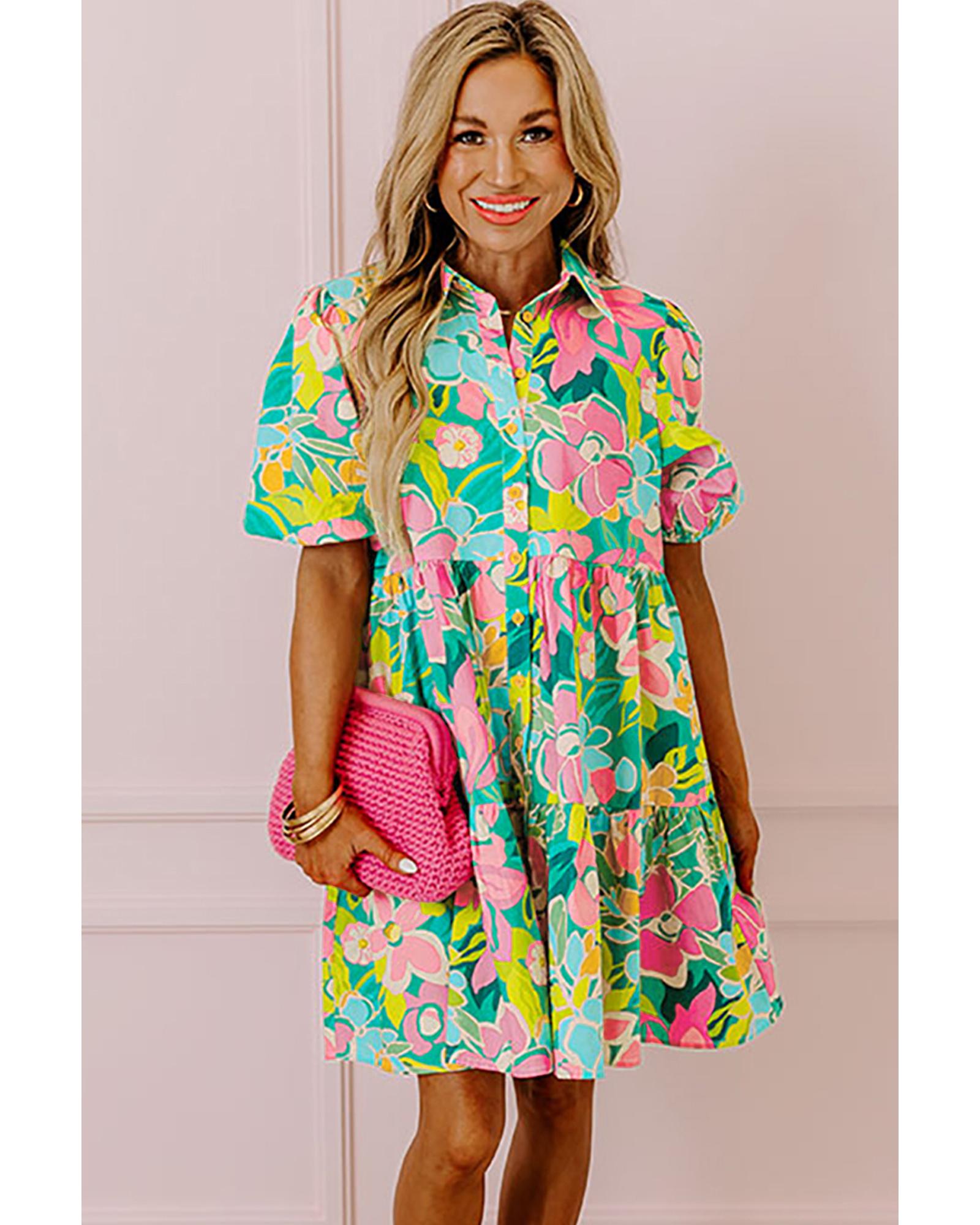 - Green Floral Puff Sleeve Collar Buttoned Babydoll Dress