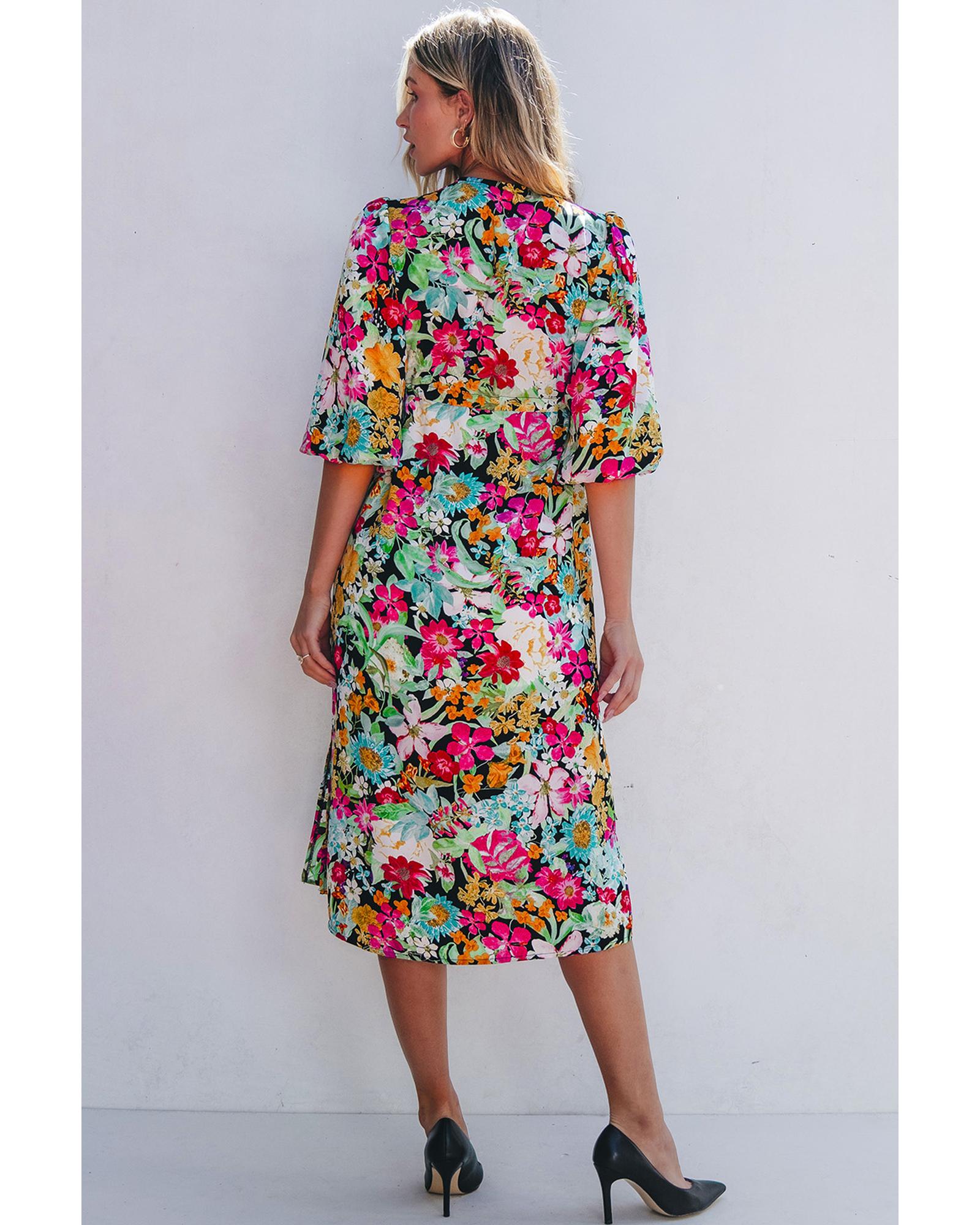 Green Floral Puff Sleeve V Neck Tassel Drawstring Dress – S