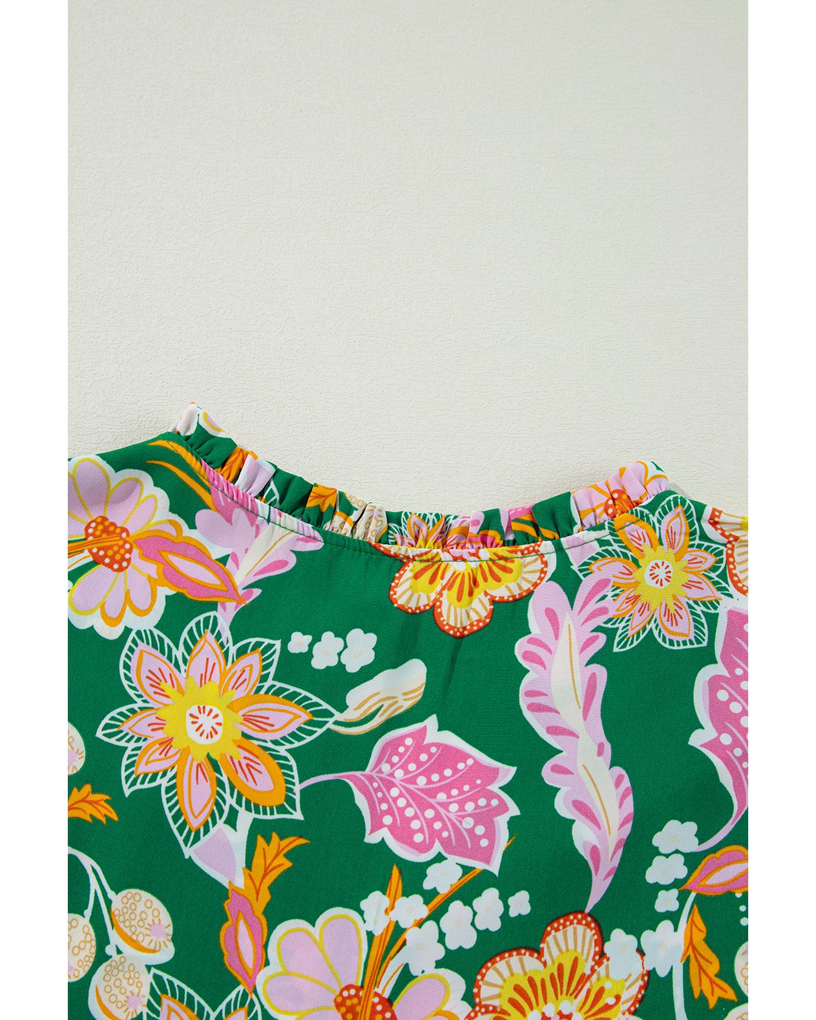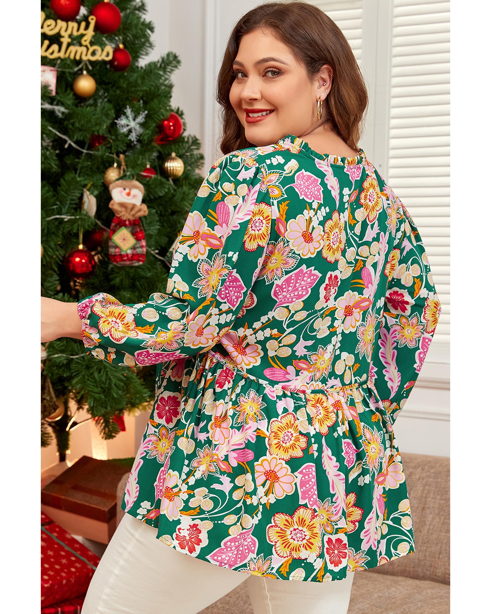 Green Floral Tied V Neck Long Sleeve Plus Size Babydoll Top – 1X