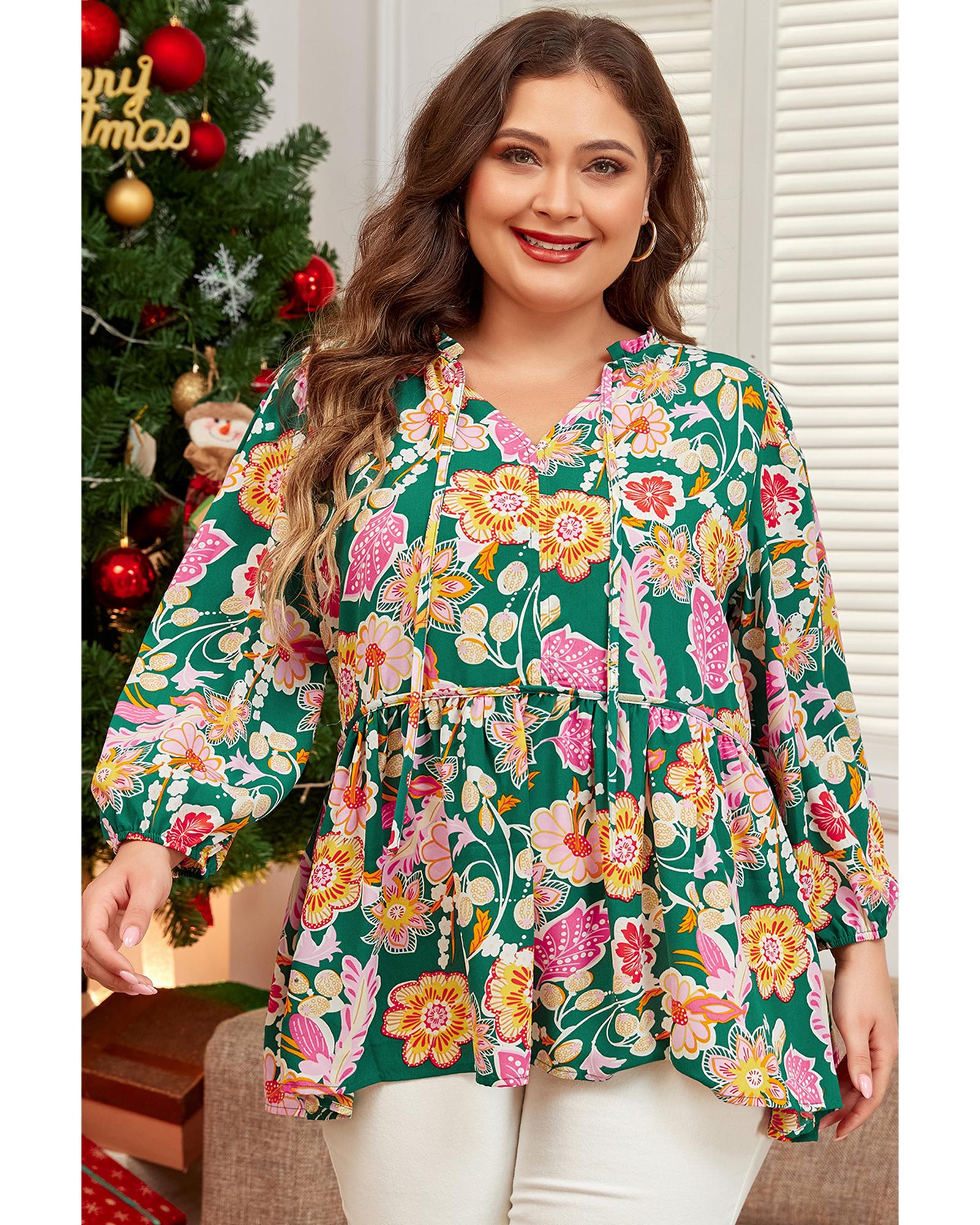 Green Floral Tied V Neck Long Sleeve Plus Size Babydoll Top – 2X