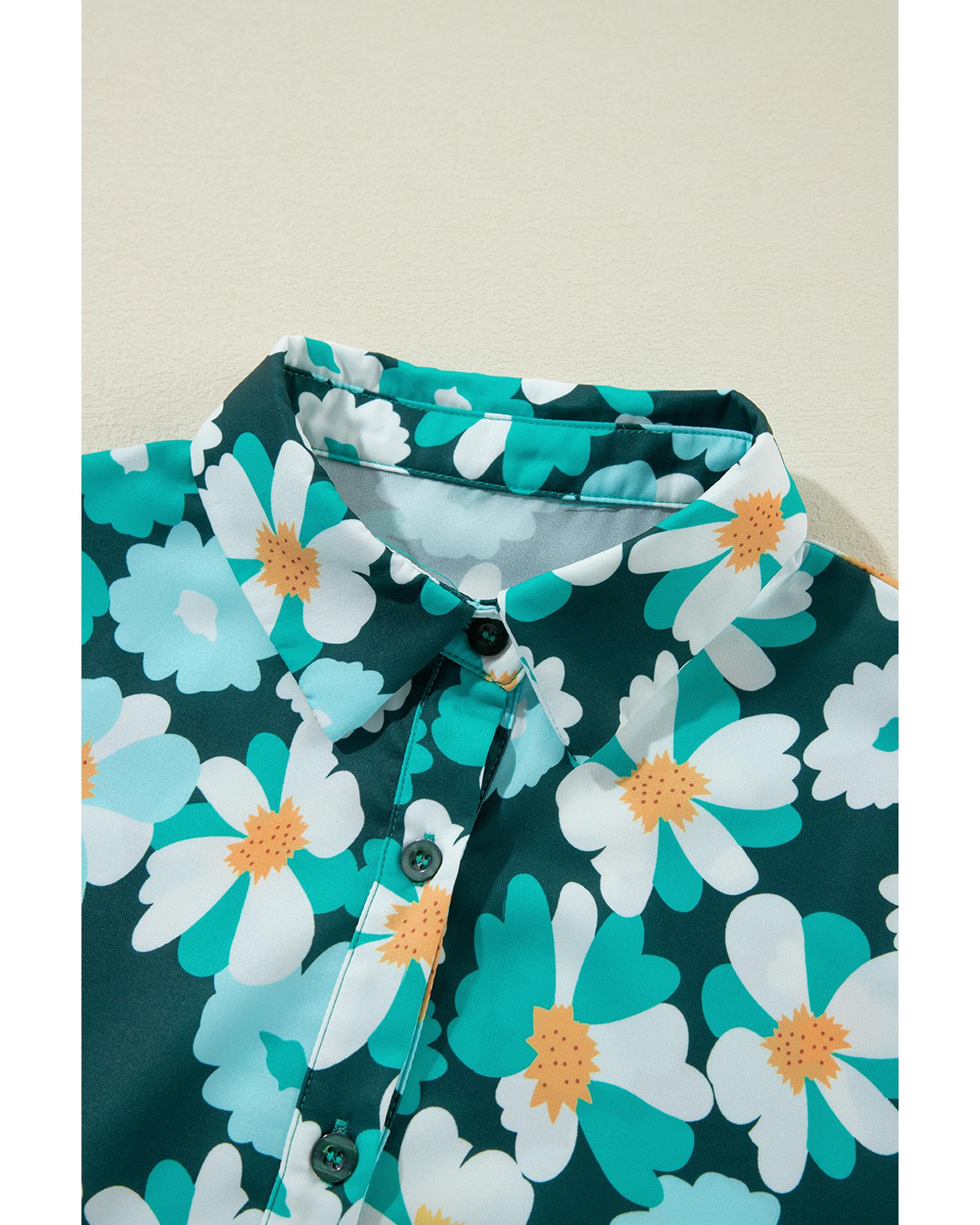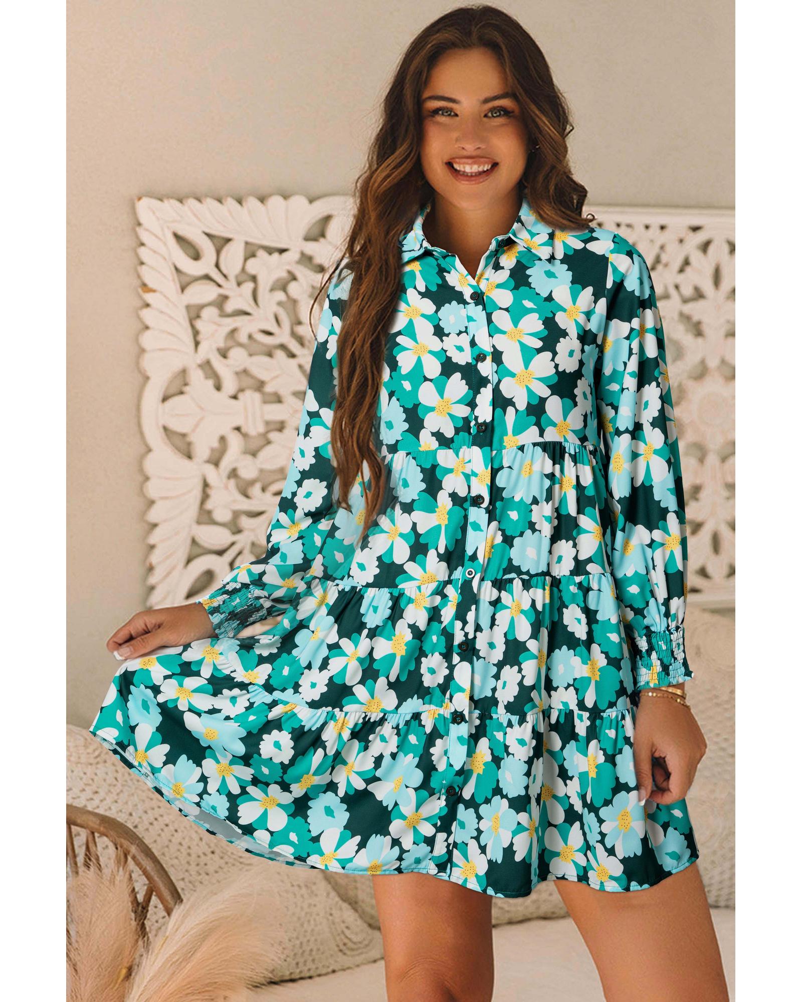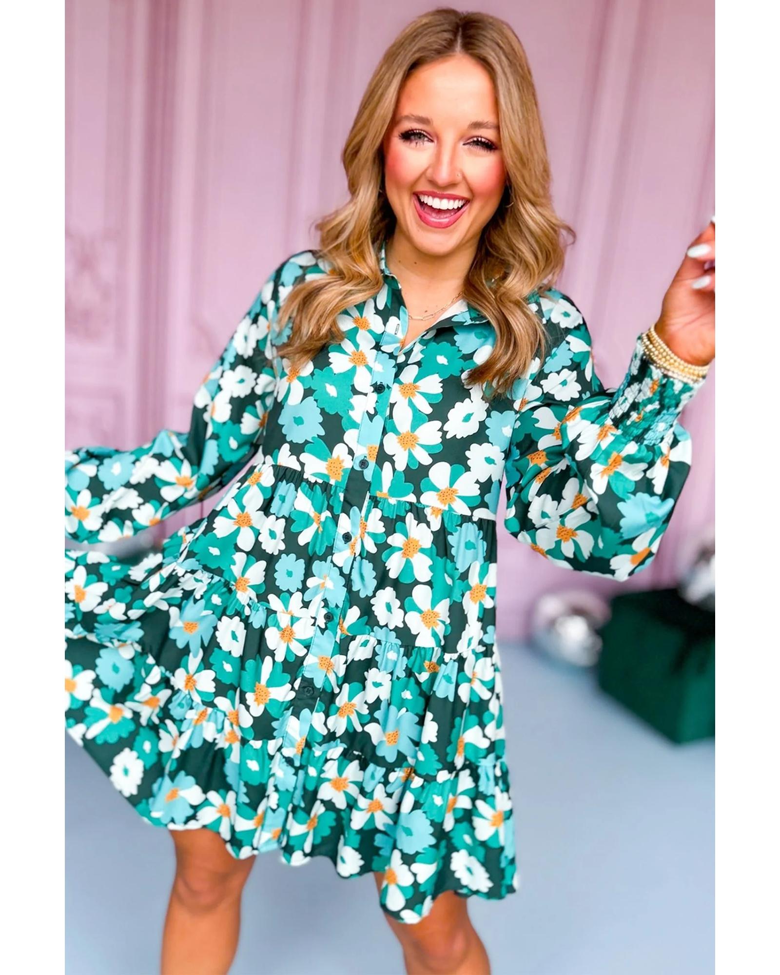 Green Floral Tiered Long Puff Sleeve Shirt Dress – S
