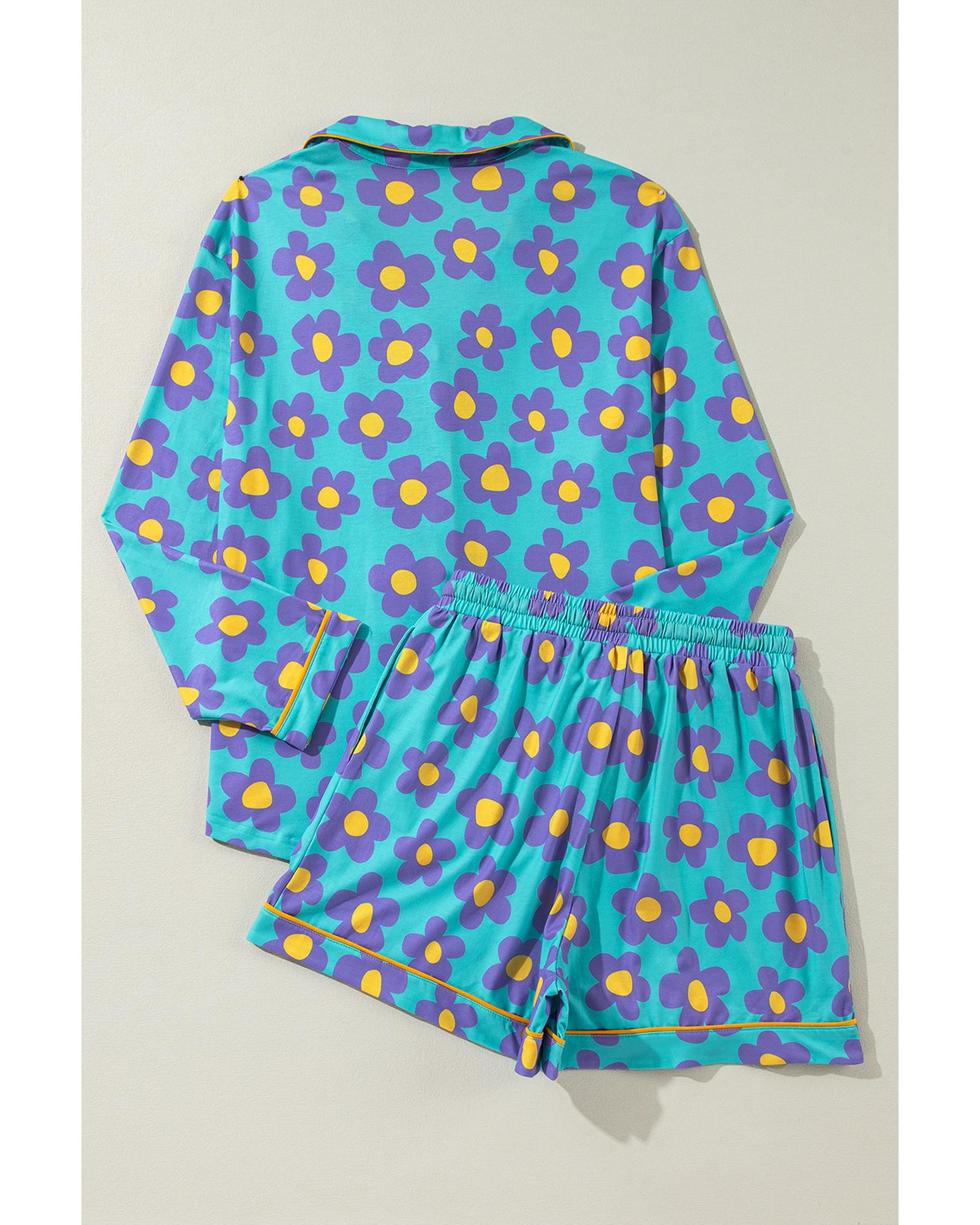 - Green Flower Print Long Sleeve Shirt Shorts Pajamas Set