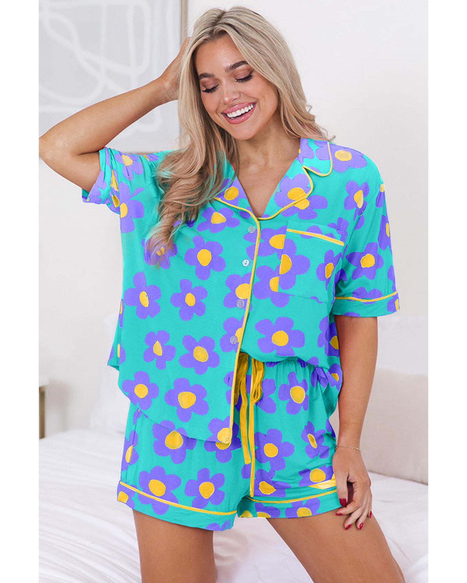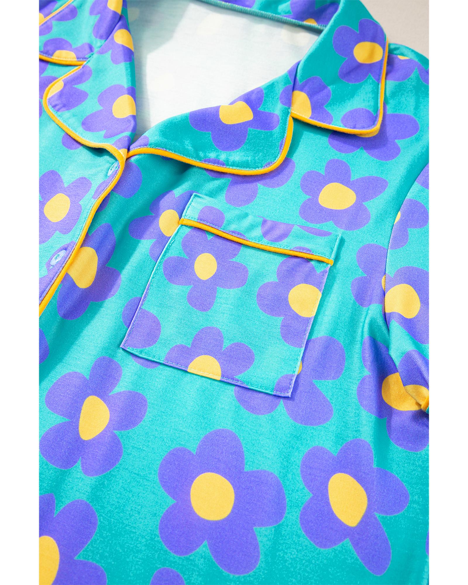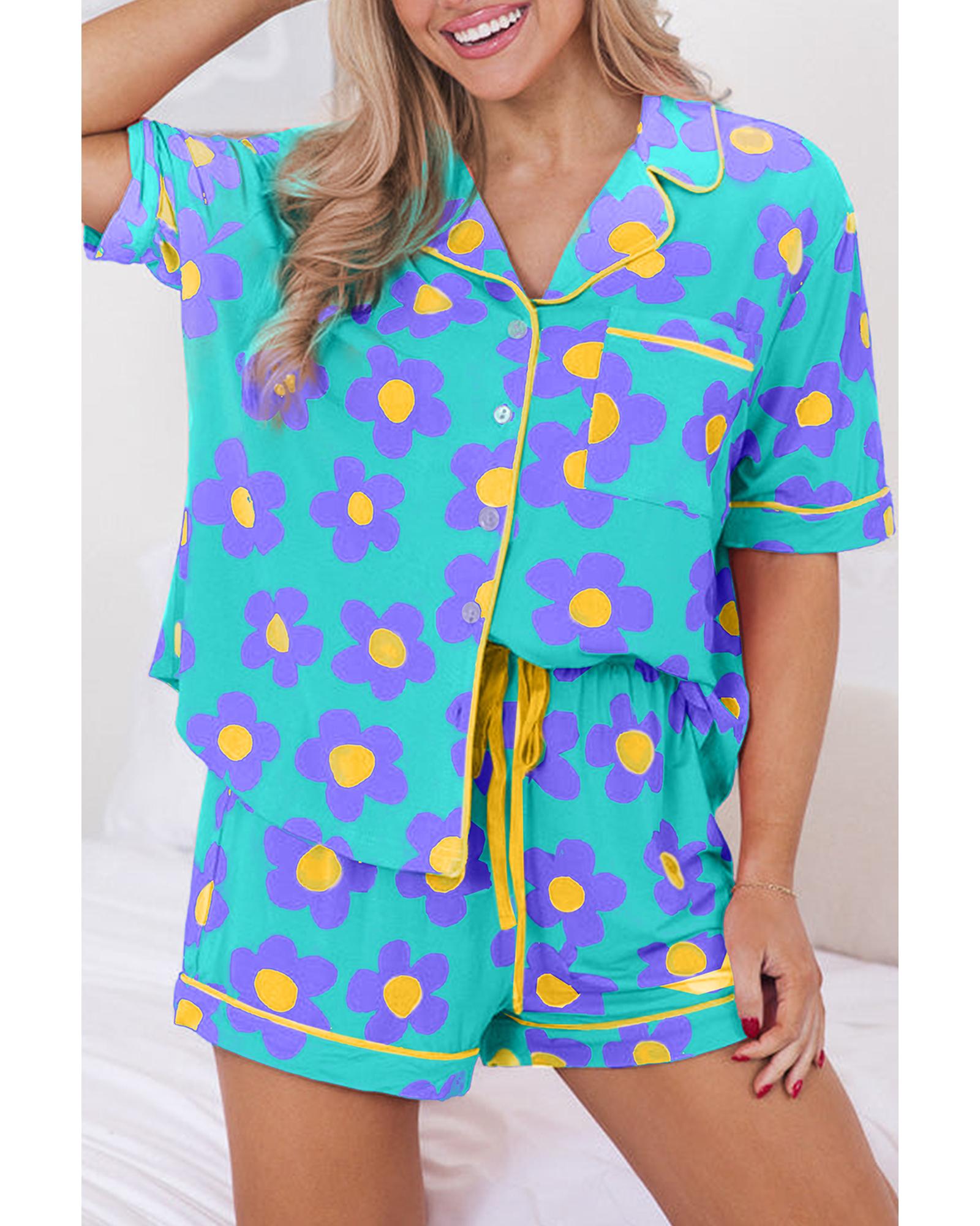 Green Flower Print Short Sleeve Shirt Pajamas Set – M