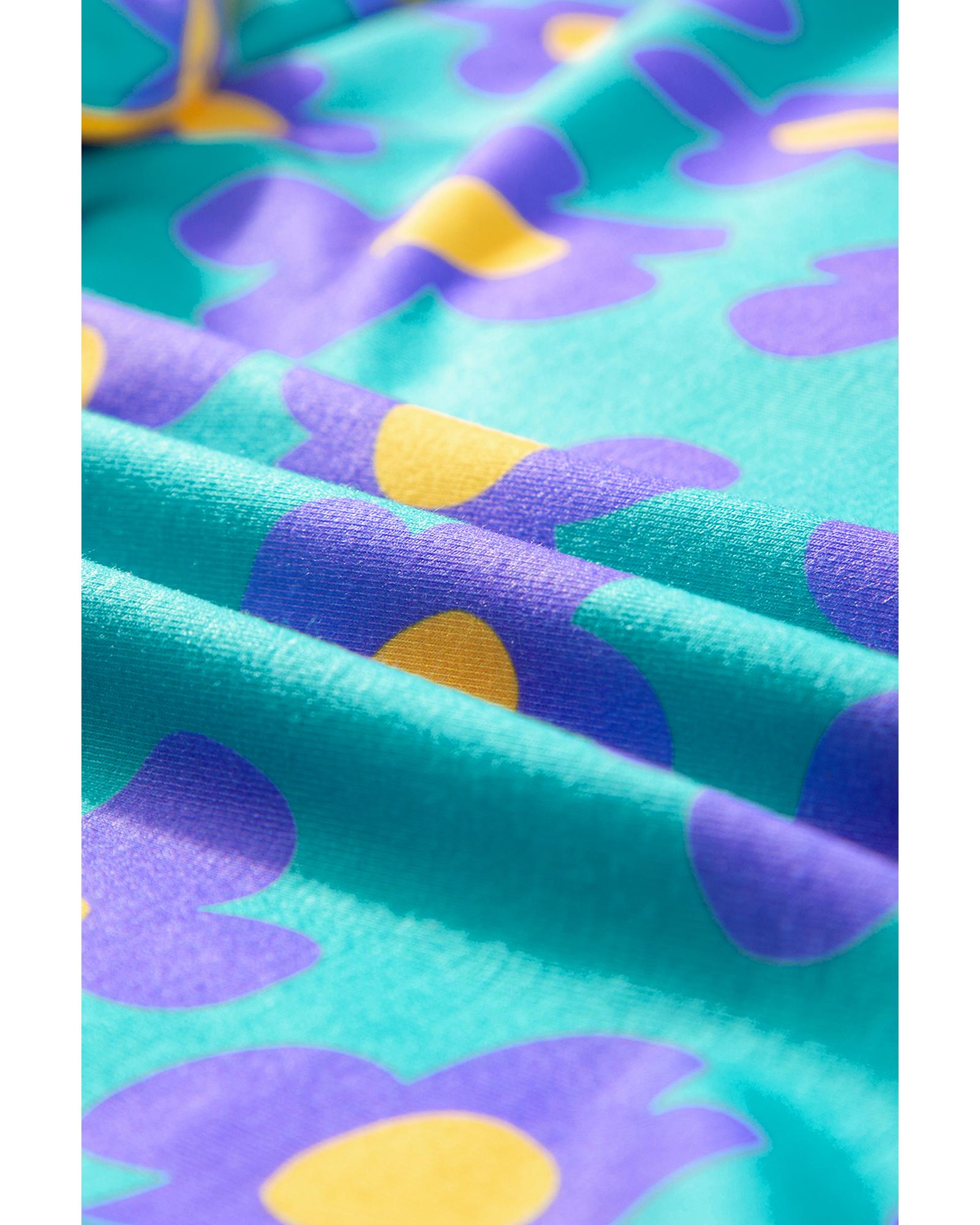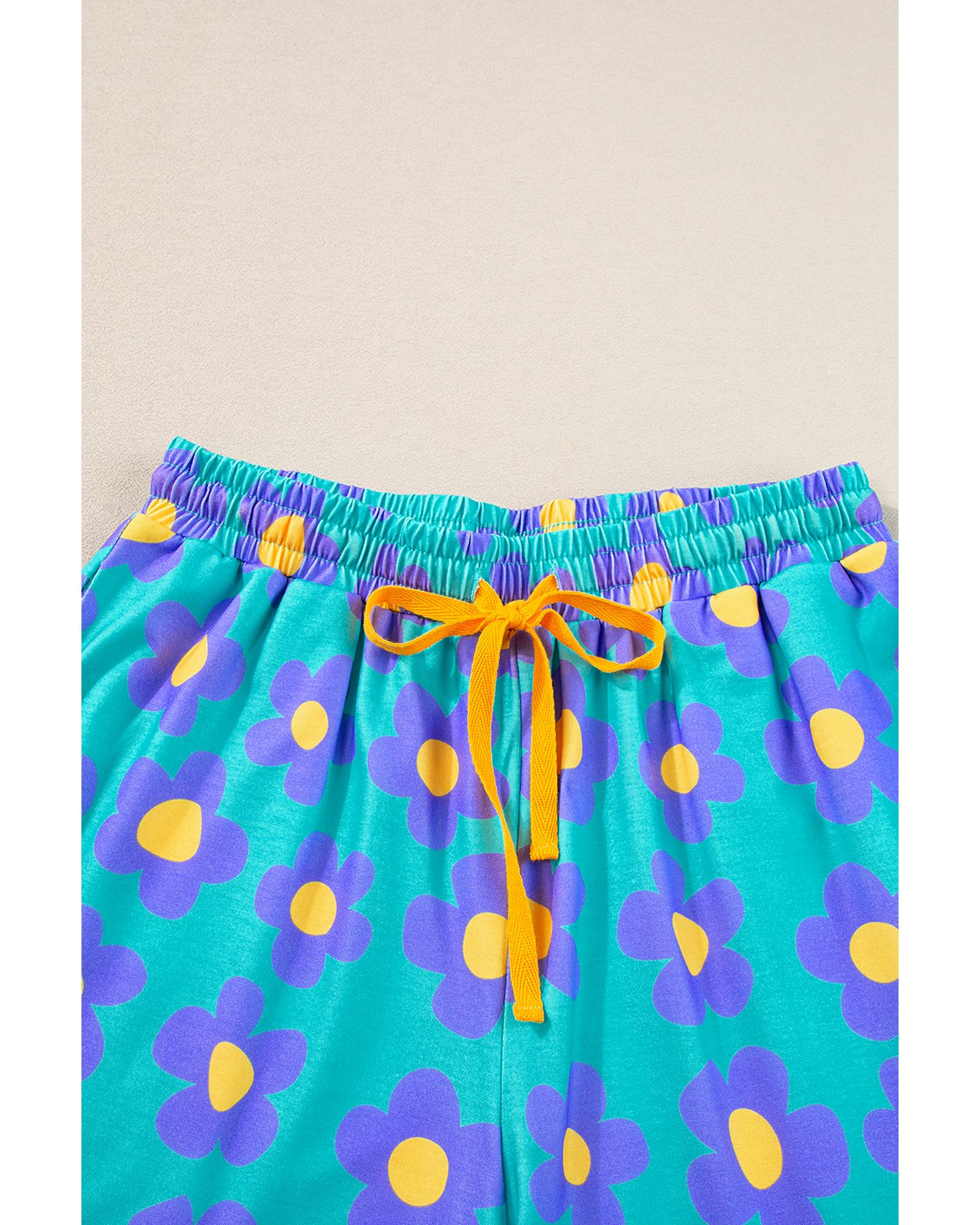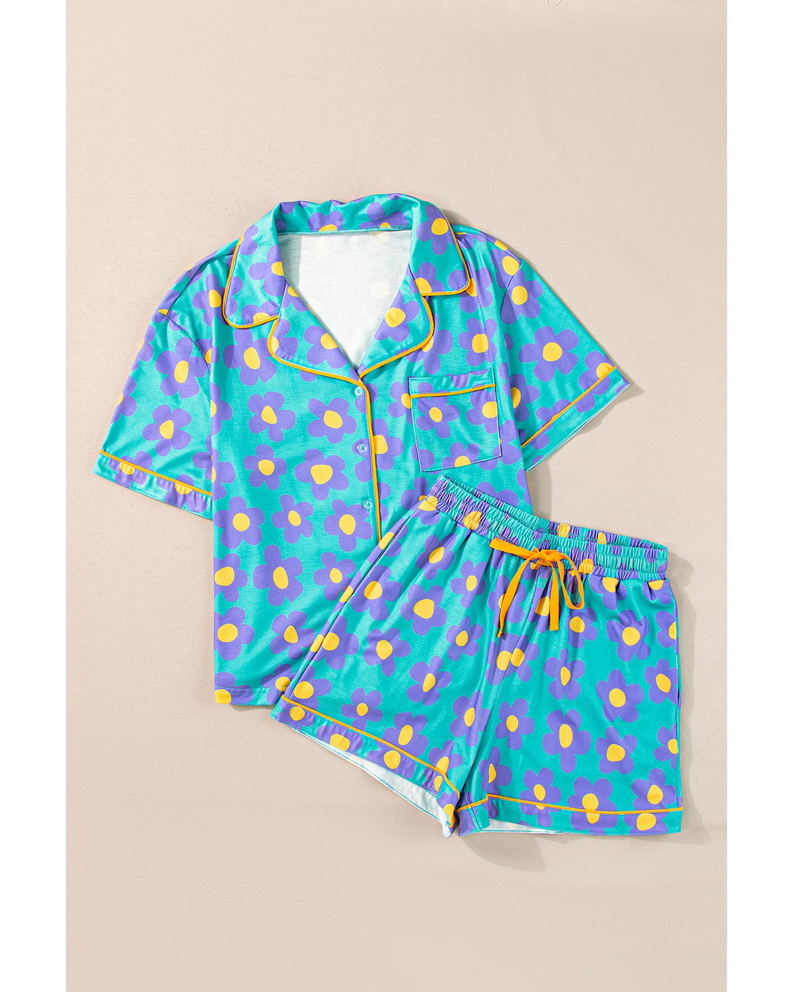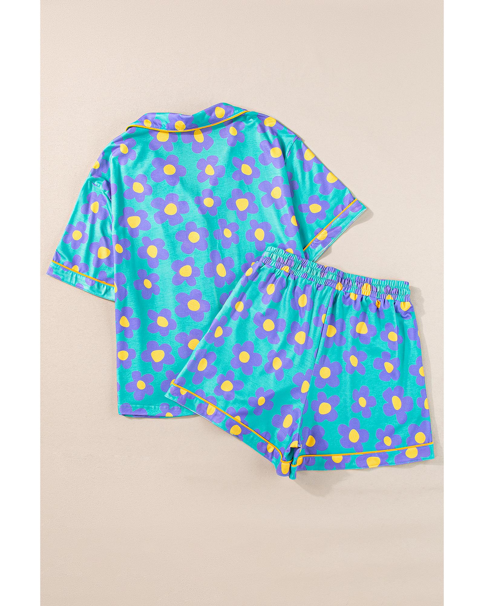 Green Flower Print Short Sleeve Shirt Pajamas Set – M