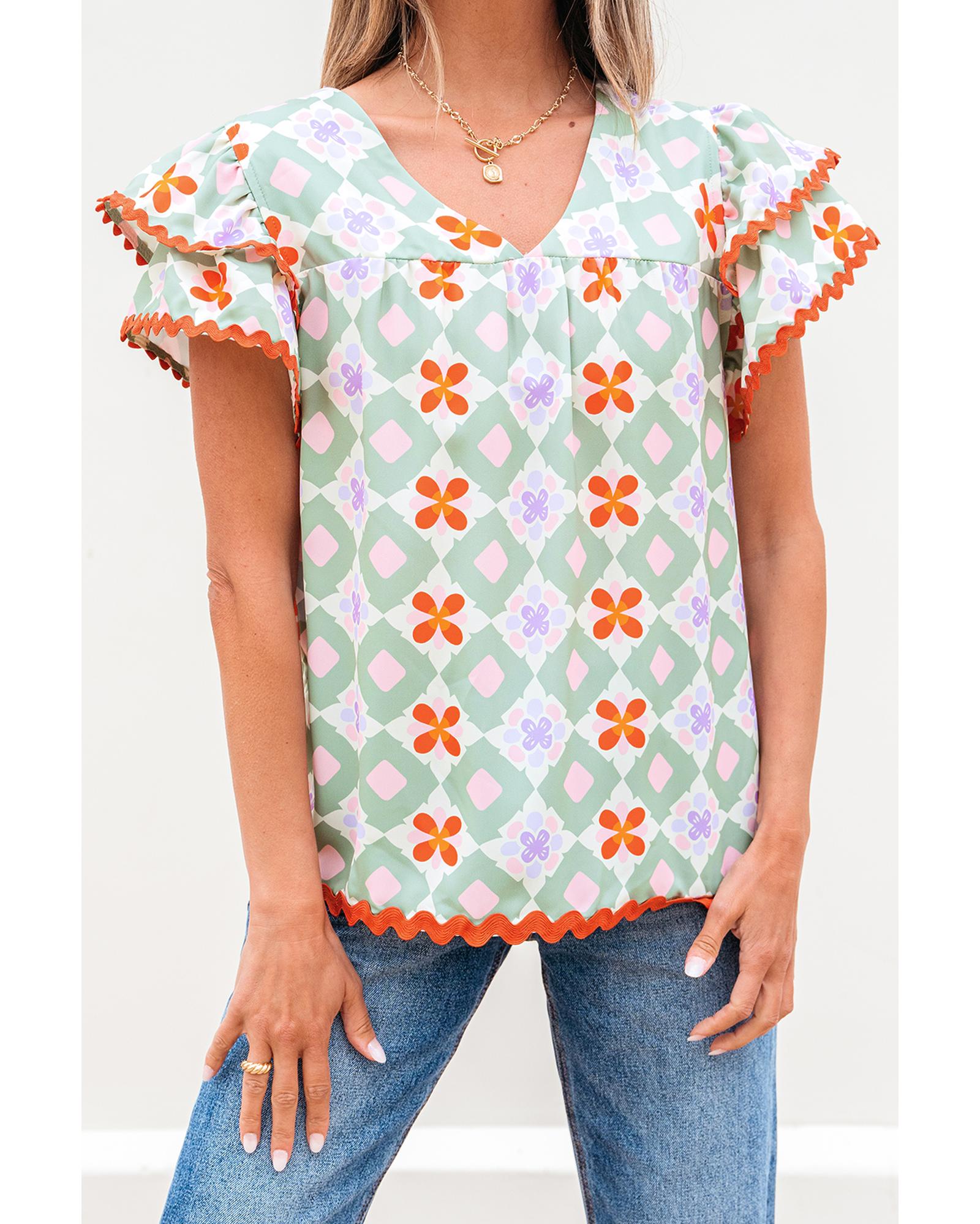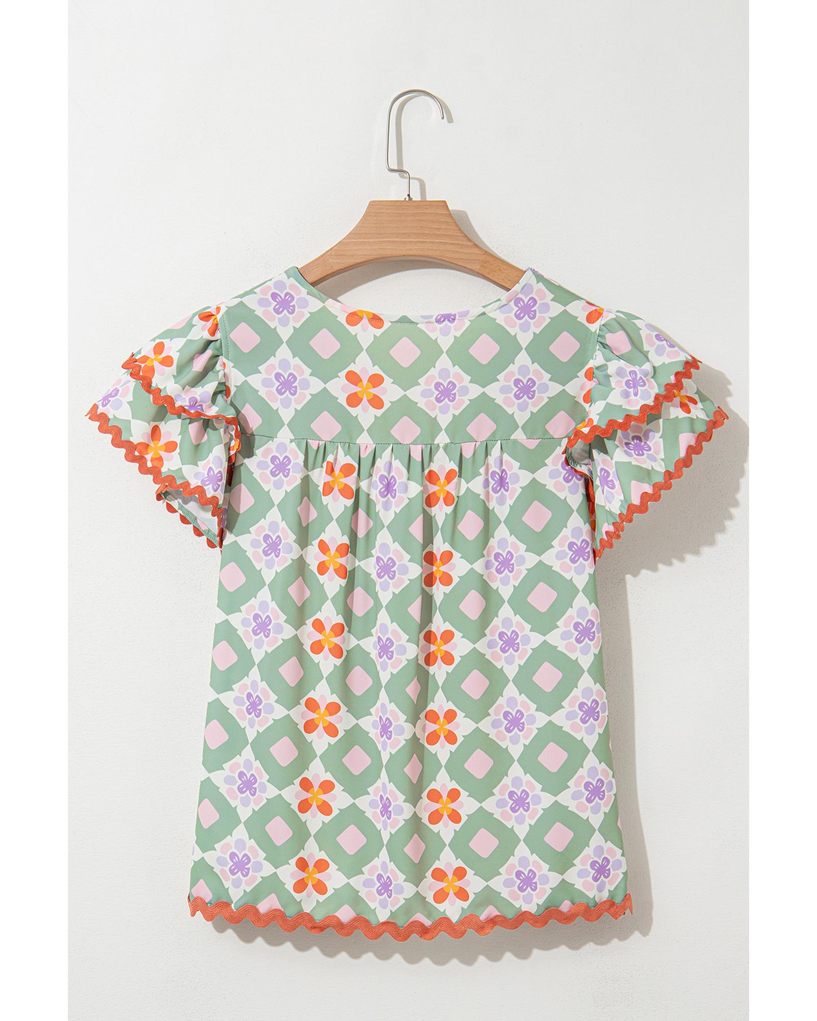 Green Geometric Floral Print Layered Flutter Sleeve V Neck Ric Rac Trim Blouse – XL