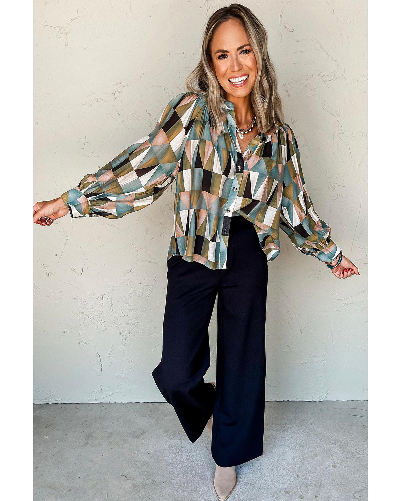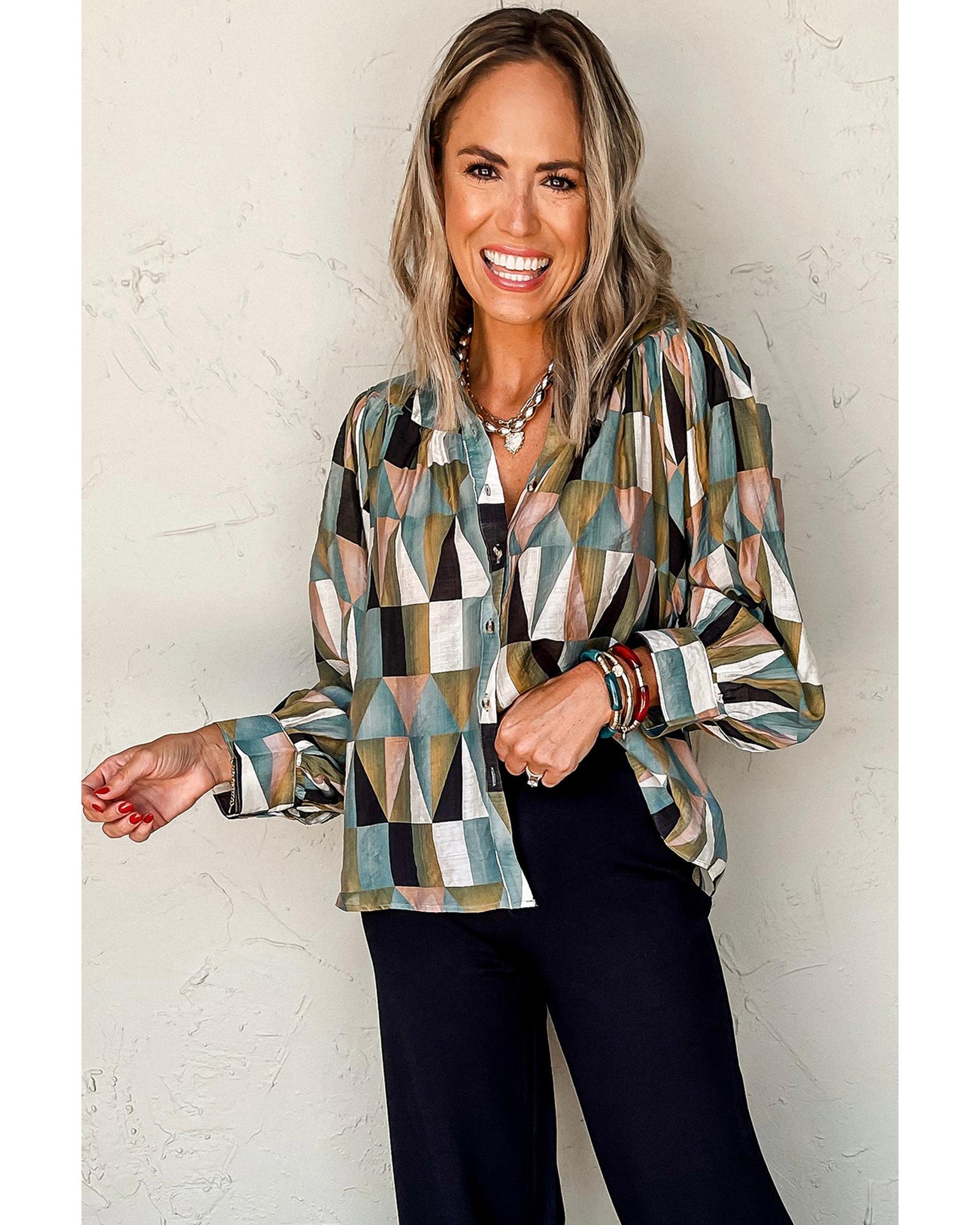 Green Geometric Print Buttoned Balloon Sleeve Loose Fit Shirt – M