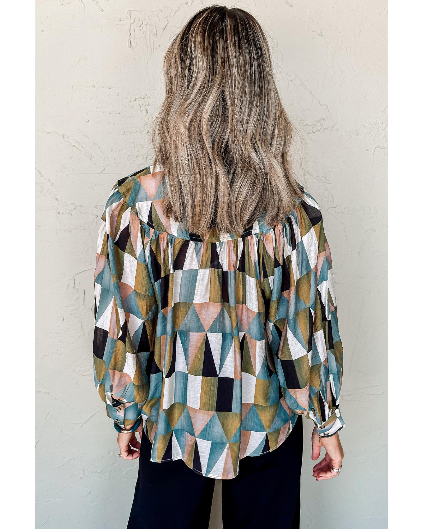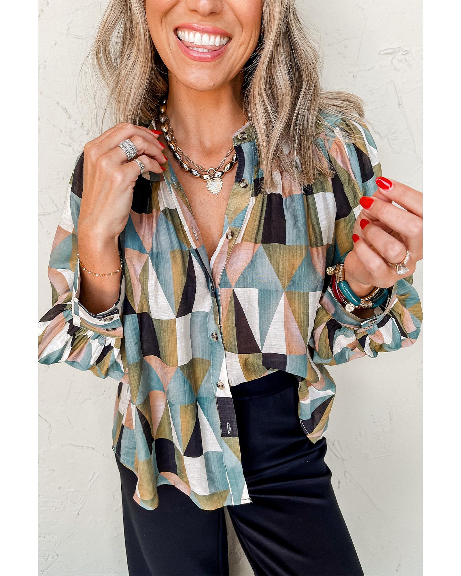 Green Geometric Print Buttoned Balloon Sleeve Loose Fit Shirt – XL