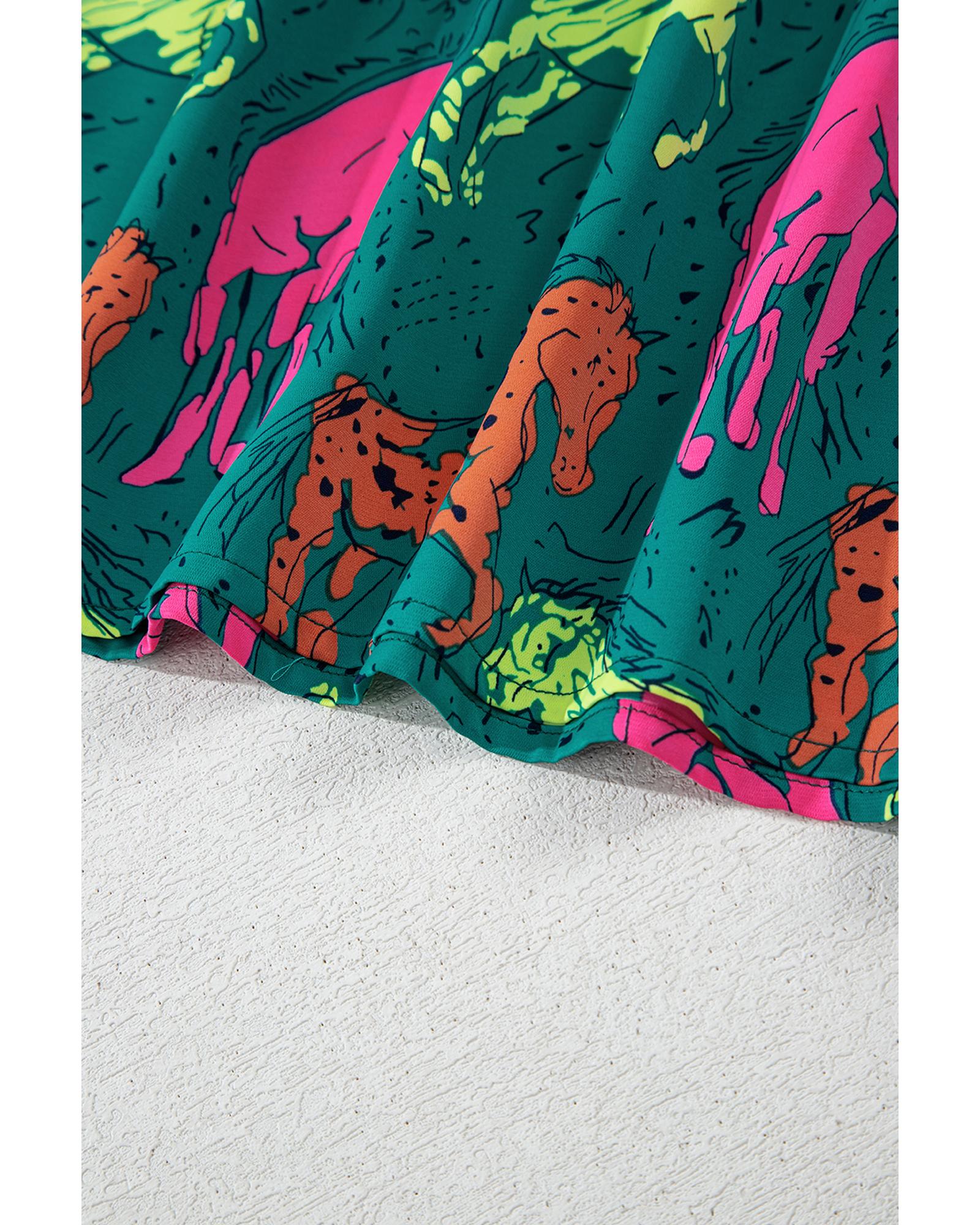 Green Horse Printed Long Sleeve Collared Buttoned Plus Size Midi Dress – 4X
