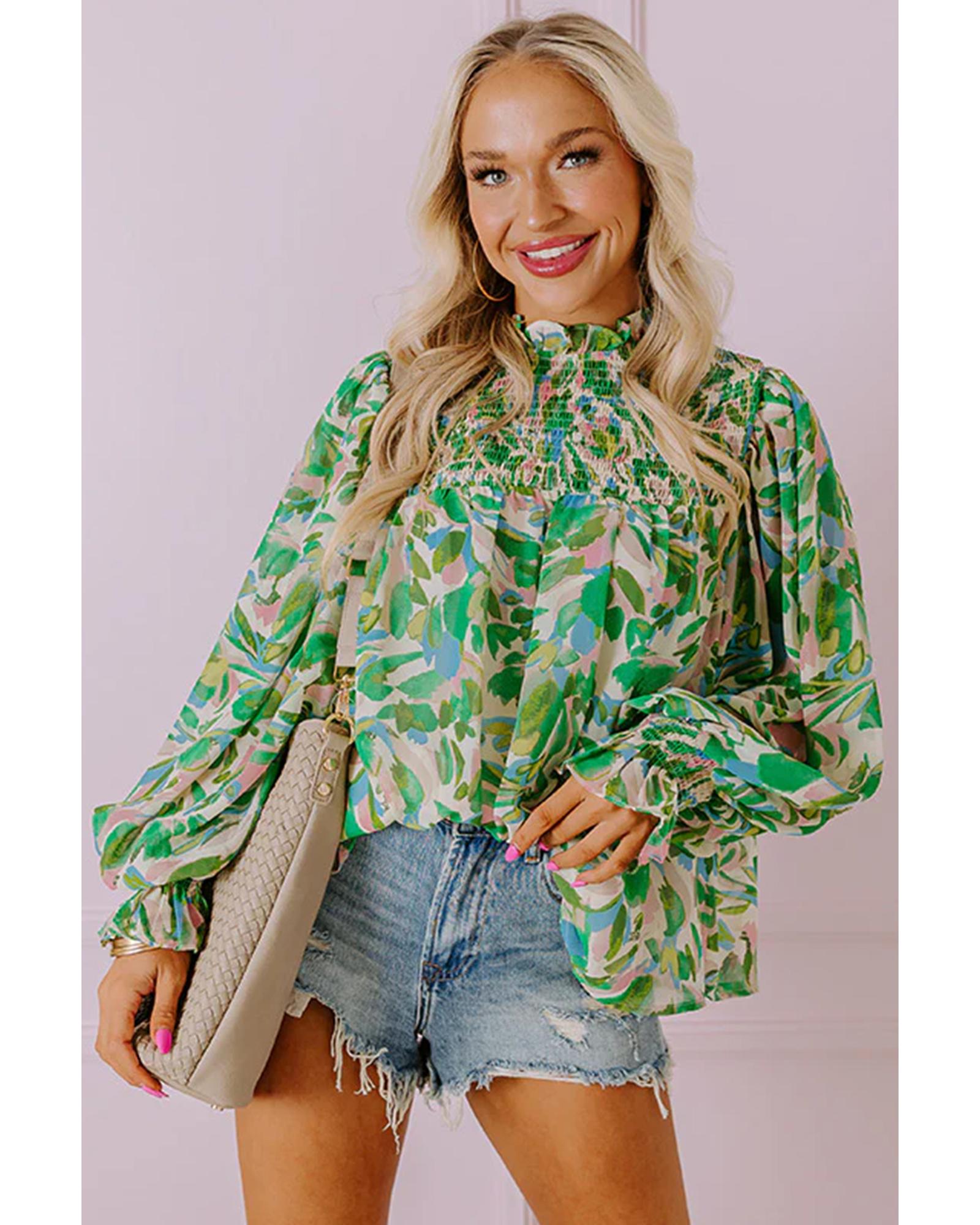 Green Leafy Printed Flounce Sleeve Shirred Mock Neck Blouse – L