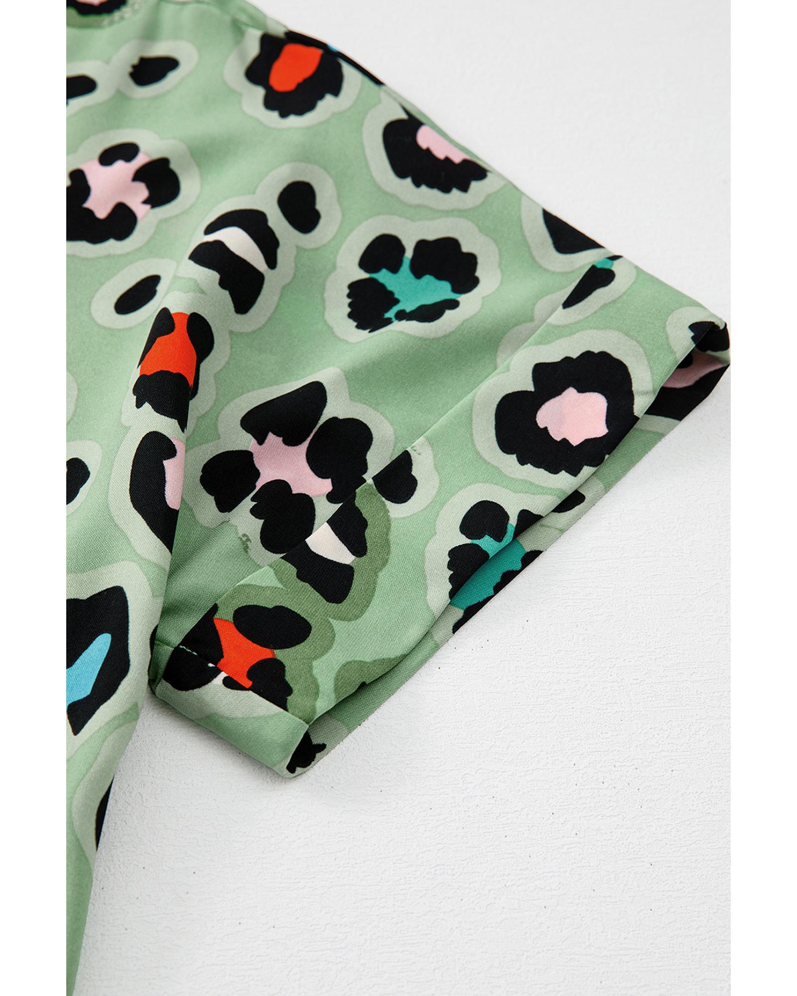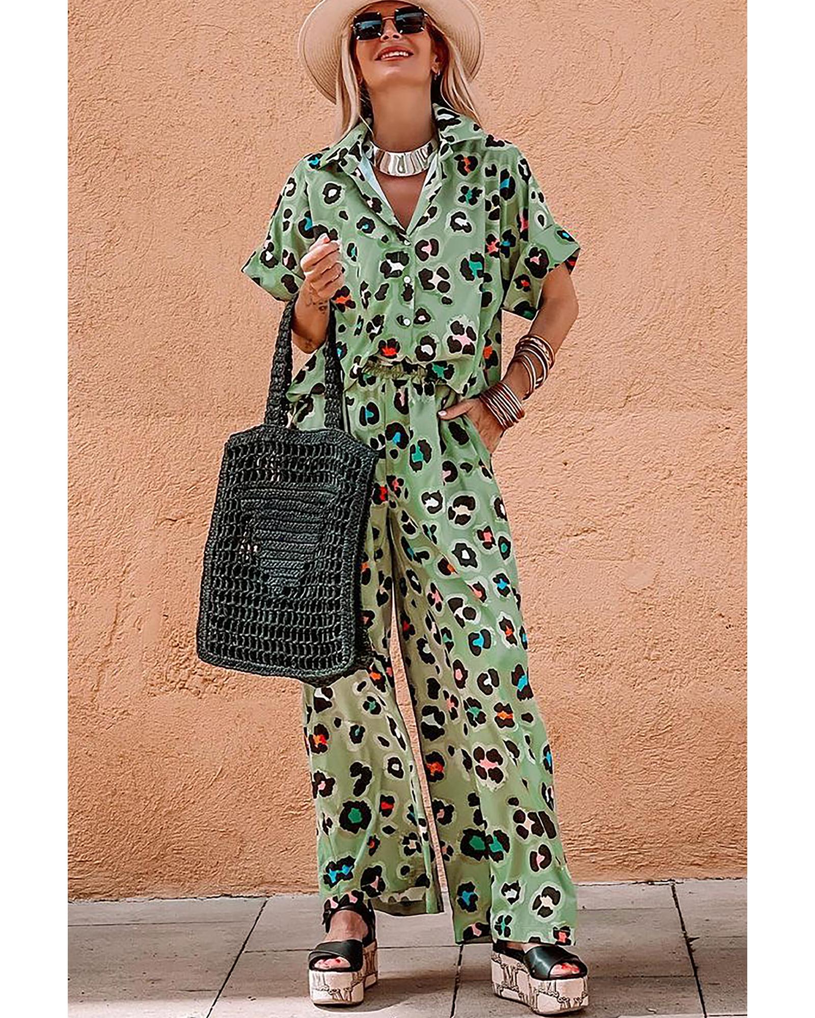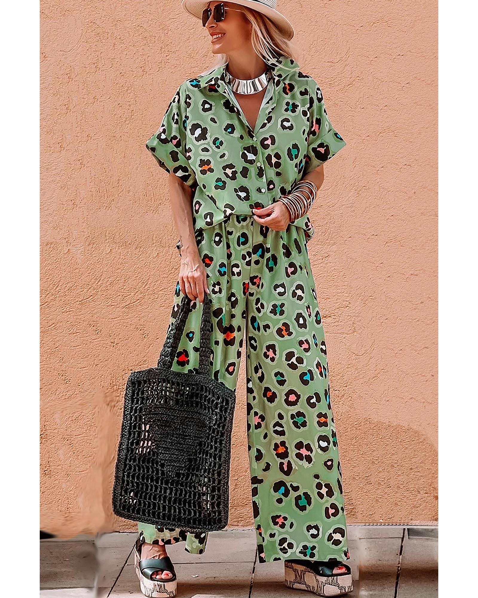 • Green Leopard Print Short Sleeve Shirt and Wide Leg Pants Set