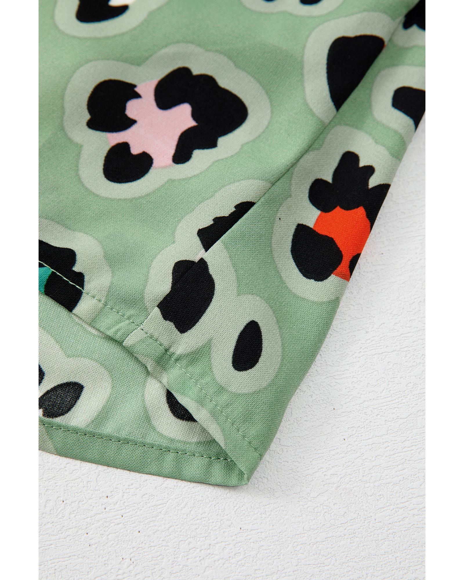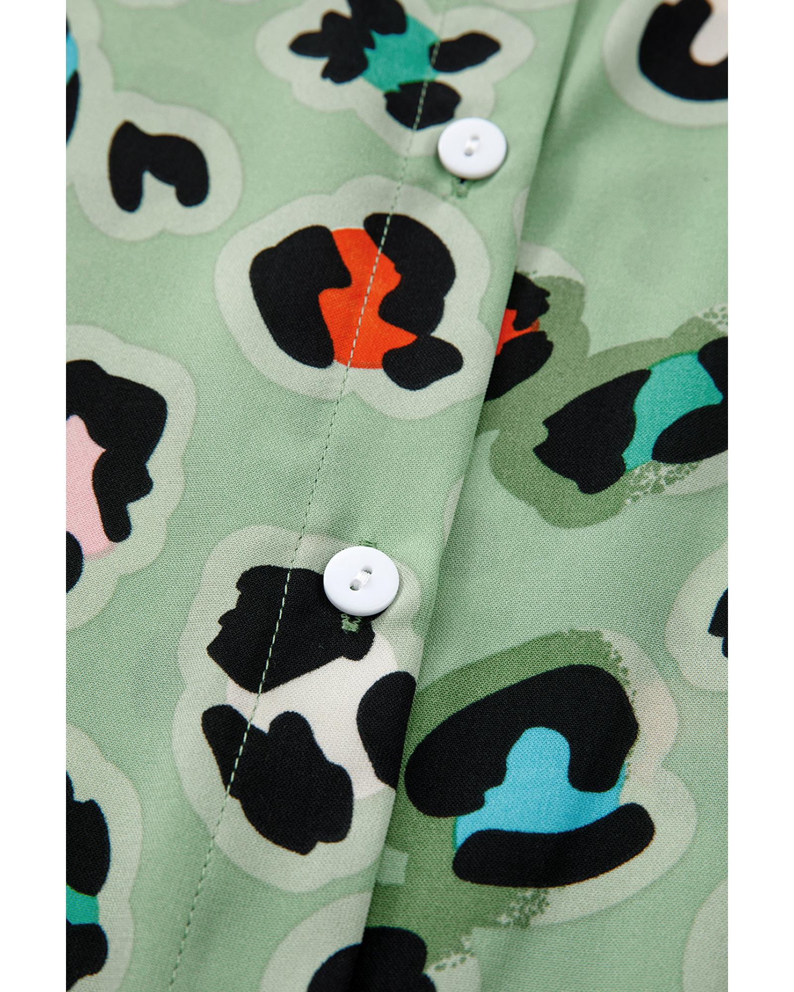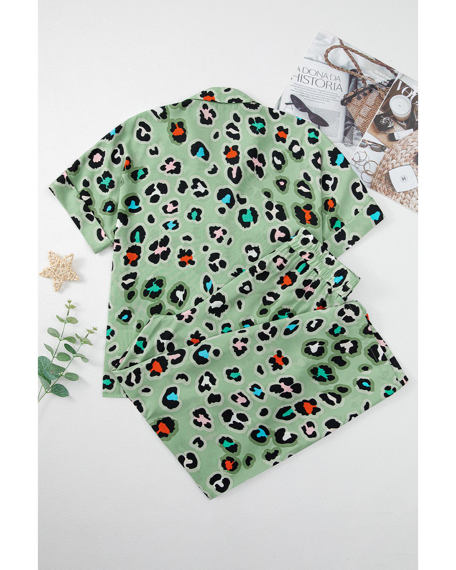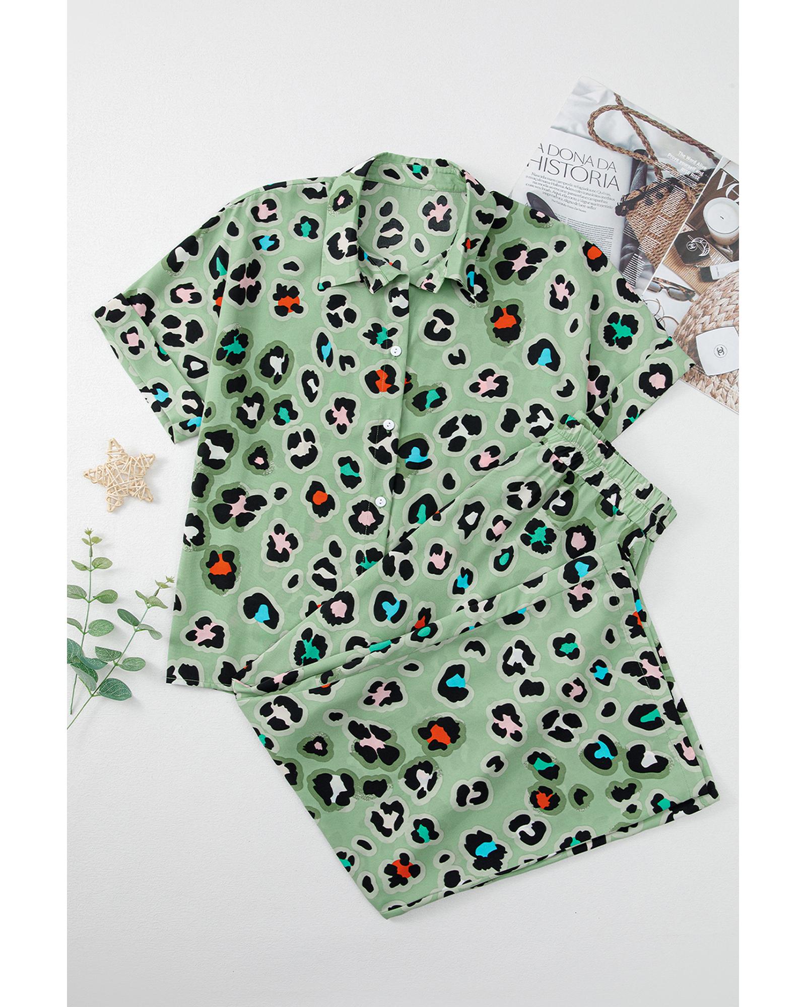• Green Leopard Print Short Sleeve Shirt and Wide Leg Pants Set