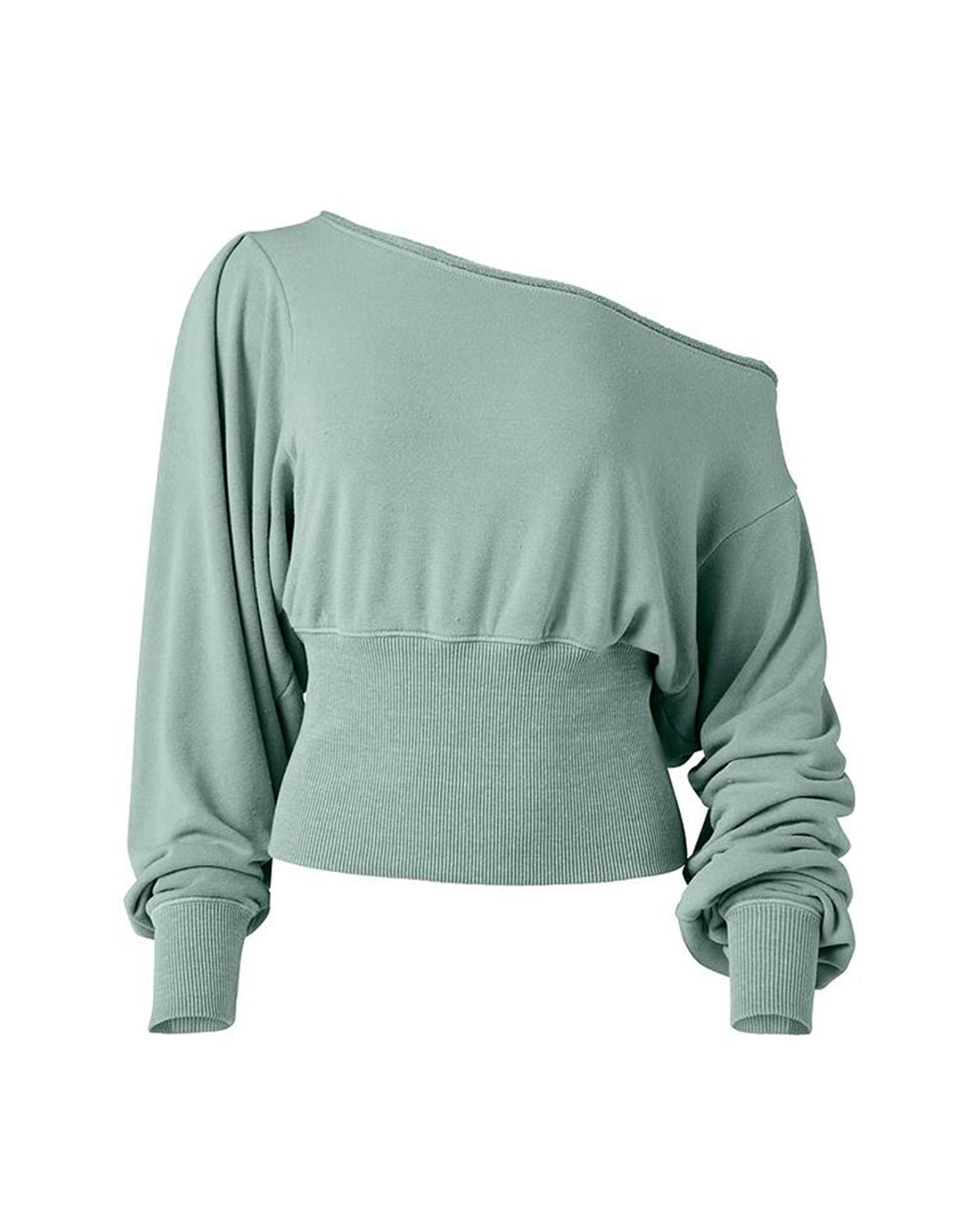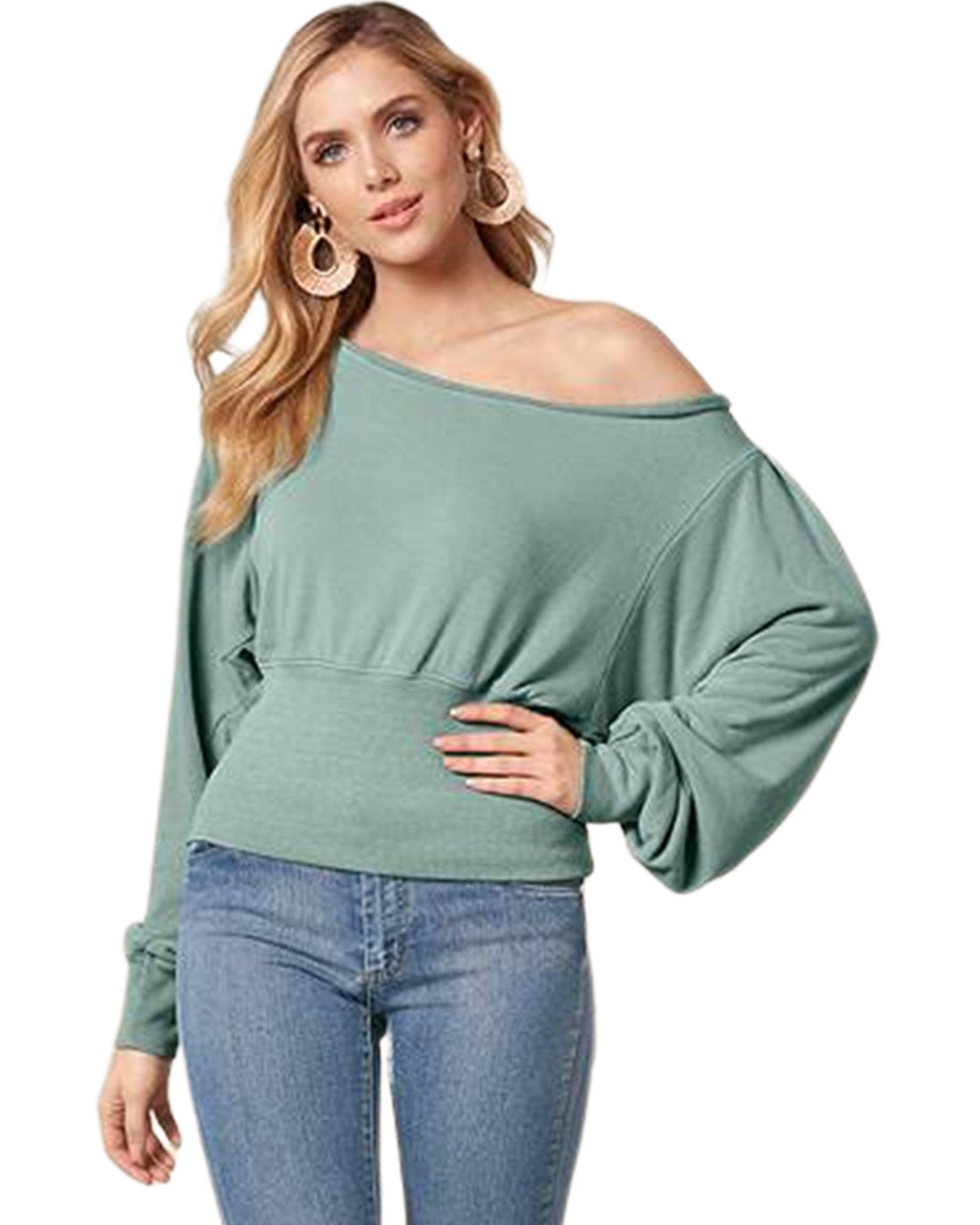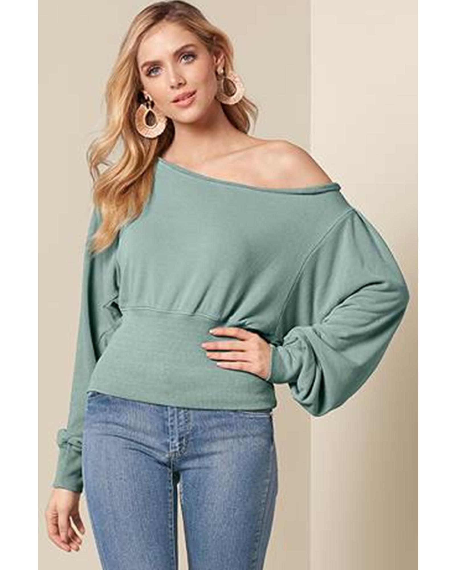 - Green Off Shoulder Bishop Sleeve Cinched Waist Blouse