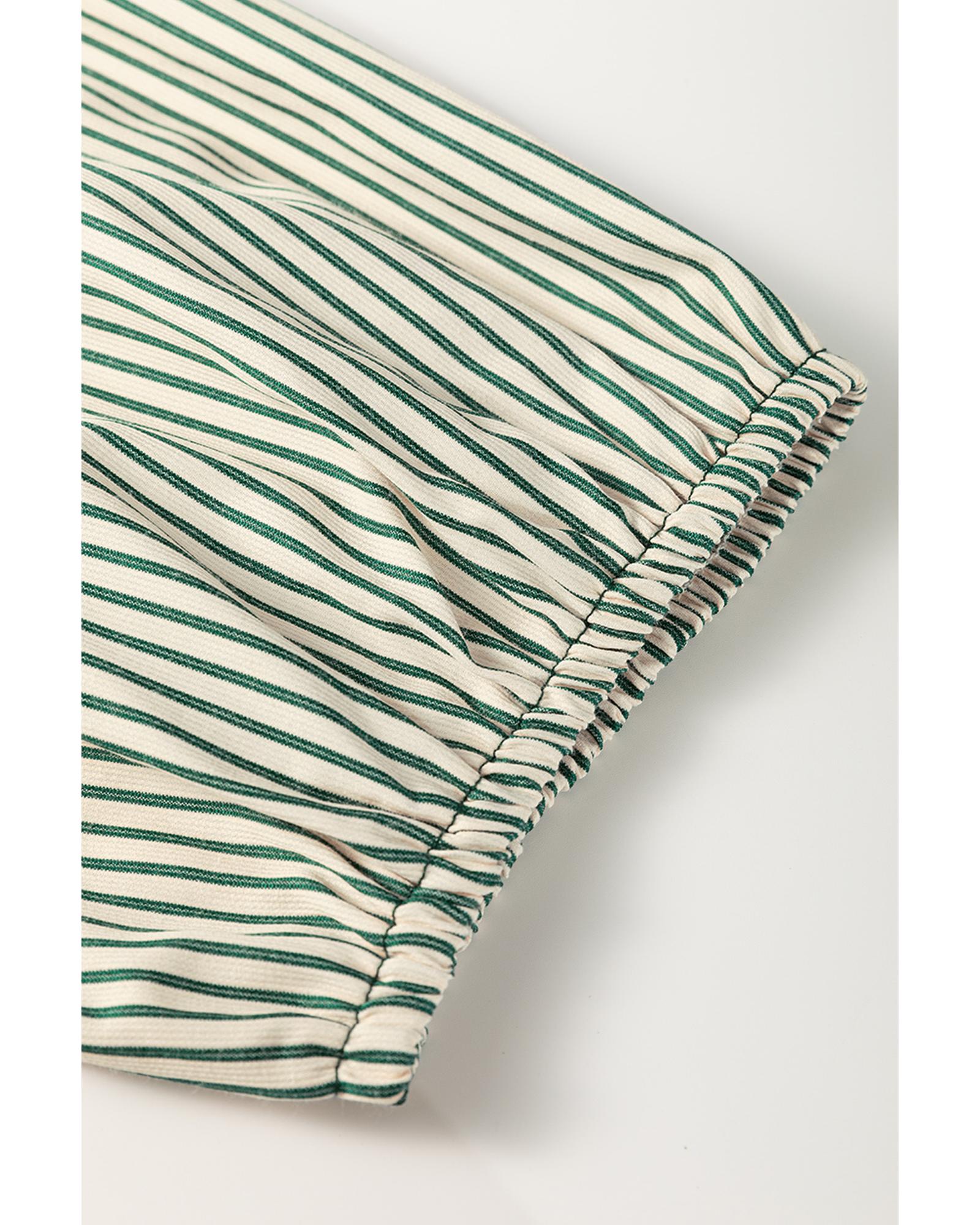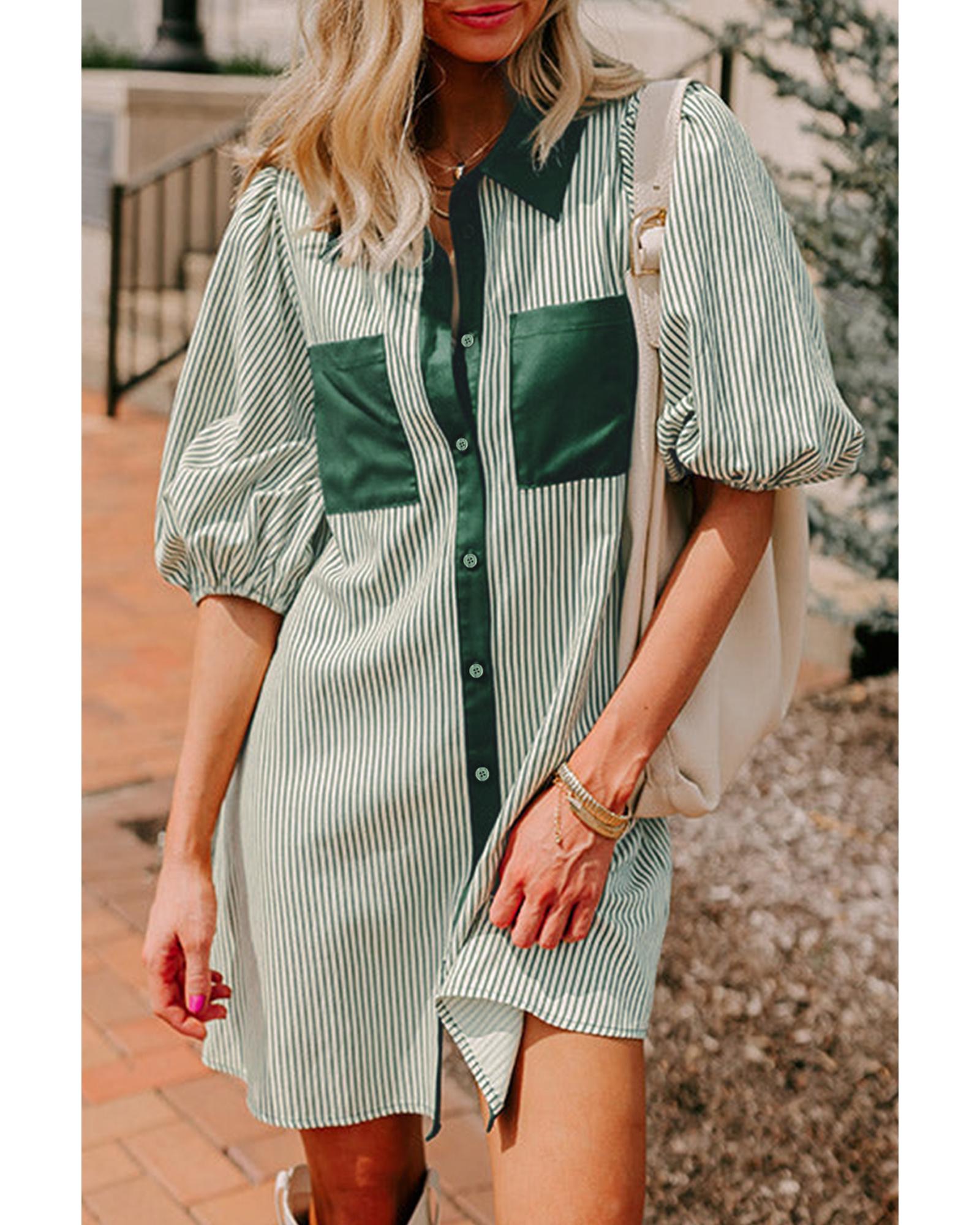 • Green Patch Pockets Button Down Short Puff Sleeve Dress