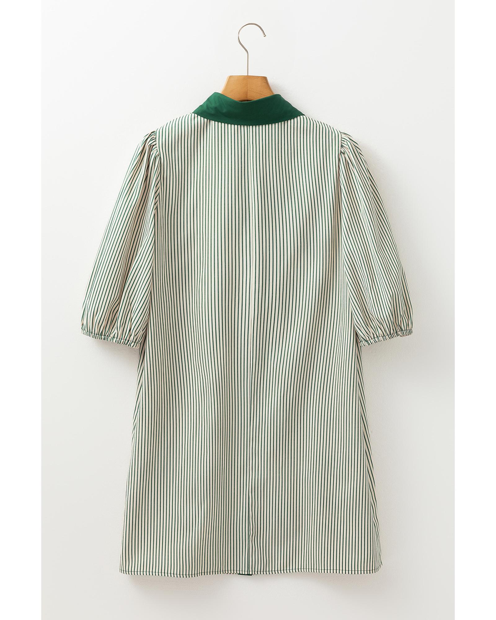 • Green Patch Pockets Button Down Short Puff Sleeve Dress