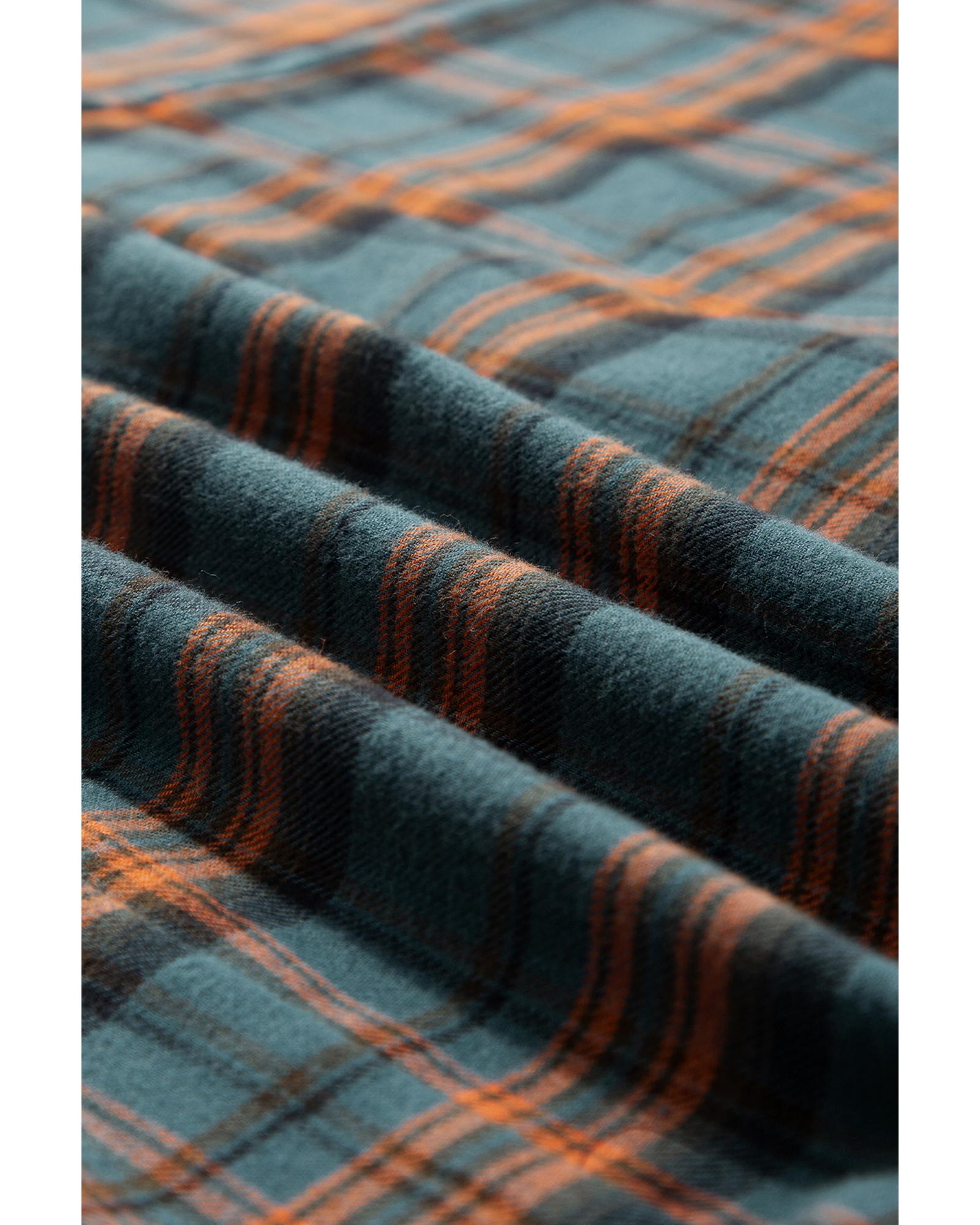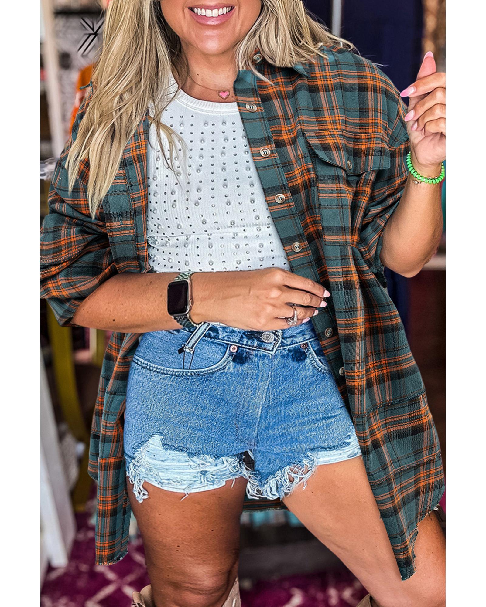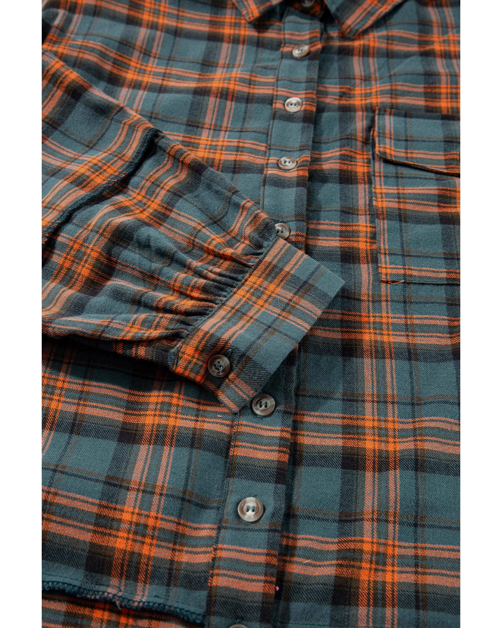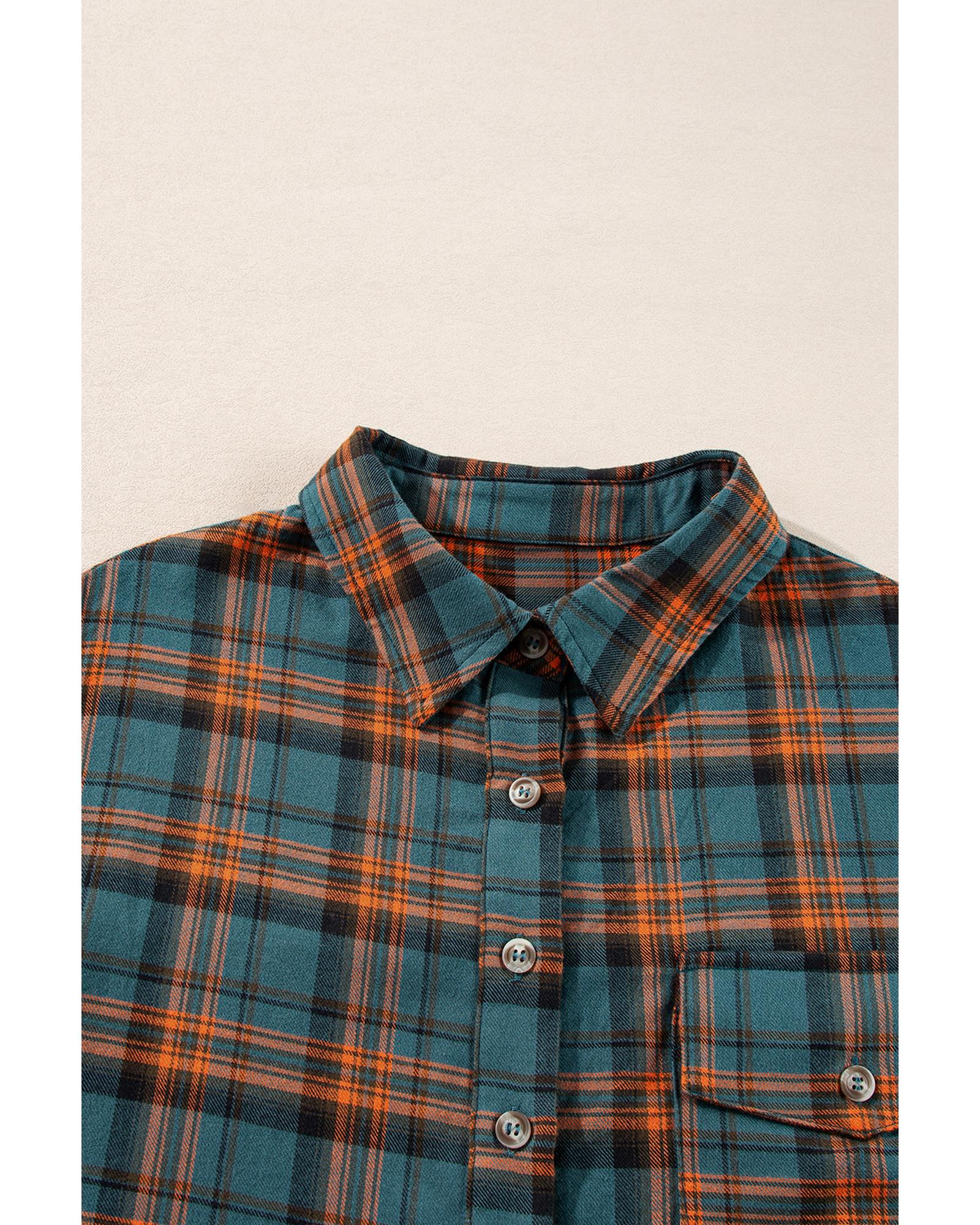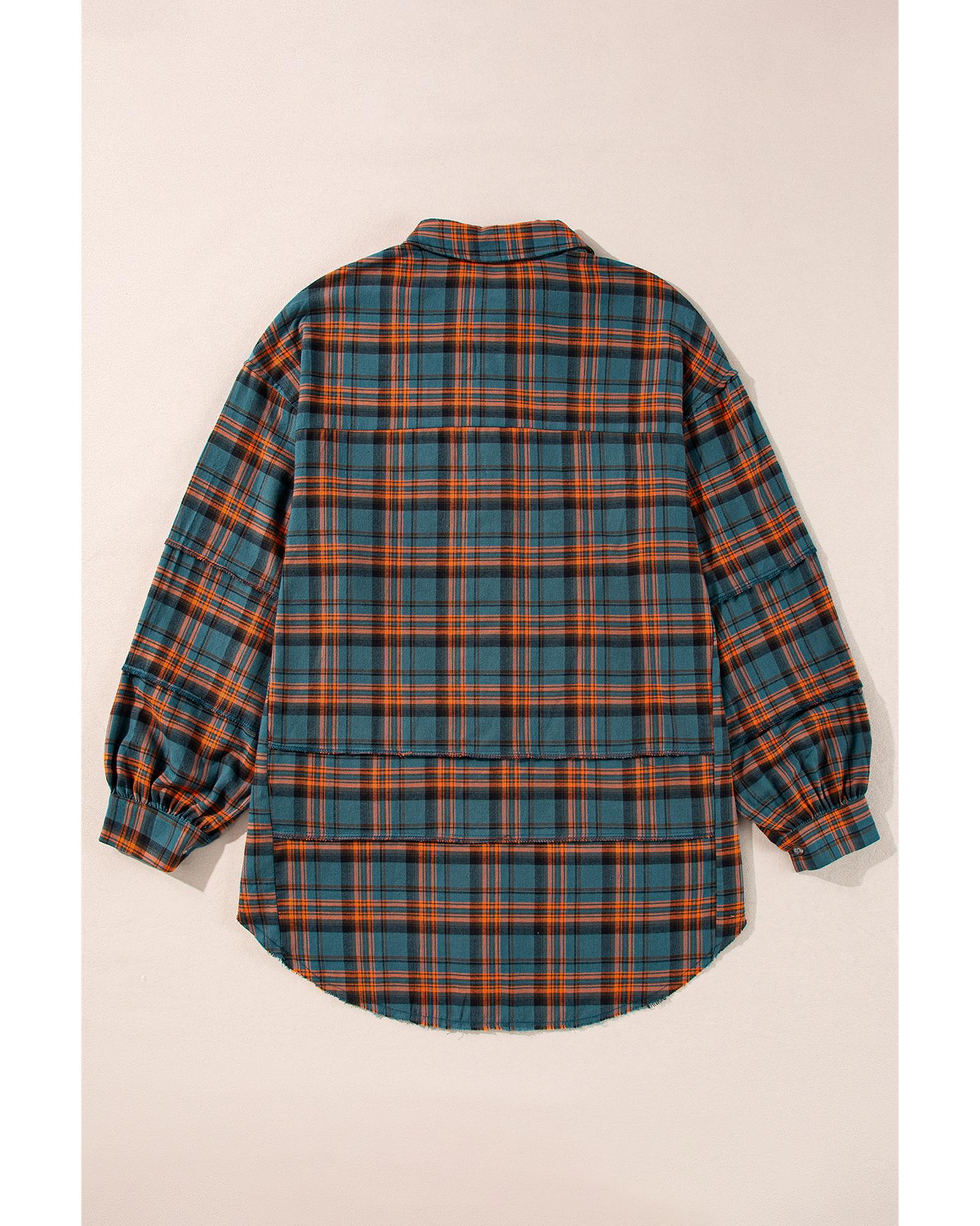 Green Plaid Long Sleeeve Side Split Distressed Hem Shirt – M
