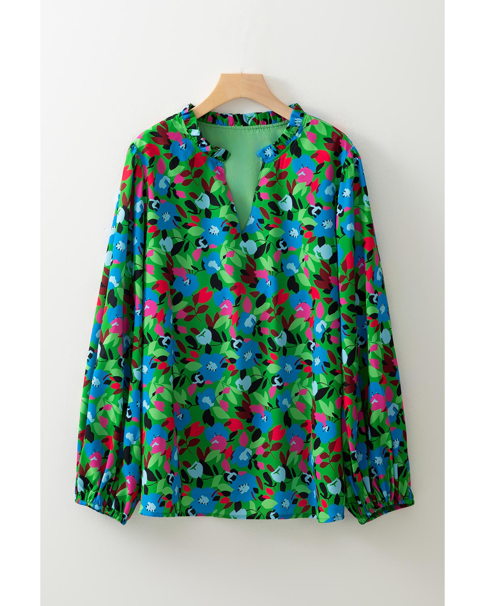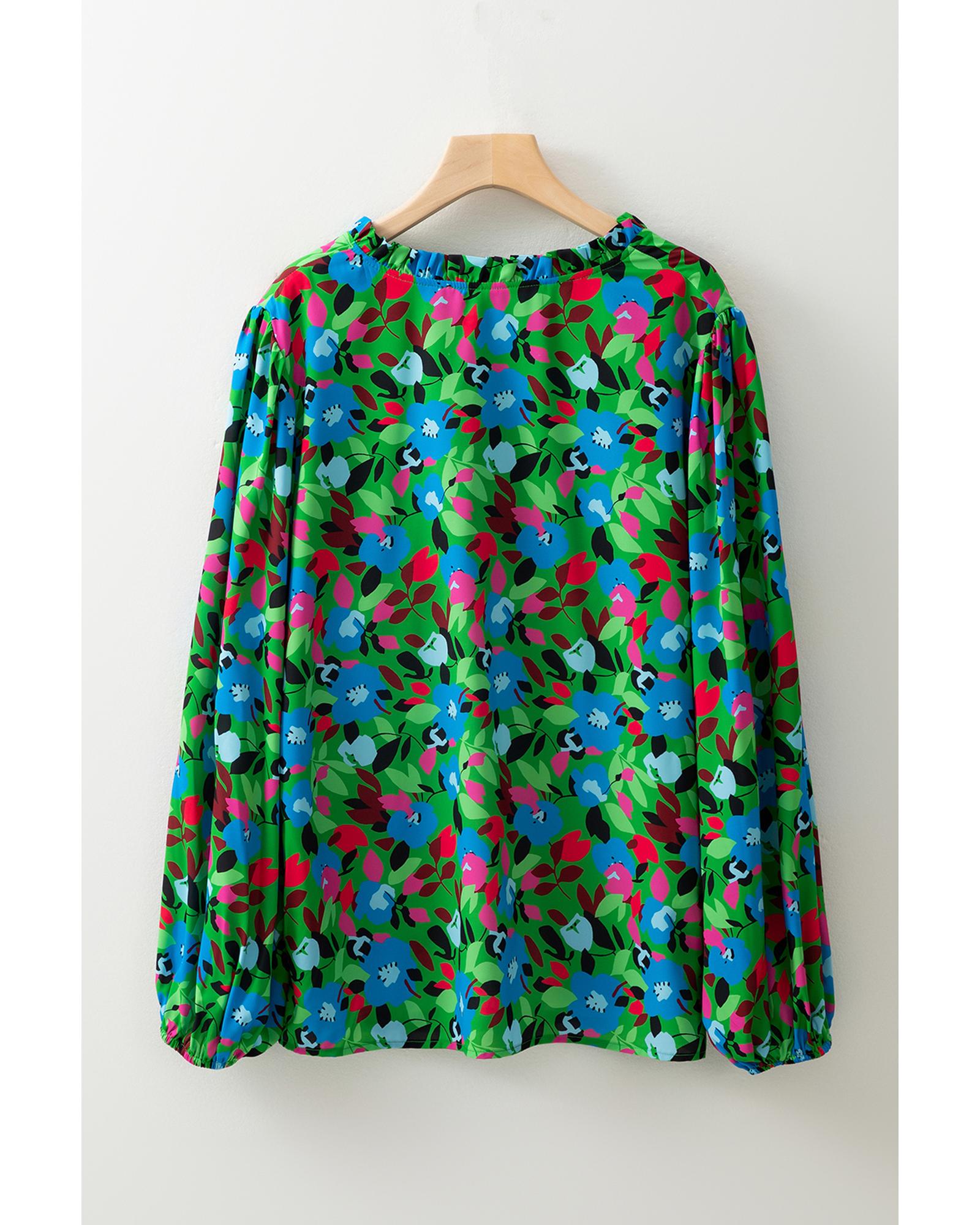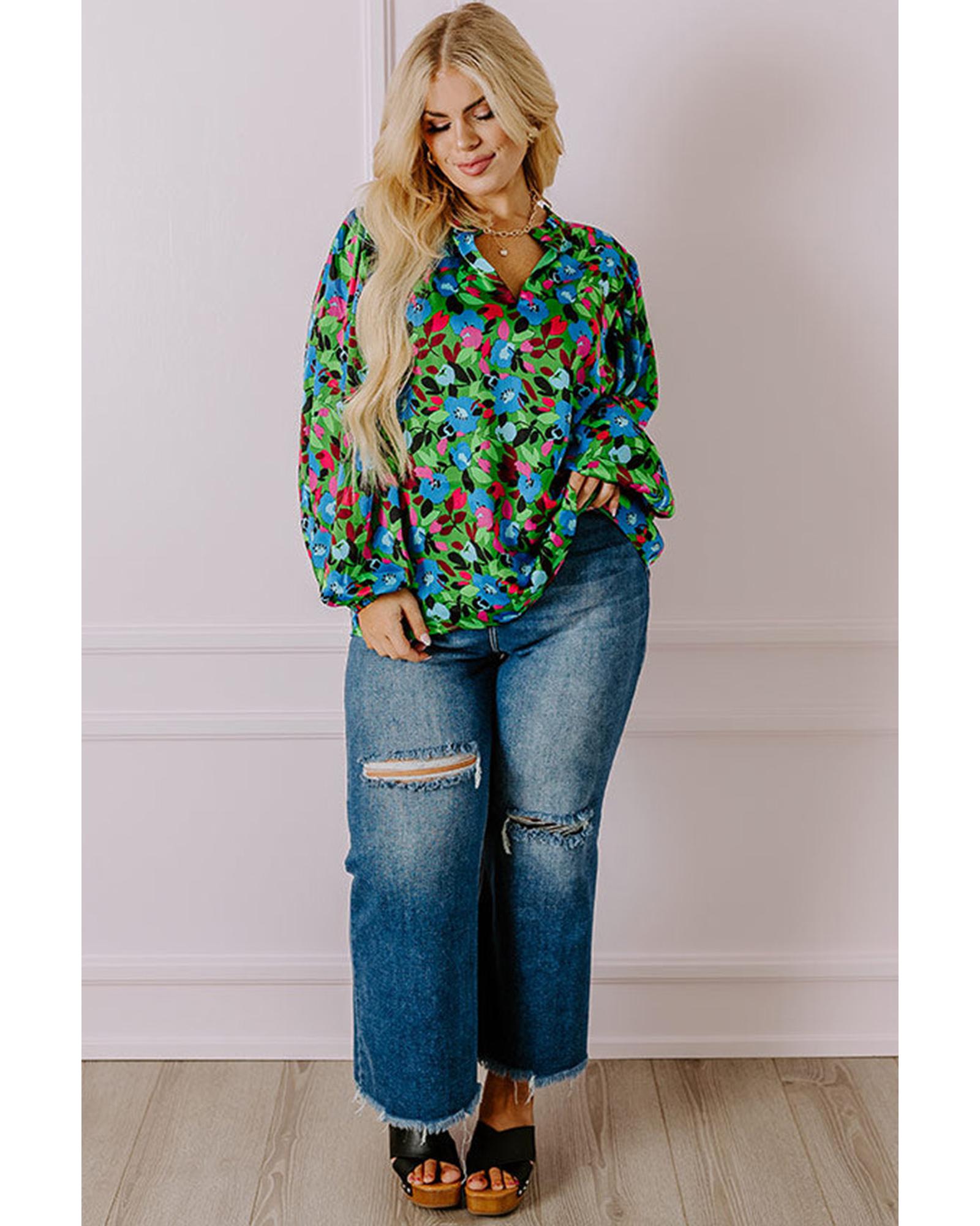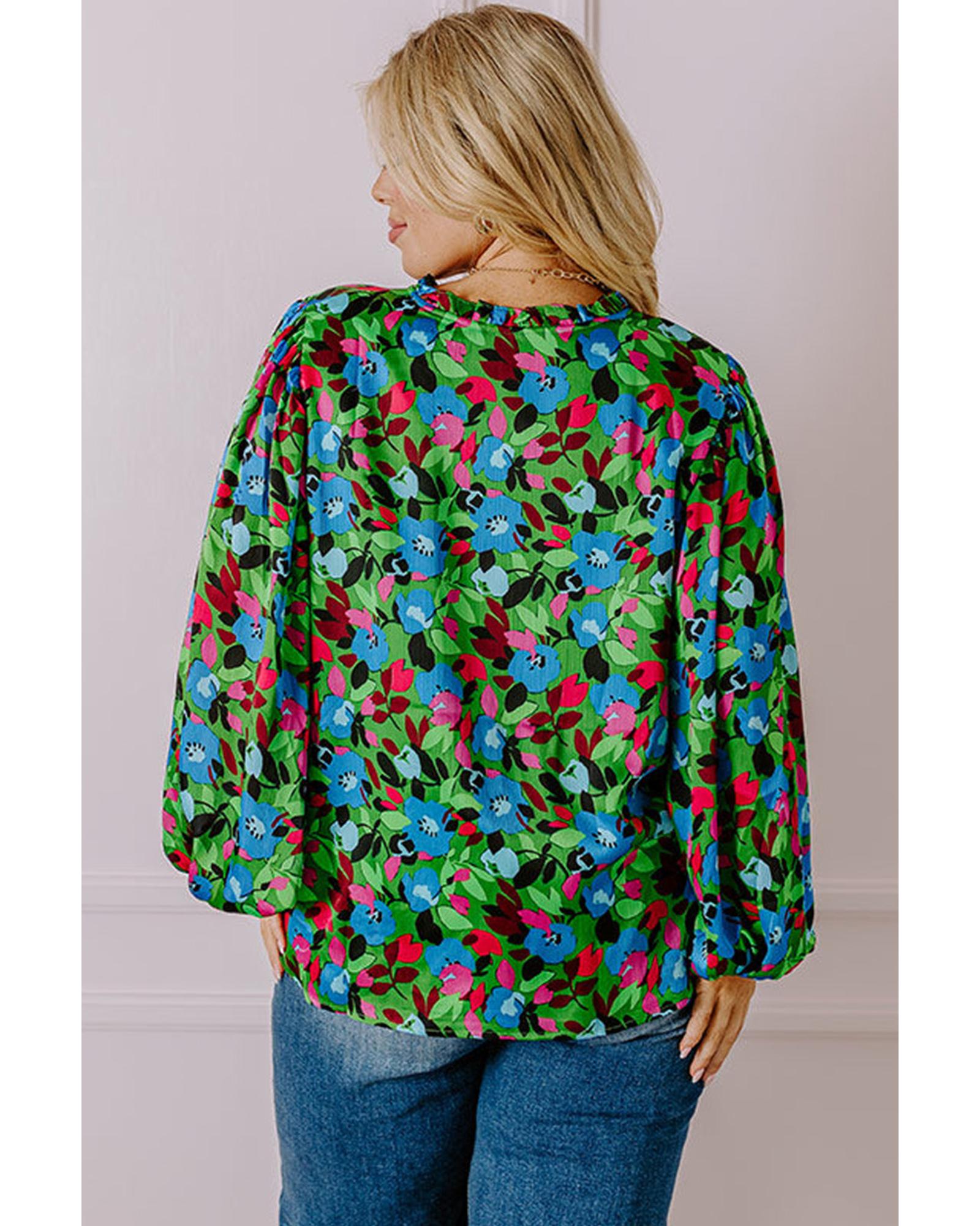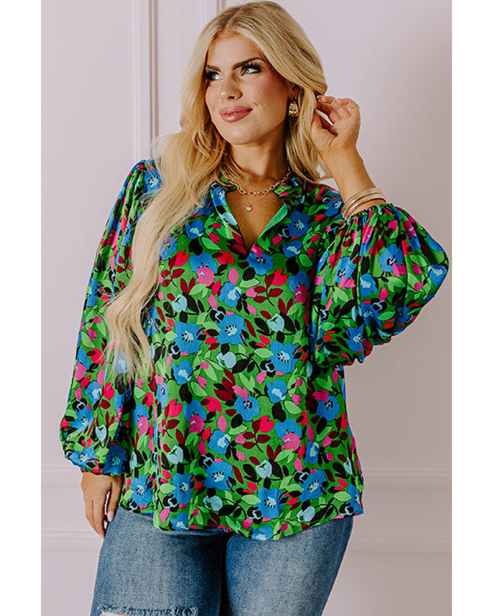 Green Plus Size Floral Bubble Sleeve V Neck Blouse – 1X
