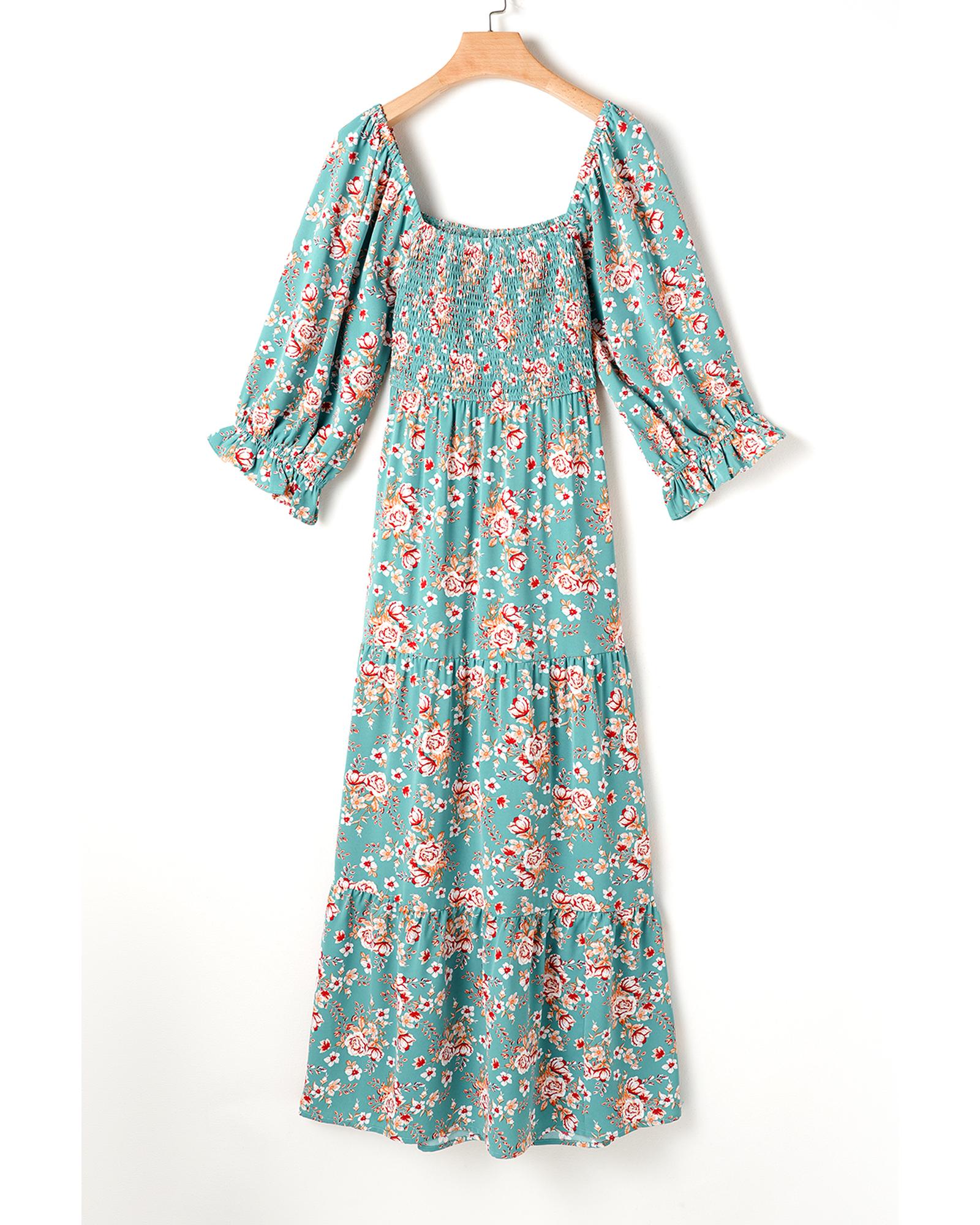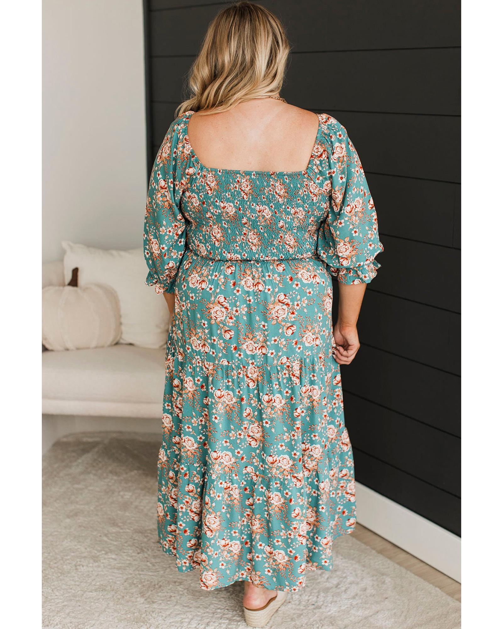 • Green Plus Size Floral Print Square Neck Smocked Maxi Dress